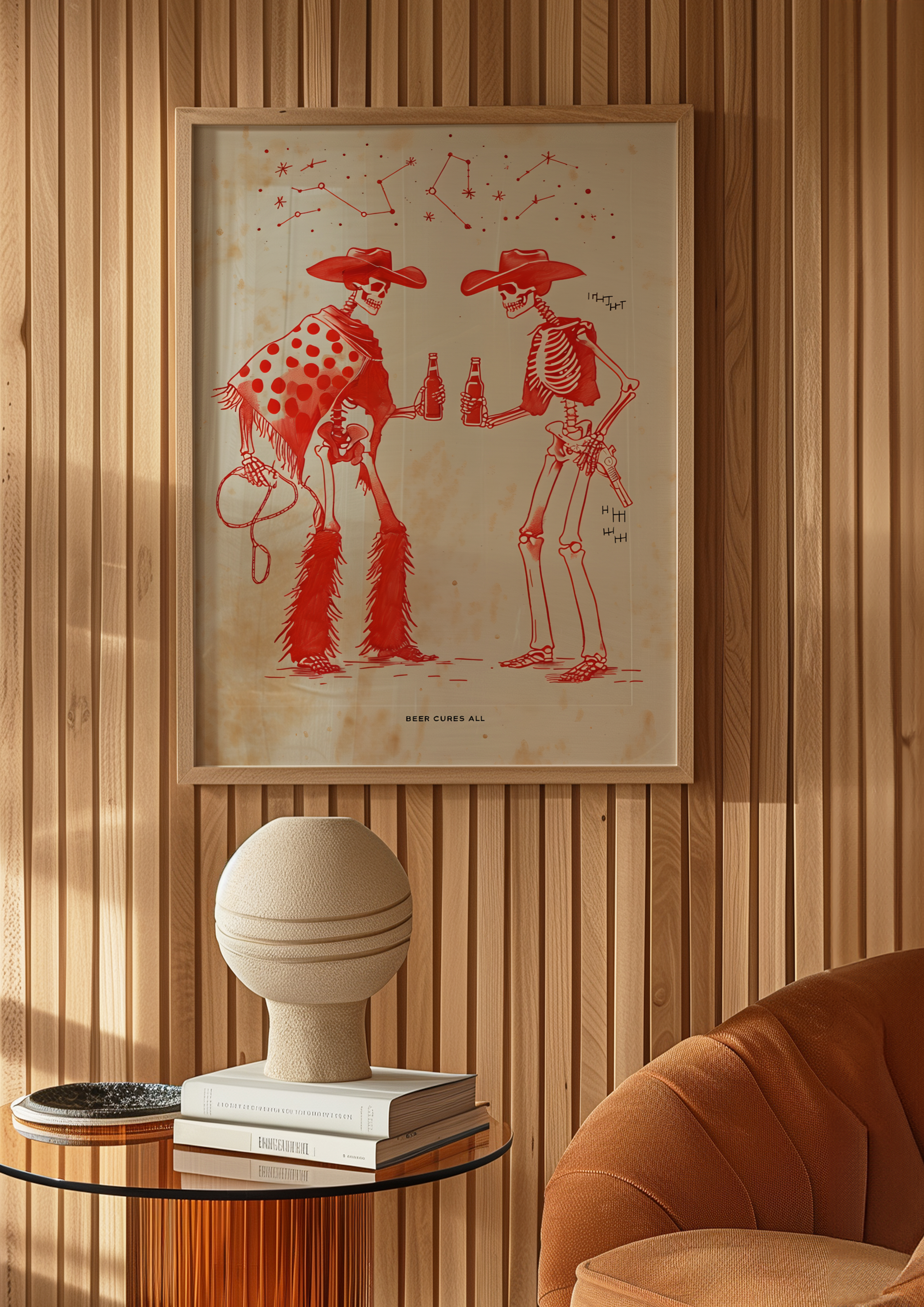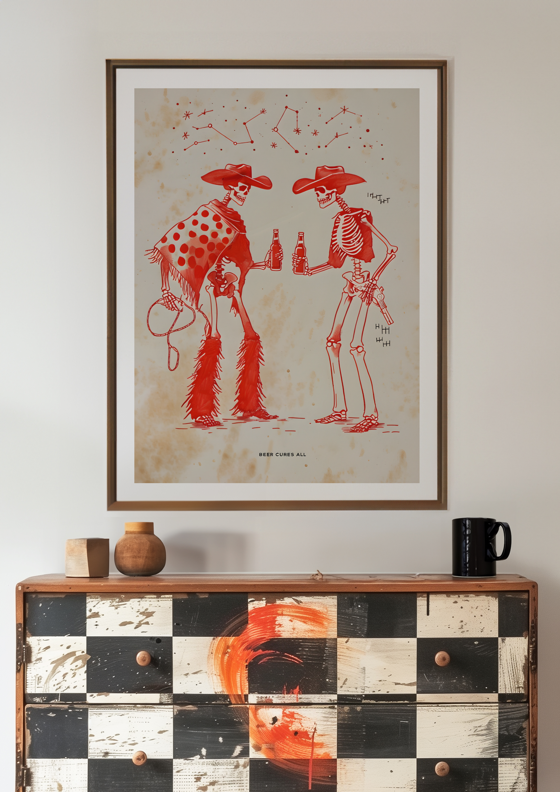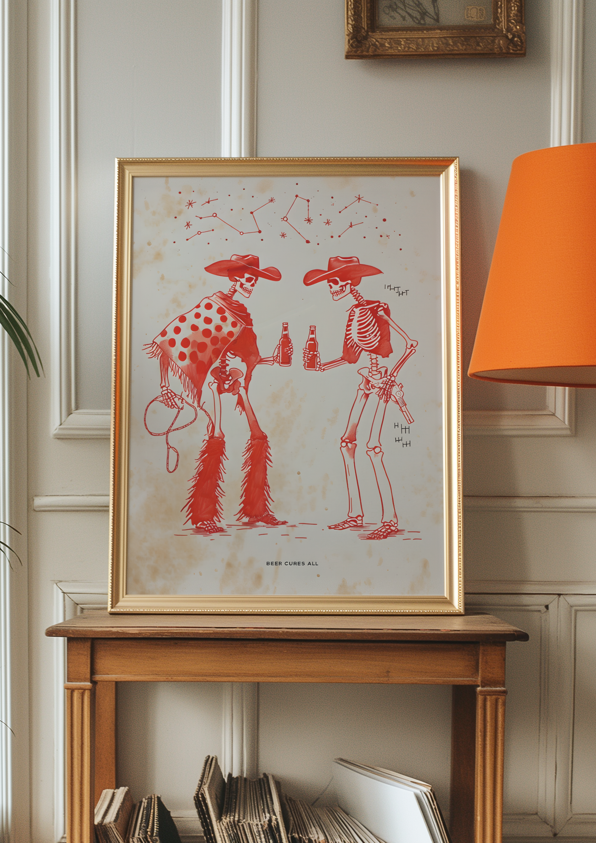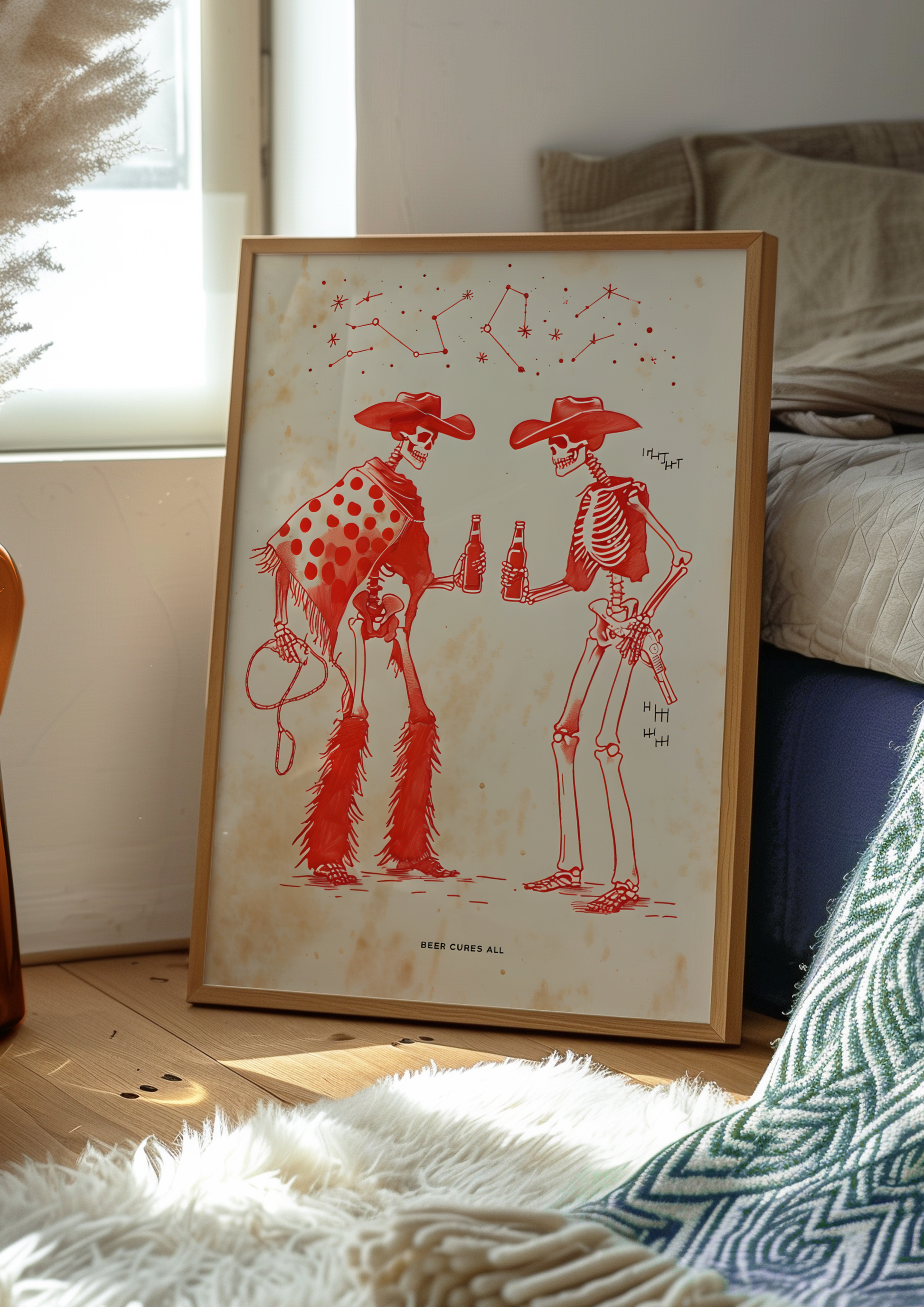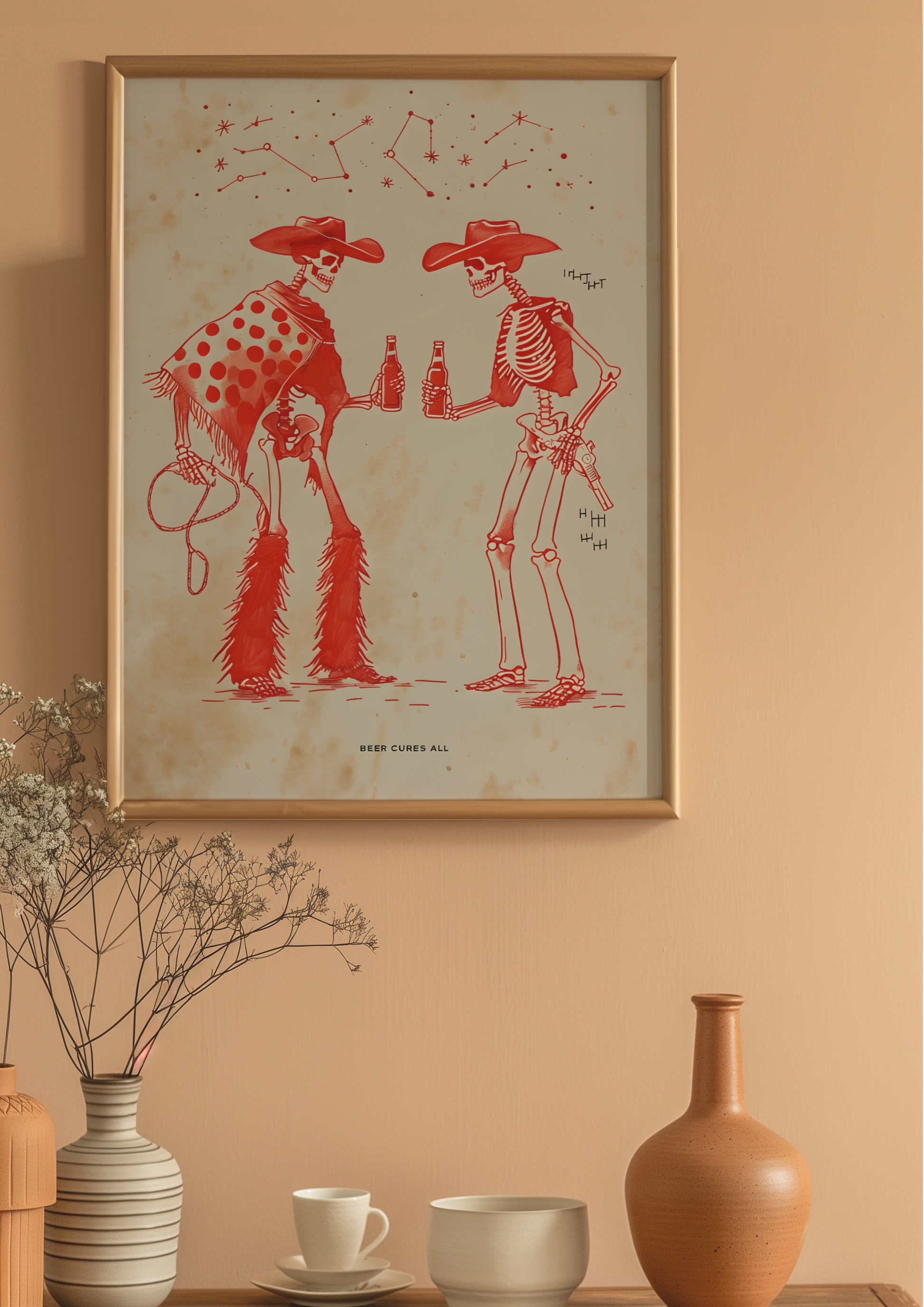 Ride into the afterlife with our "Beer Cures All" poster, where two skeleton cowboys kick back and share a cold one under the desert sky. With dusty boots, weathered bones, and matching grins, this gritty yet playful design blends Old West attitude with a toast to the good times, even if you're long gone.
