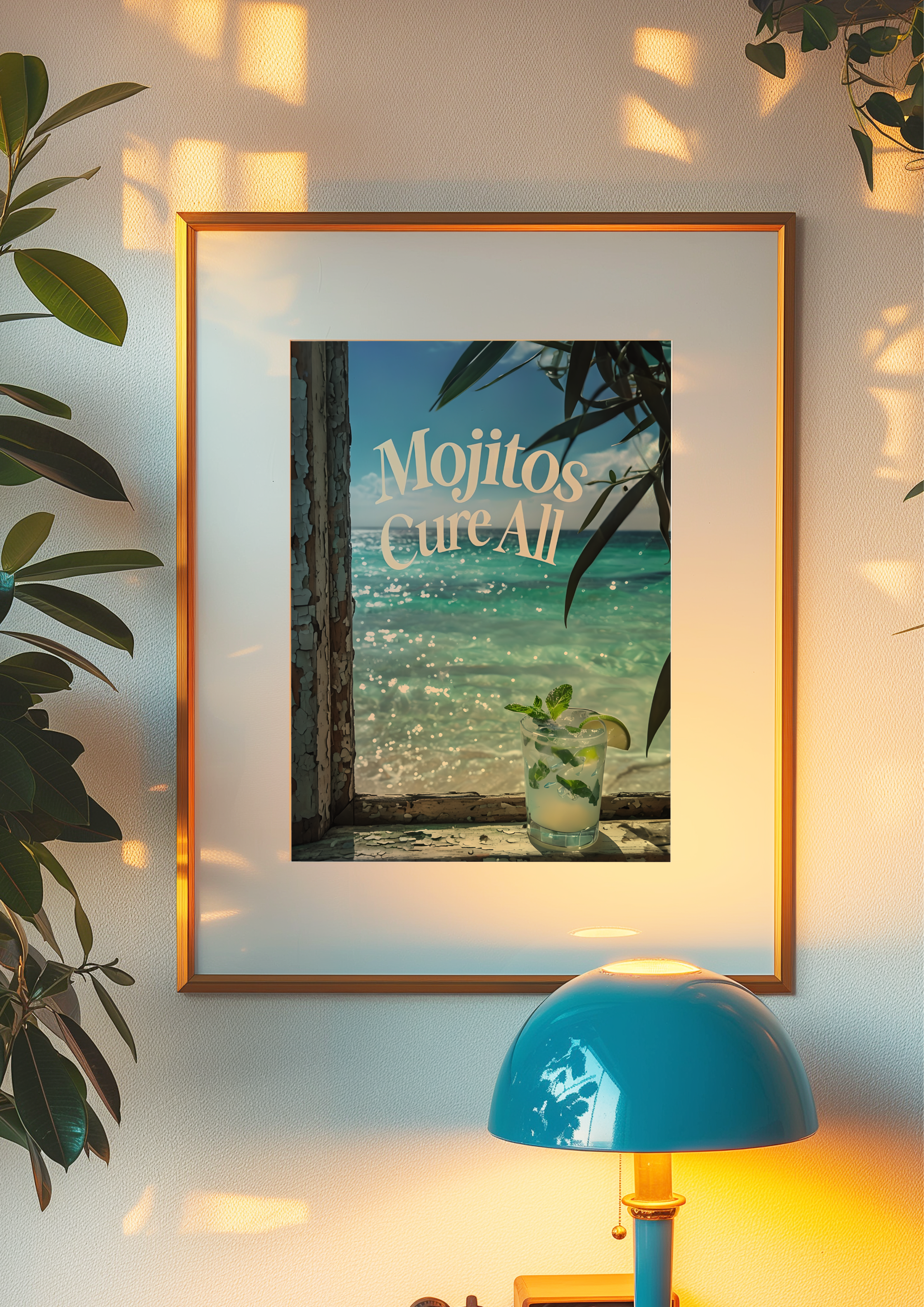 Cool, crisp, and full of coastal charm — our "Mojitos Cure All" poster brings island vibes straight to your wall. Featuring a perfectly muddled mojito resting beside the beach, with lime slices, mint leaves, and sunlight dancing off the glass, this artwork captures the essence of effortless relaxation and summer simplicity.