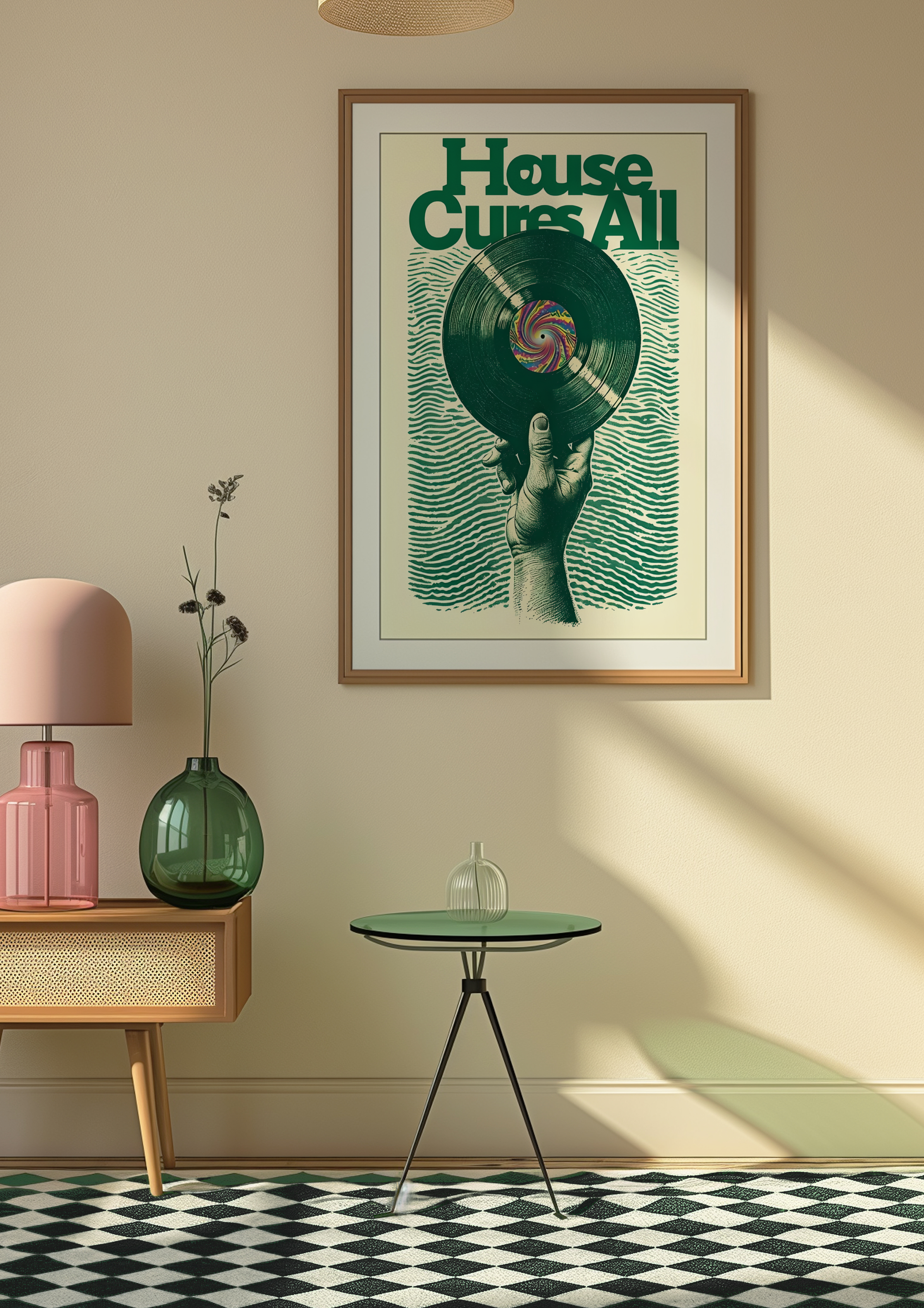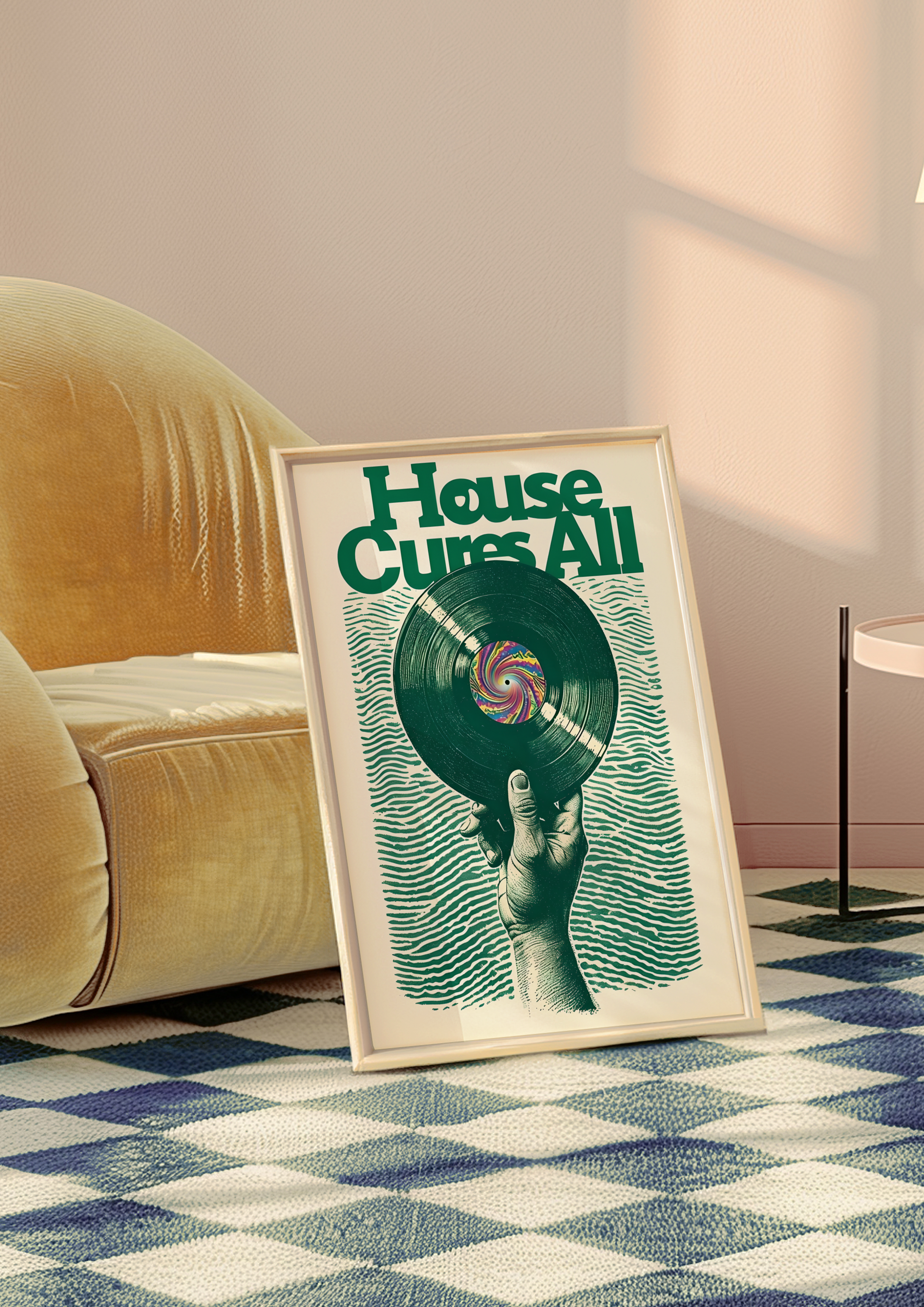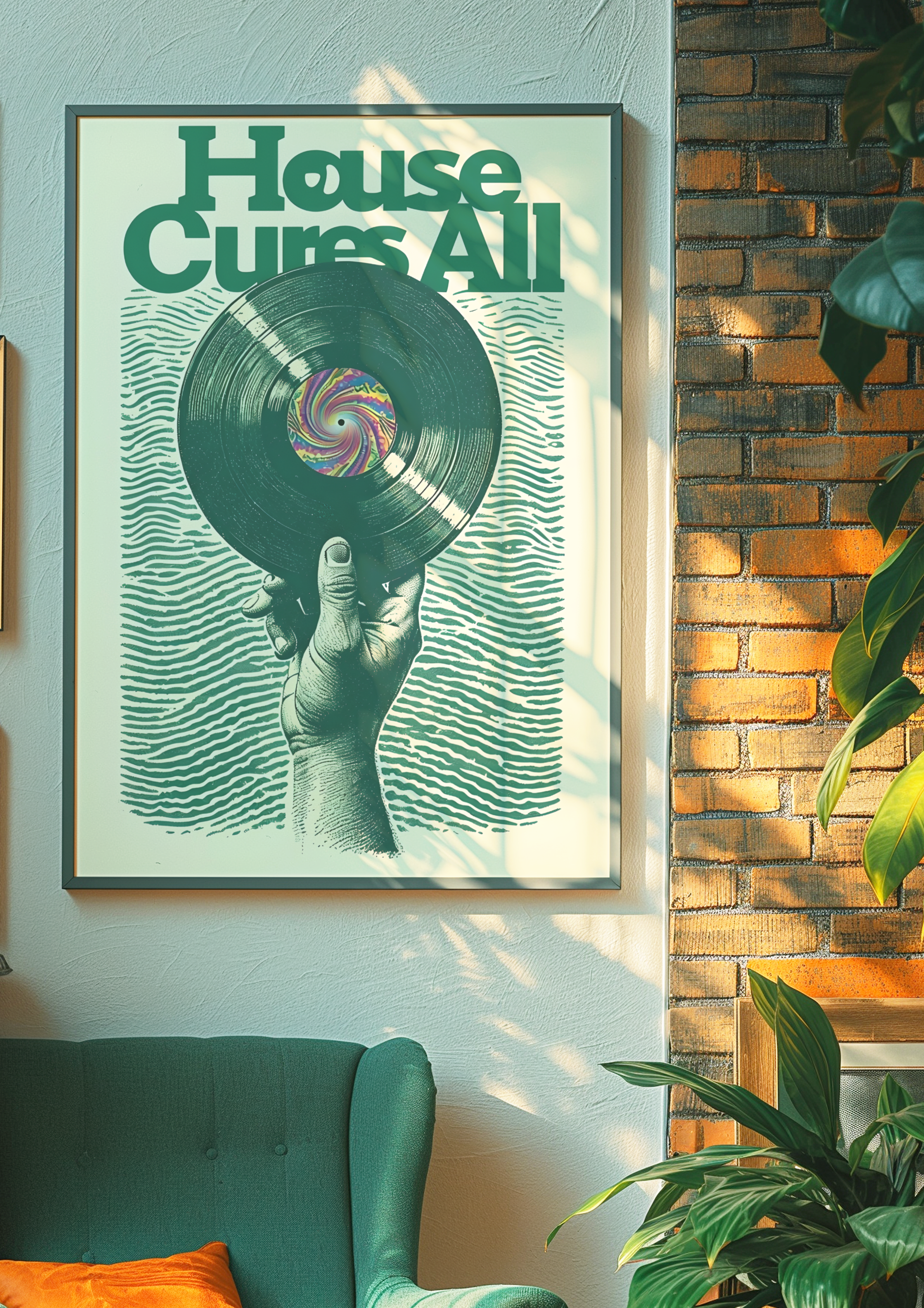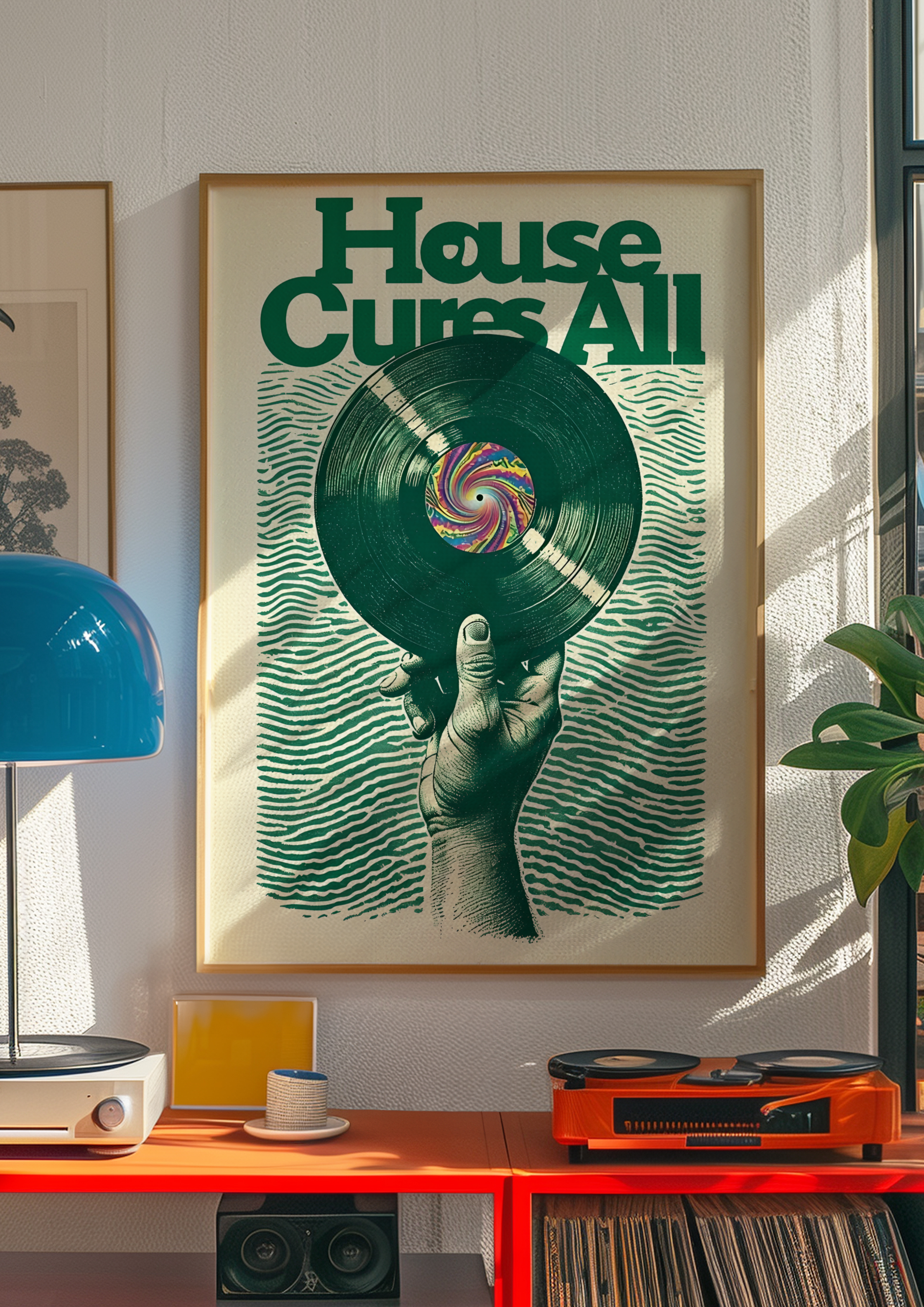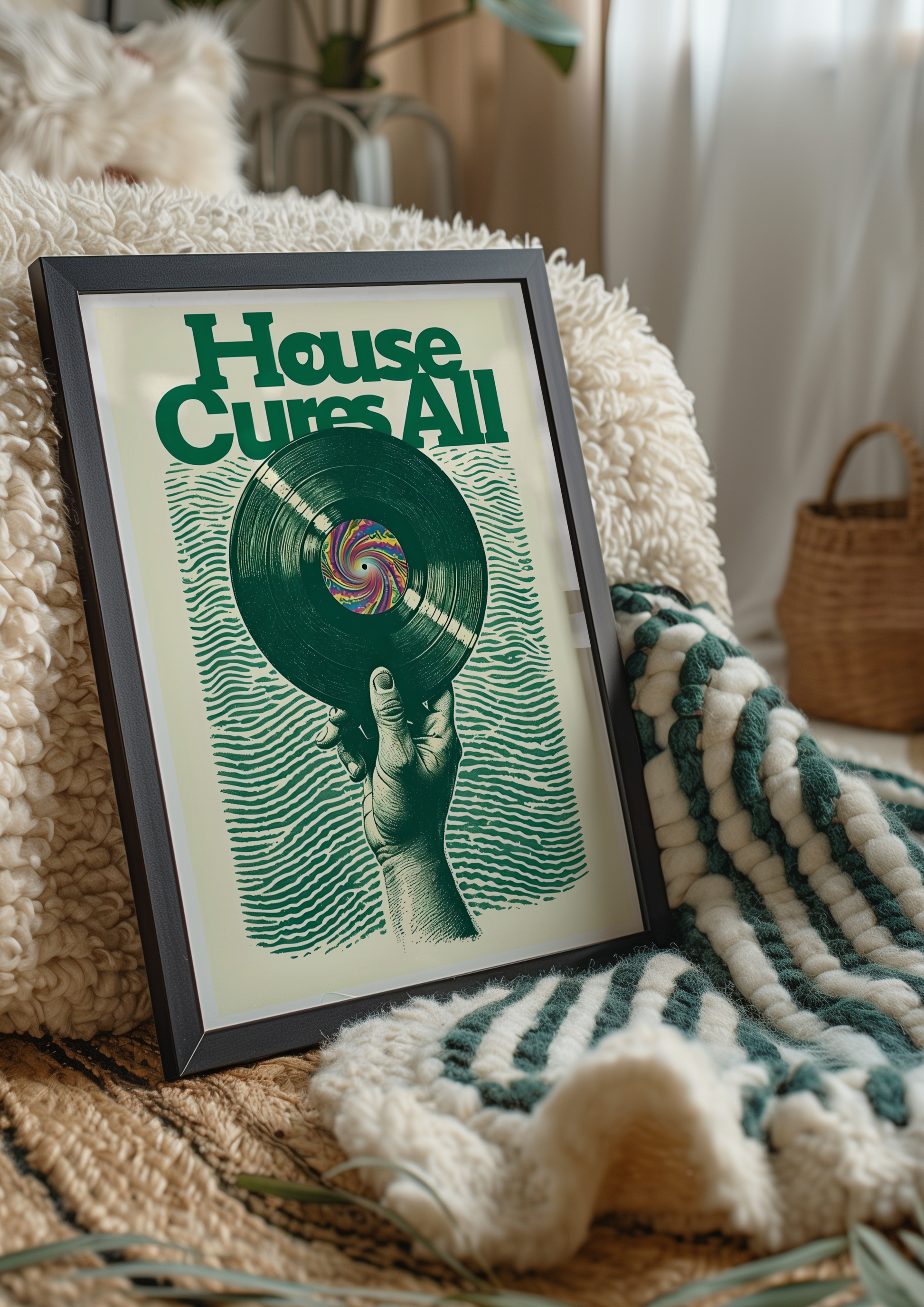 Drop the needle and drift into the groove with our "House Cures All" poster — a mind-bending celebration of sound and soul. Featuring a stylized hand holding a vinyl record with a hypnotic swirl at its center, this artwork channels the pulse of underground beats and late-night frequencies. With bold lines, psychedelic vibes, and a nod to vinyl culture, it’s a must-have for any true house head.