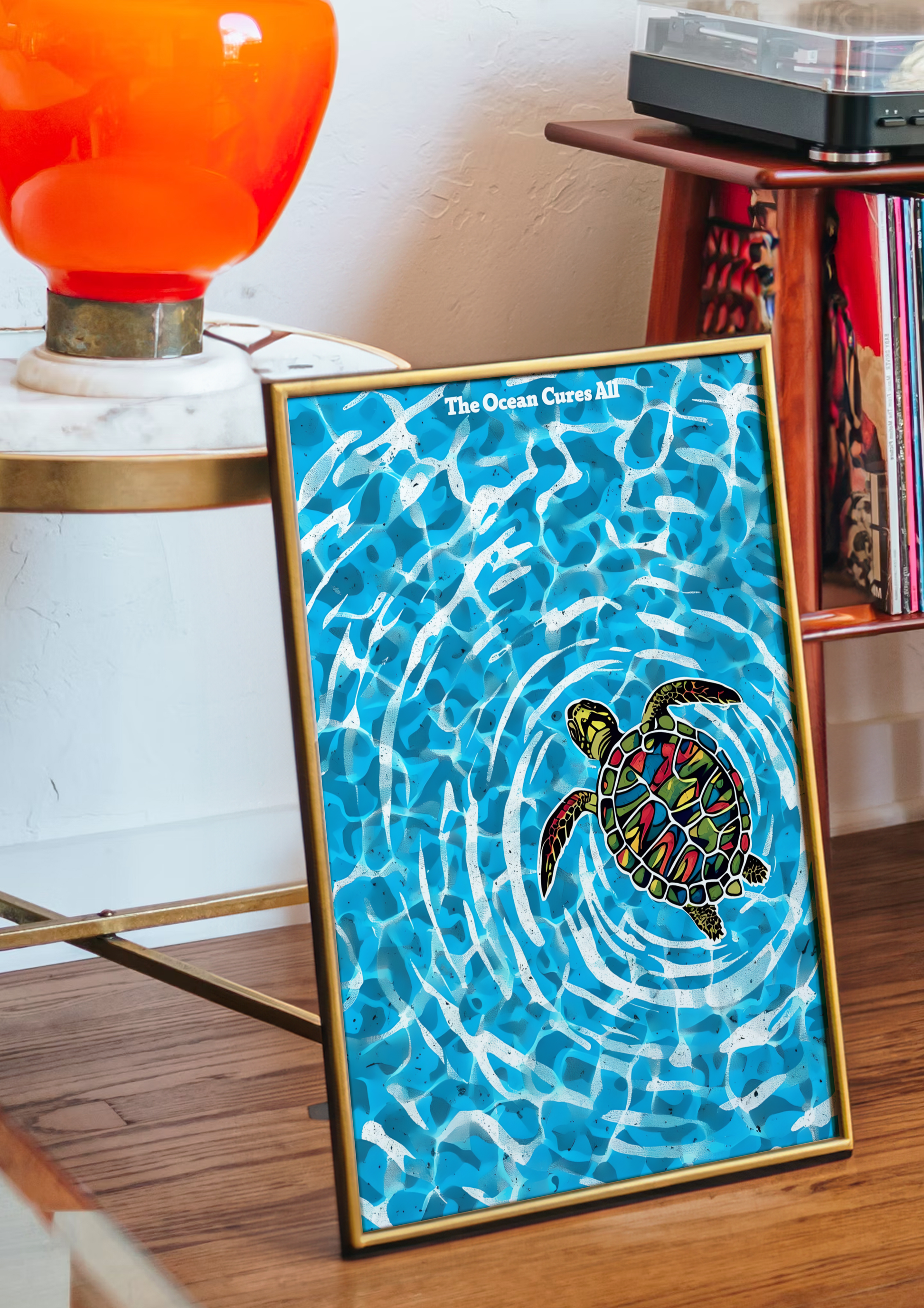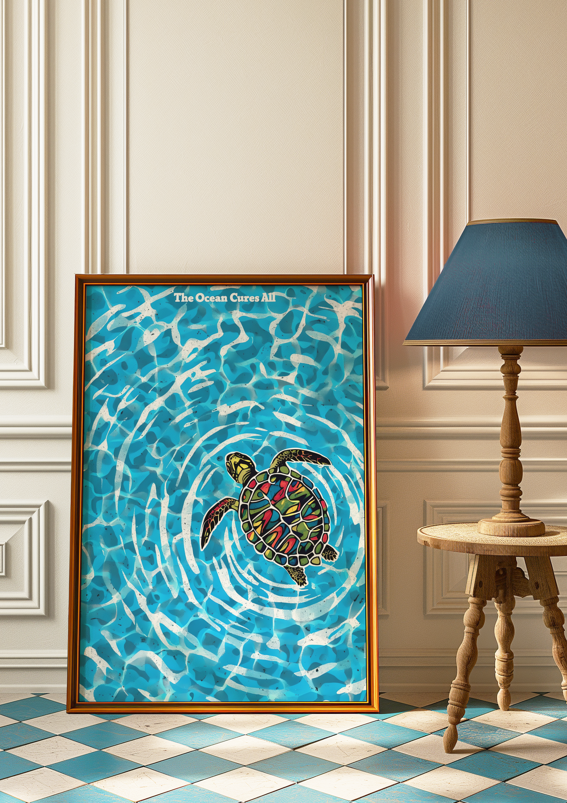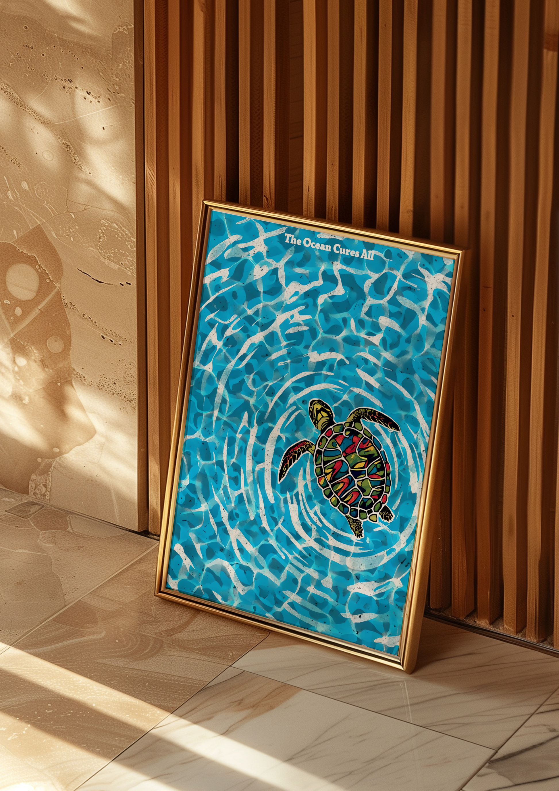 Playful, pure, and full of life — our "The Ocean Cures All" poster features a baby sea turtle gliding through the ocean's crystal-clear blue depths. Surrounded by light beams and the gentle sway of water, this vibrant scene captures the innocence and magic of new beginnings beneath the waves.