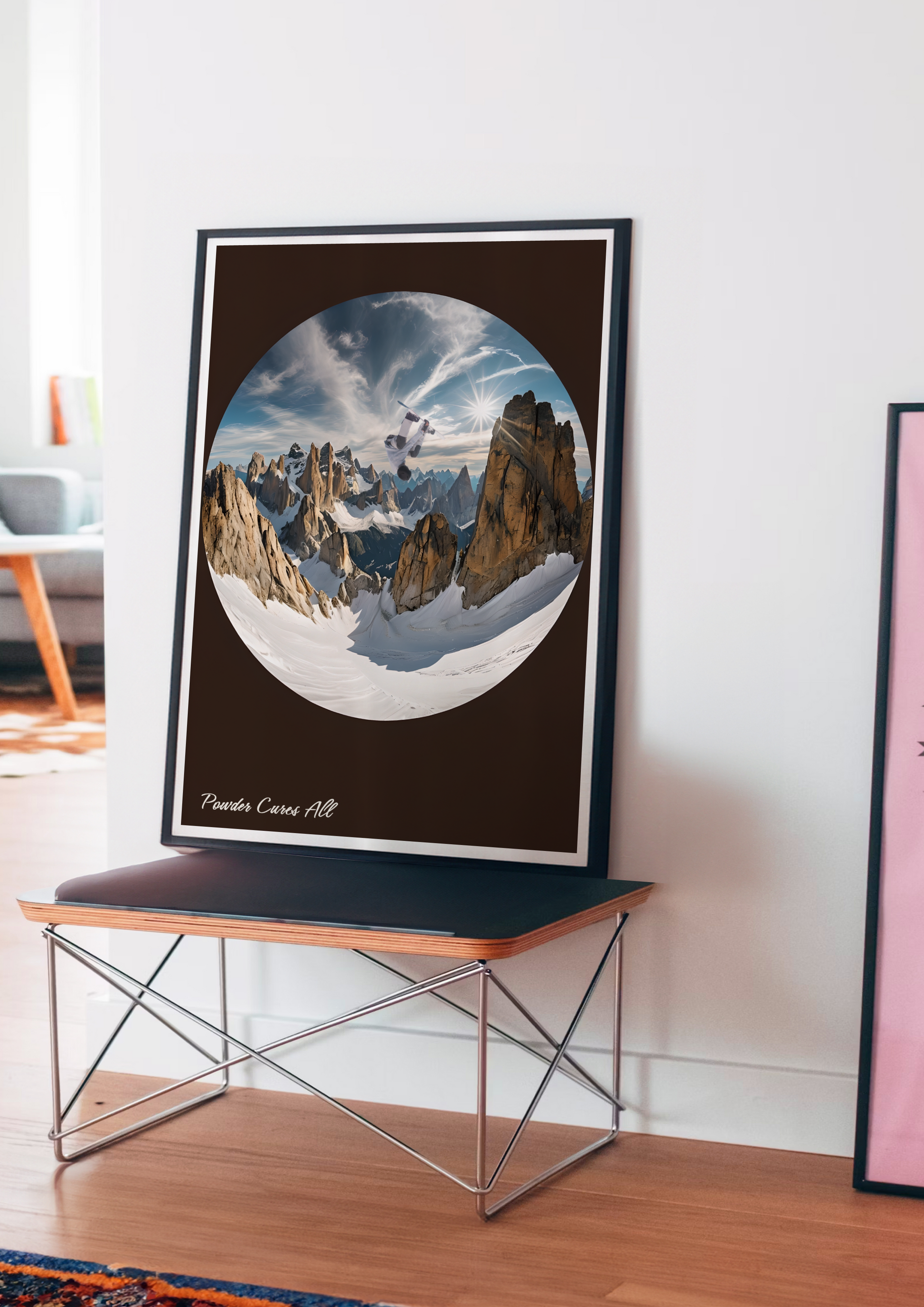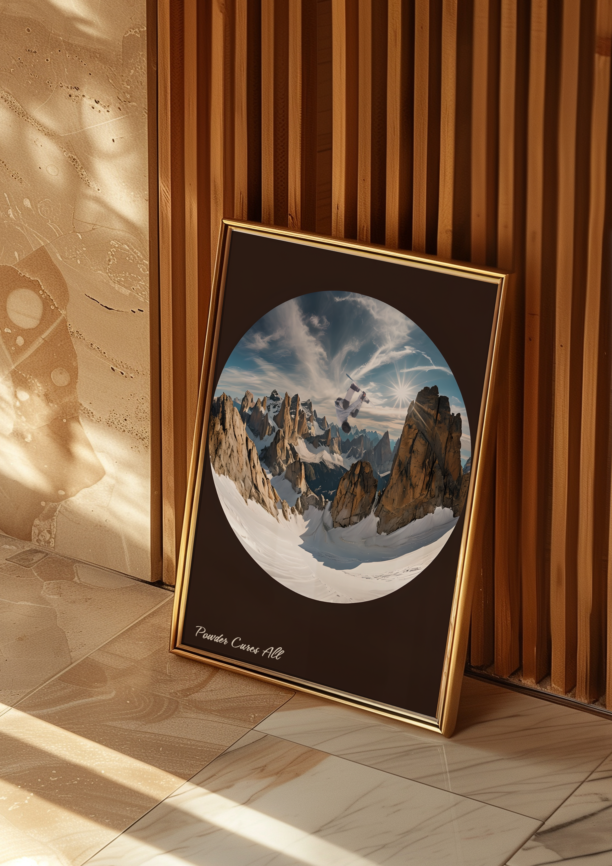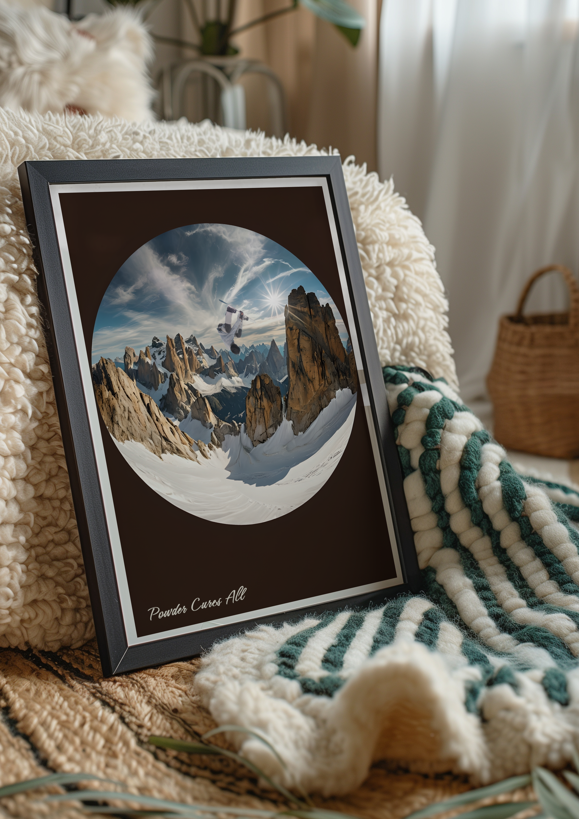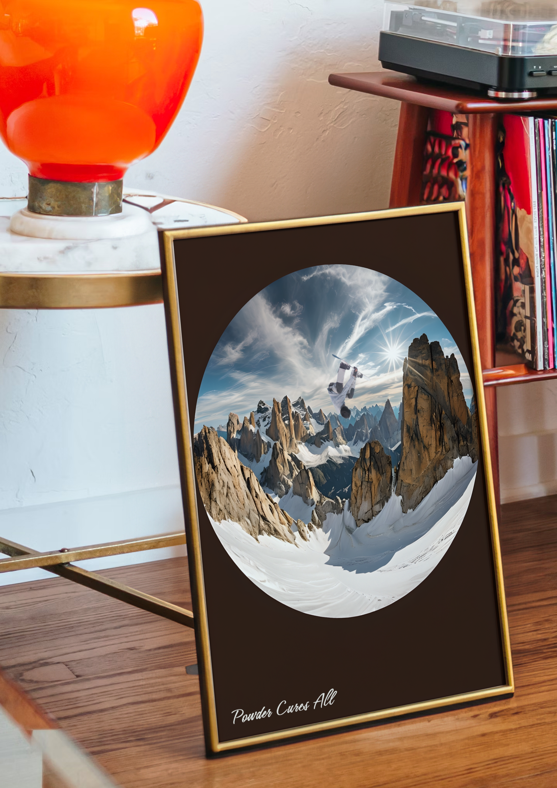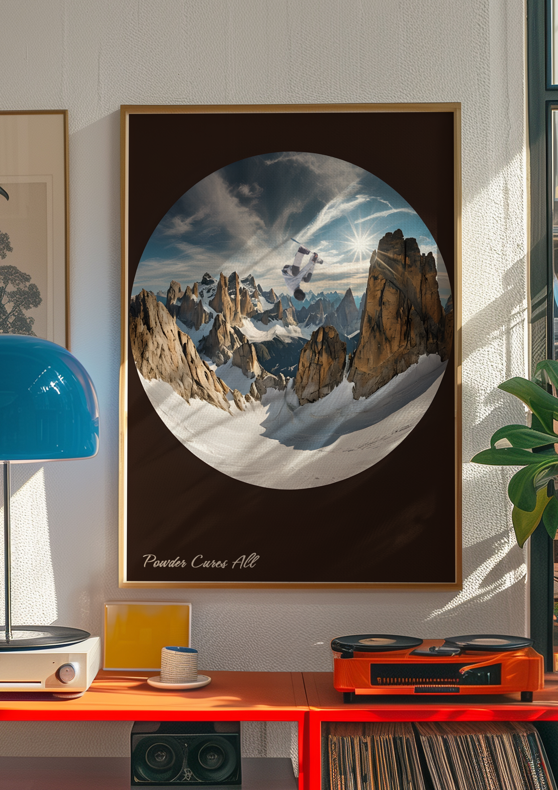 High-flying, fearless, and full of winter stoke — our "Powder Cures All" poster captures a snowboarder mid-backflip, soaring above a blanket of fresh snow with majestic mountains stretching behind them. With crisp lines, bold motion, and icy blue tones, this artwork freezes the perfect moment of airborne freedom — a celebration of powder days and pure adrenaline.