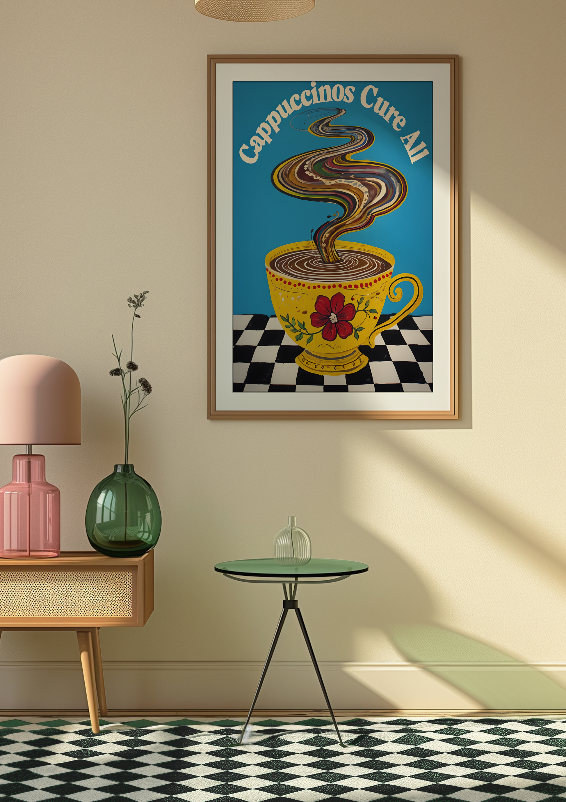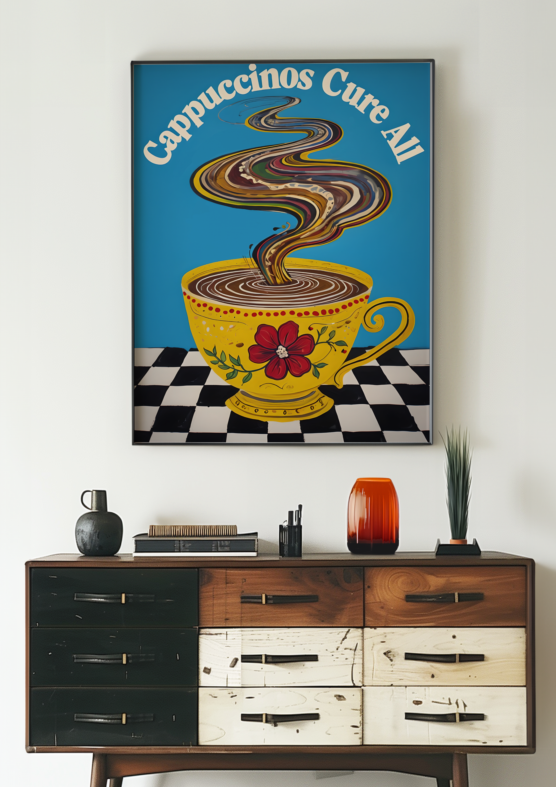 Start your day with a splash of comfort and color with our "Cappuccinos Cure All" poster, featuring a vibrant, steaming cup of cappuccino resting peacefully on a café table. With warm tones, soft foam swirls, and an inviting vibe, this artwork radiates the cozy magic of that first morning sip.