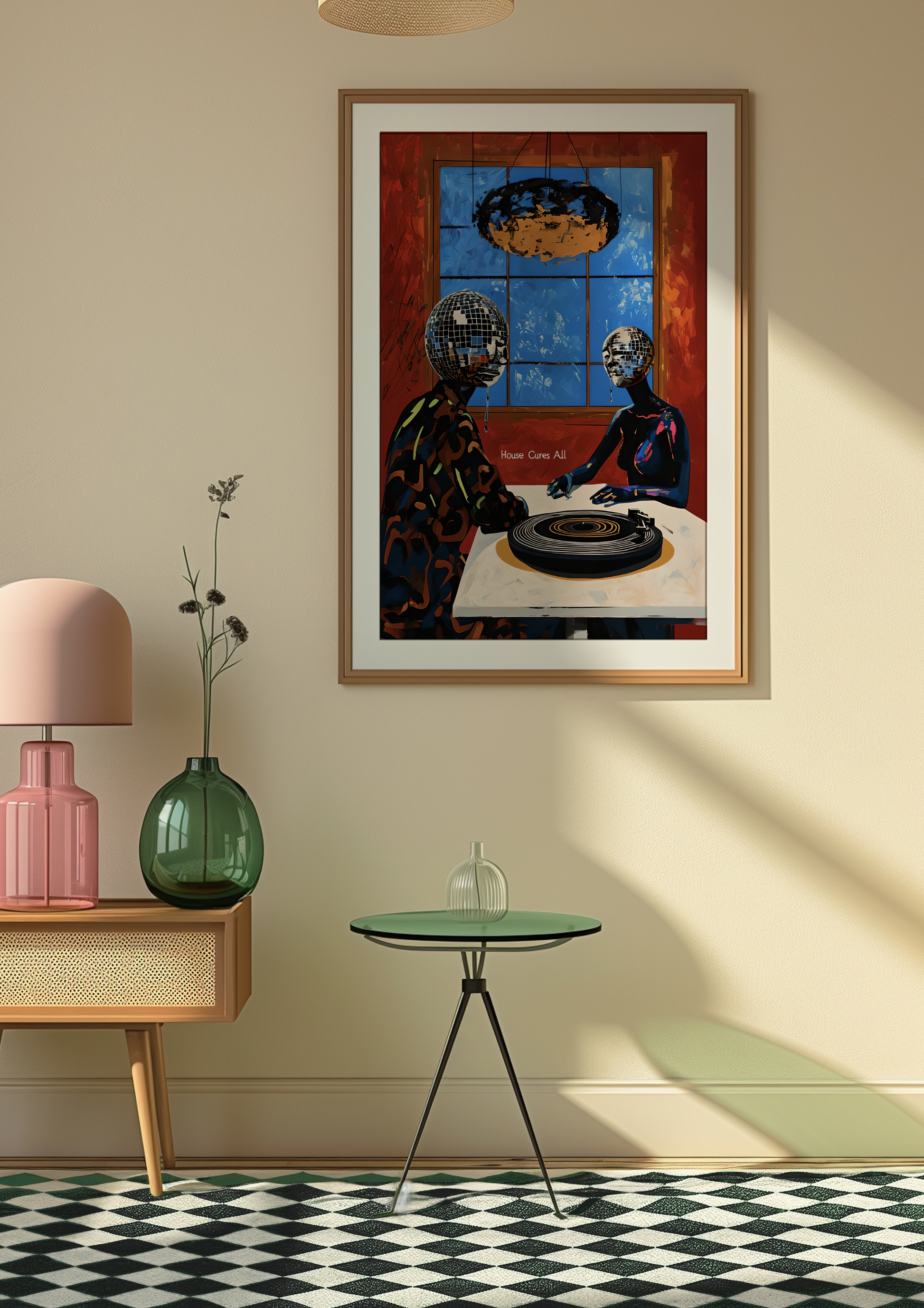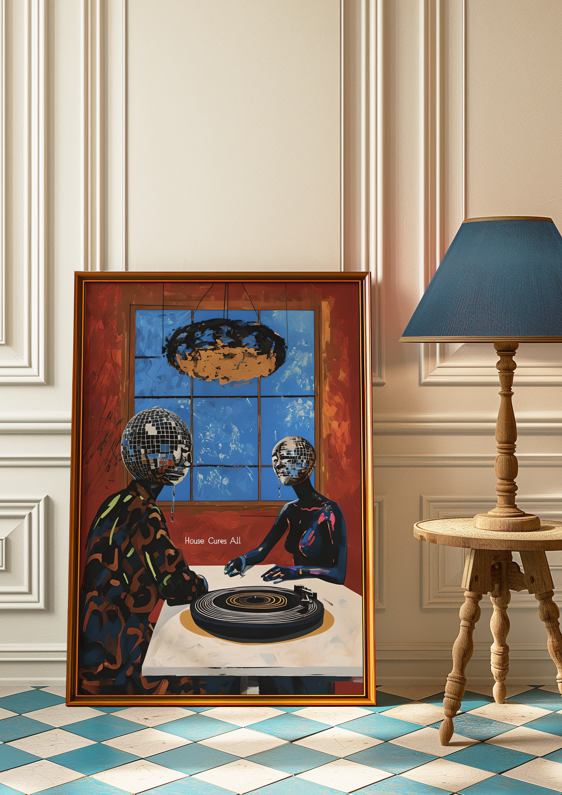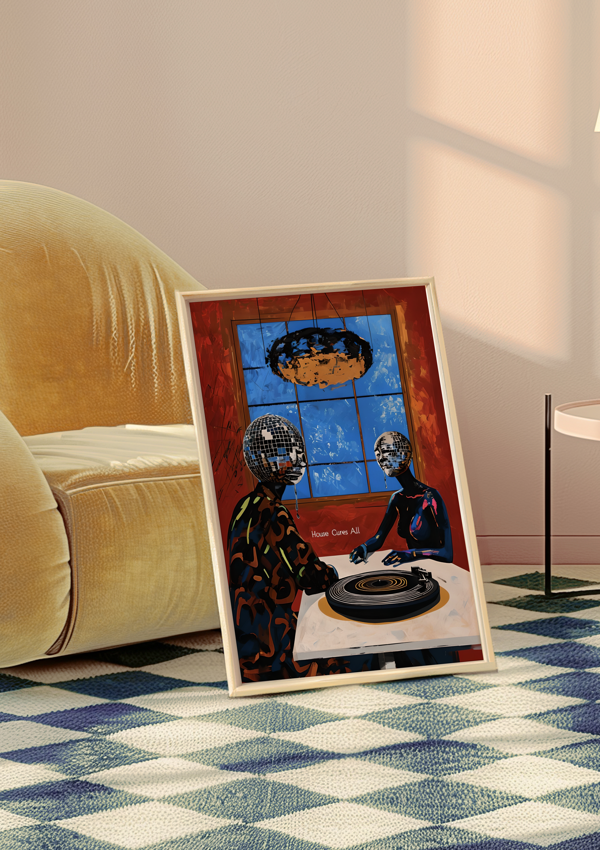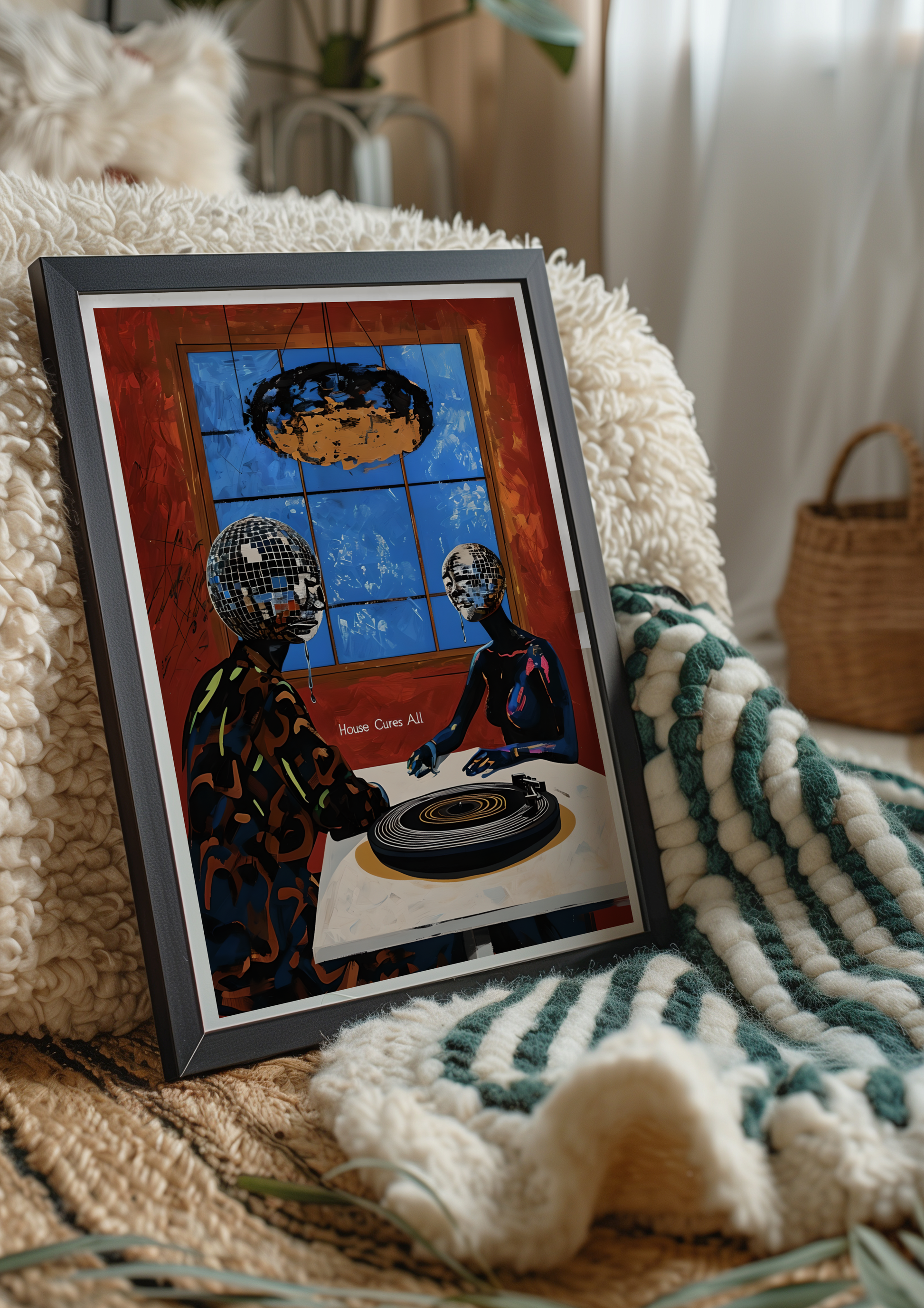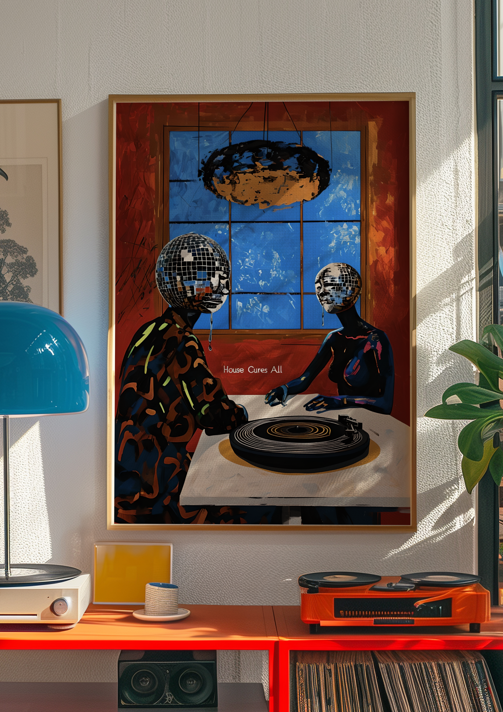 Let the beat speak when words fall short with our "House Cures All" poster — a striking, emotional take on connection through music. Featuring two figures with disco balls for heads deep in conversation, one with a single silver teardrop shining under moody lighting, this artwork captures the quiet intensity and healing power of house music. It's raw, human, and a little bit cosmic.