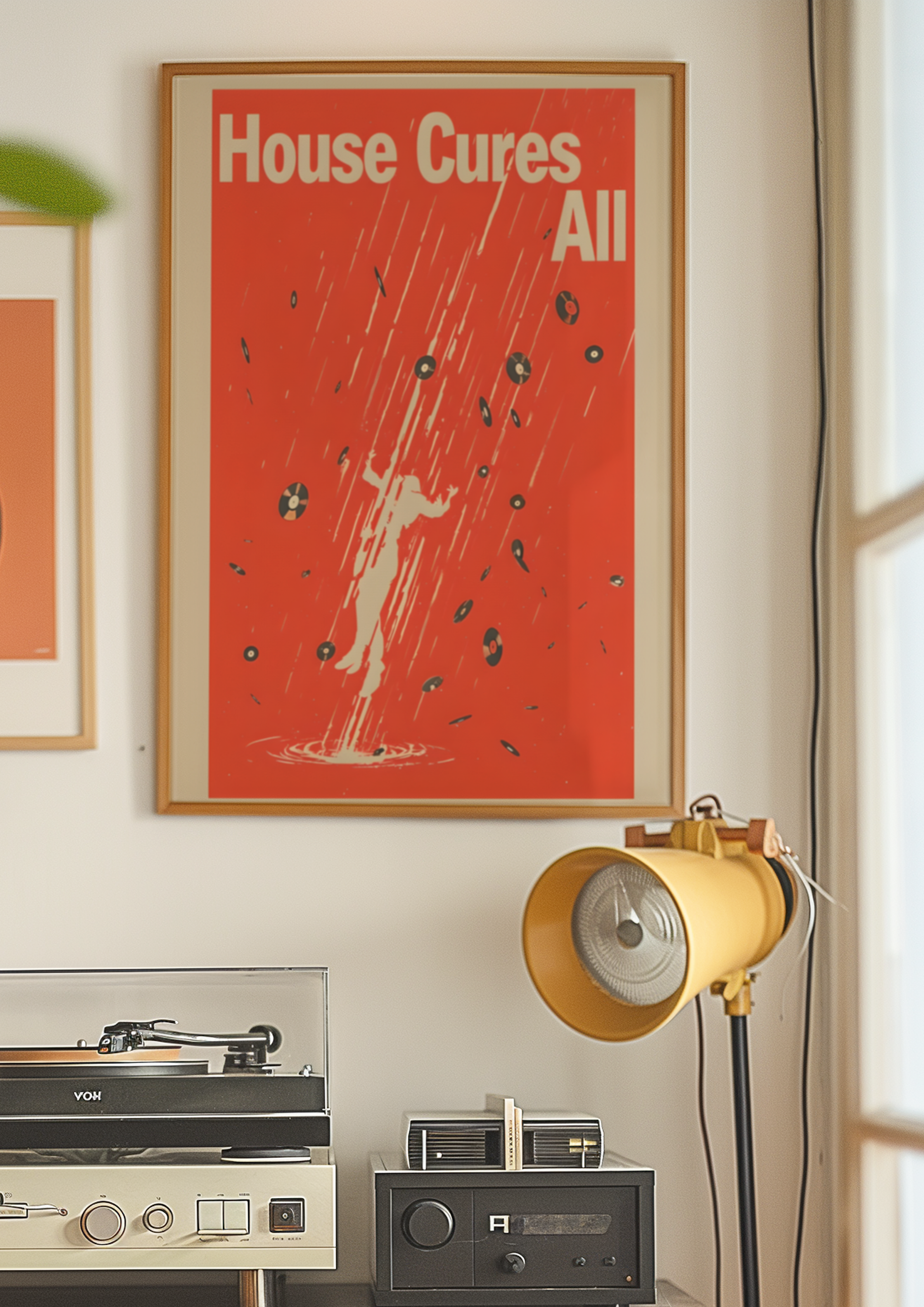 Let the music pour down with our "House Cures All" poster — a surreal, high-vibe tribute to the transcendent power of house music. Vinyl records rain from the sky, flowing straight through a man as if the beats are passing through his soul. With dreamlike visuals and a pulsing energy, this artwork captures that euphoric state where music becomes more than sound — it becomes you.