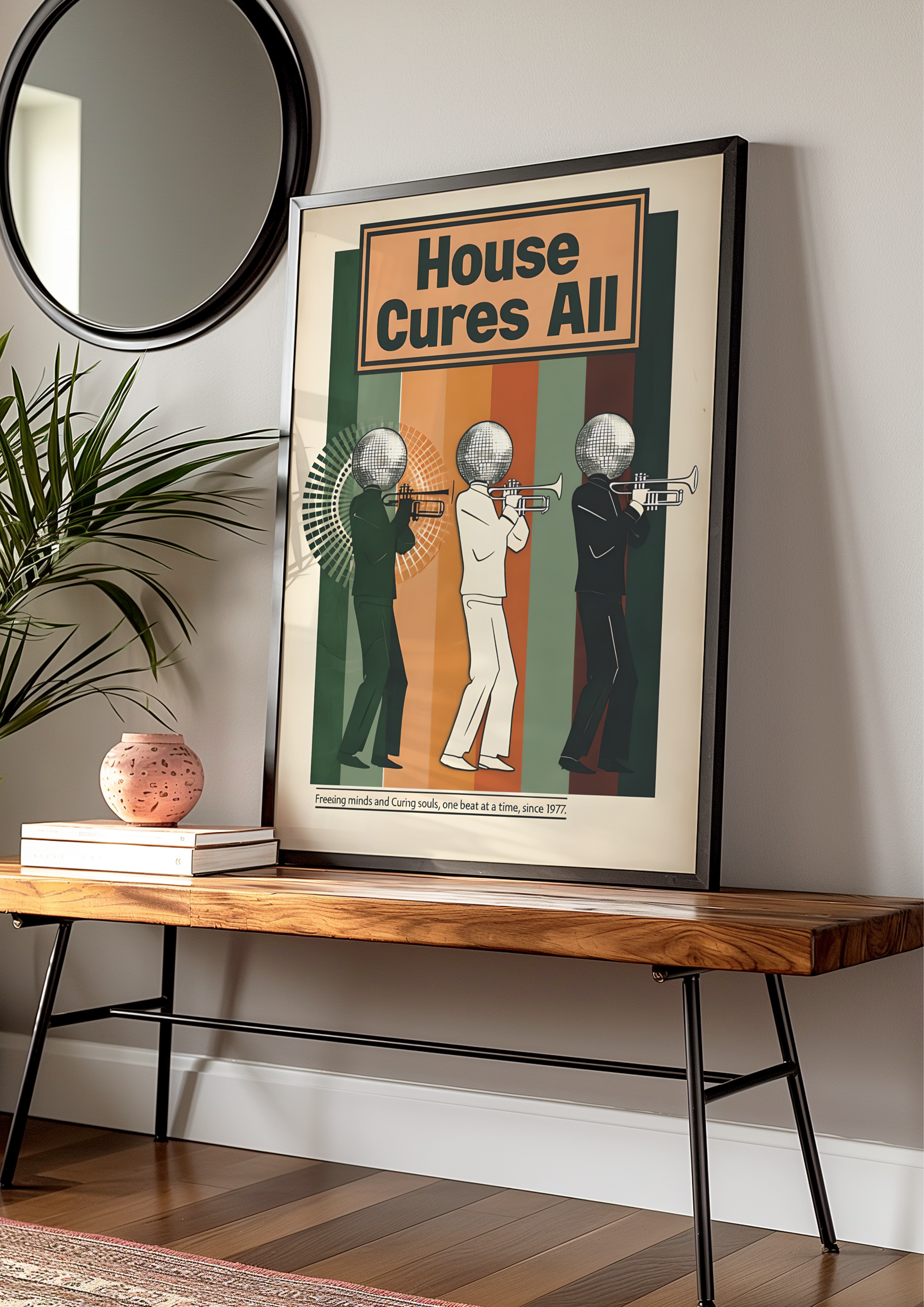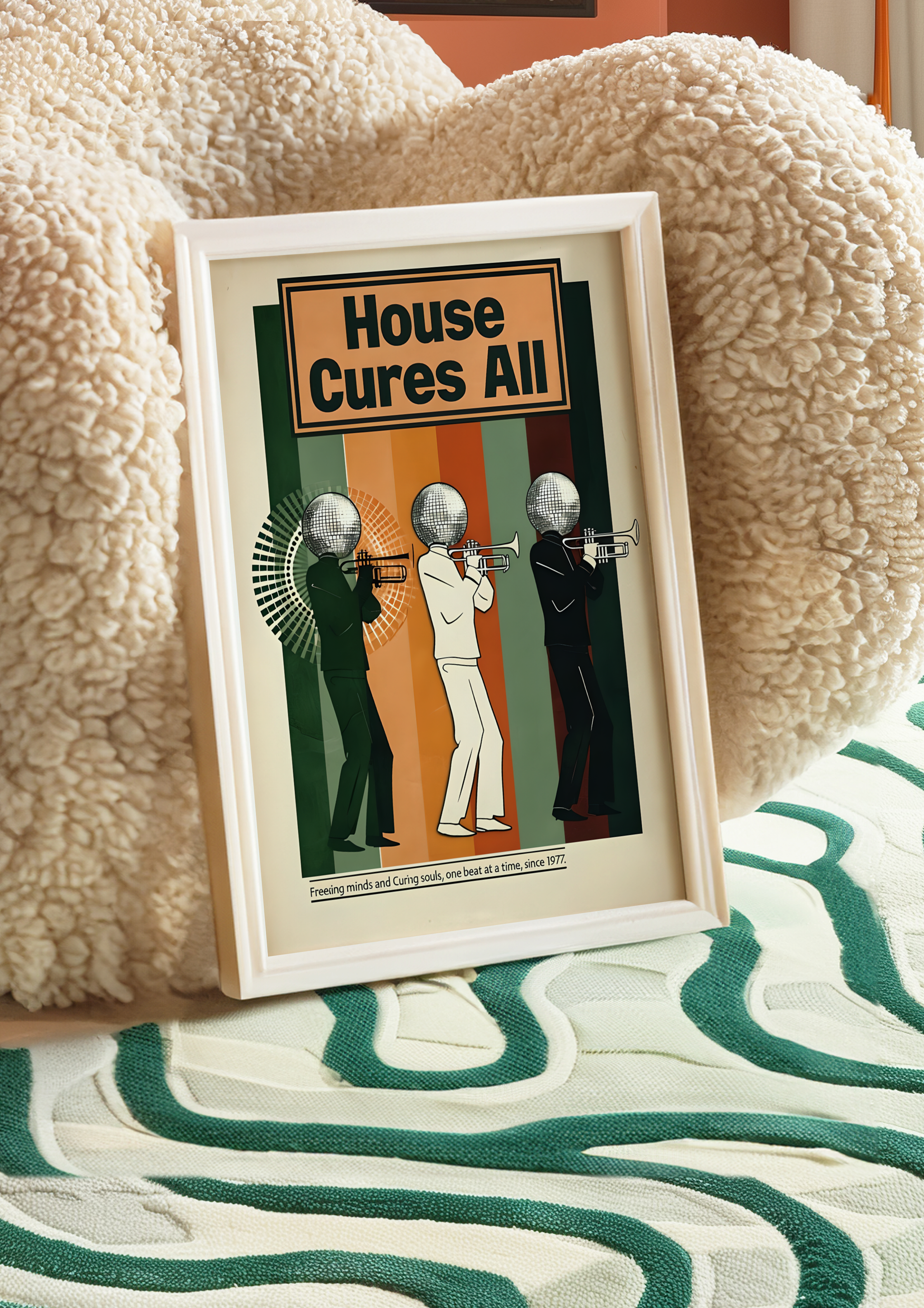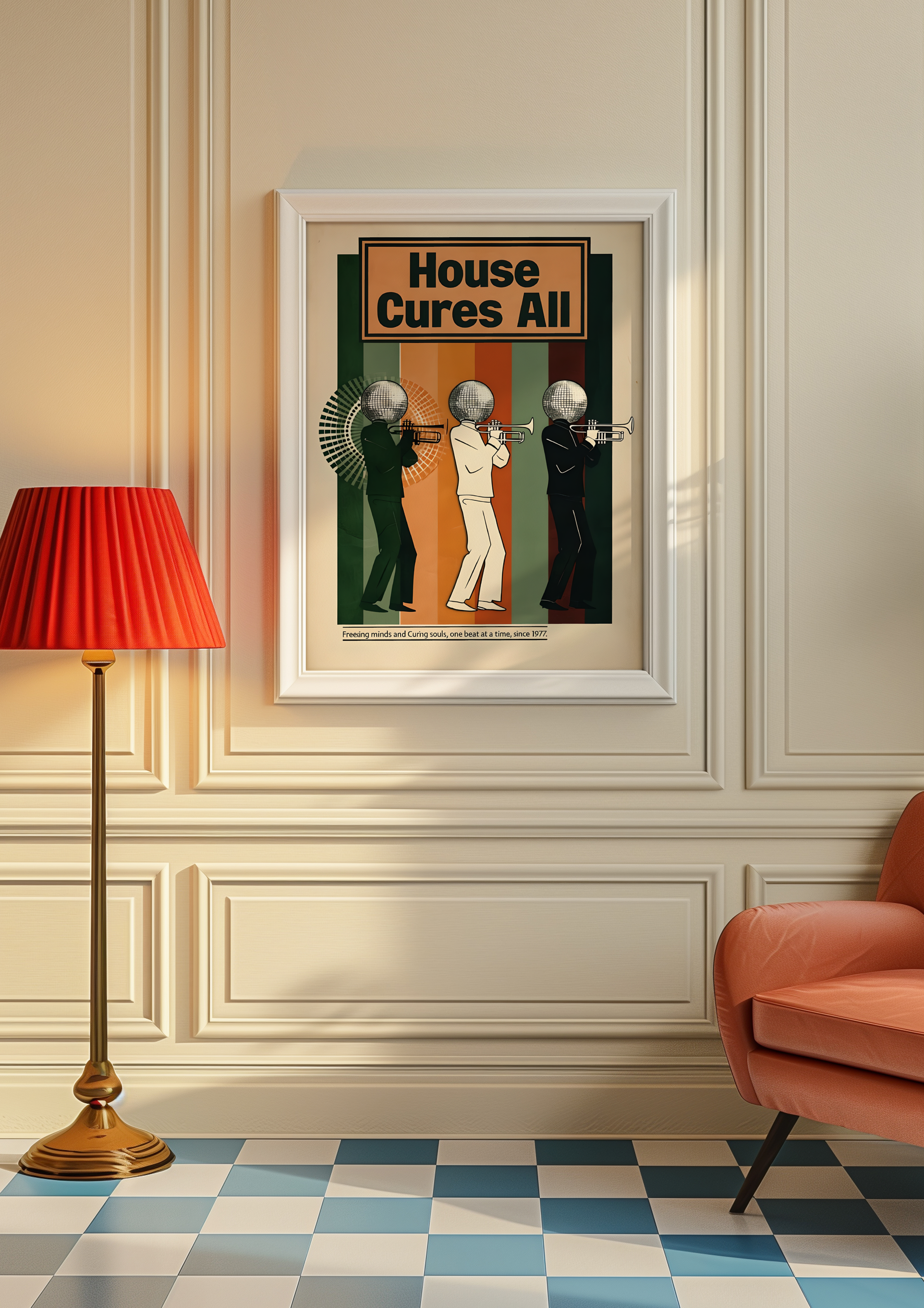 Where rhythm meets House, our "House Cures All" poster brings the groove to life with a funky twist. Featuring trumpet players with shimmering disco ball heads, this vibrant design fuses the soul of jazz with the pulse of house music. With bold lines, brass energy, and retro-cool vibes, it’s a celebration of sound that transcends genre and era.