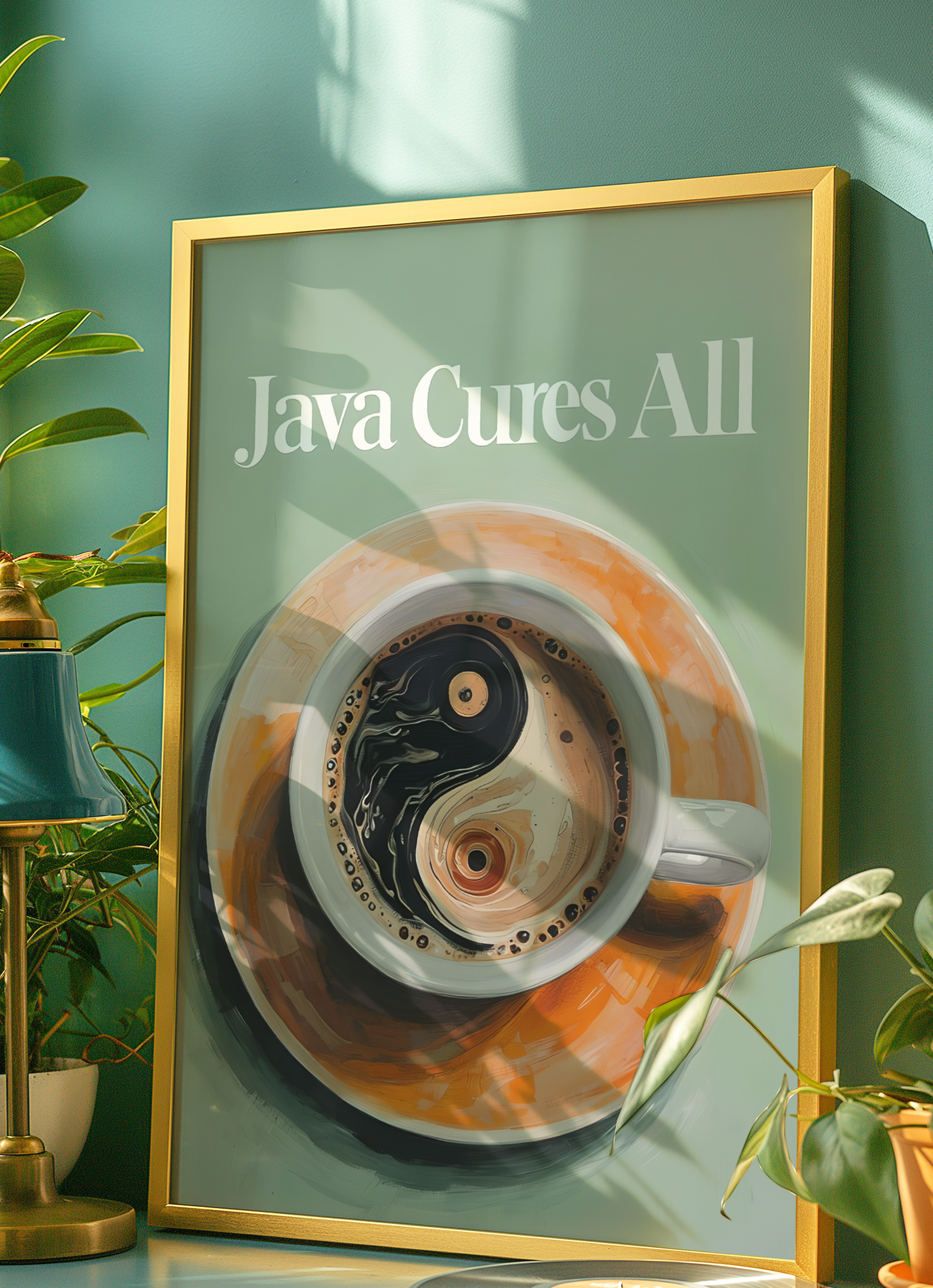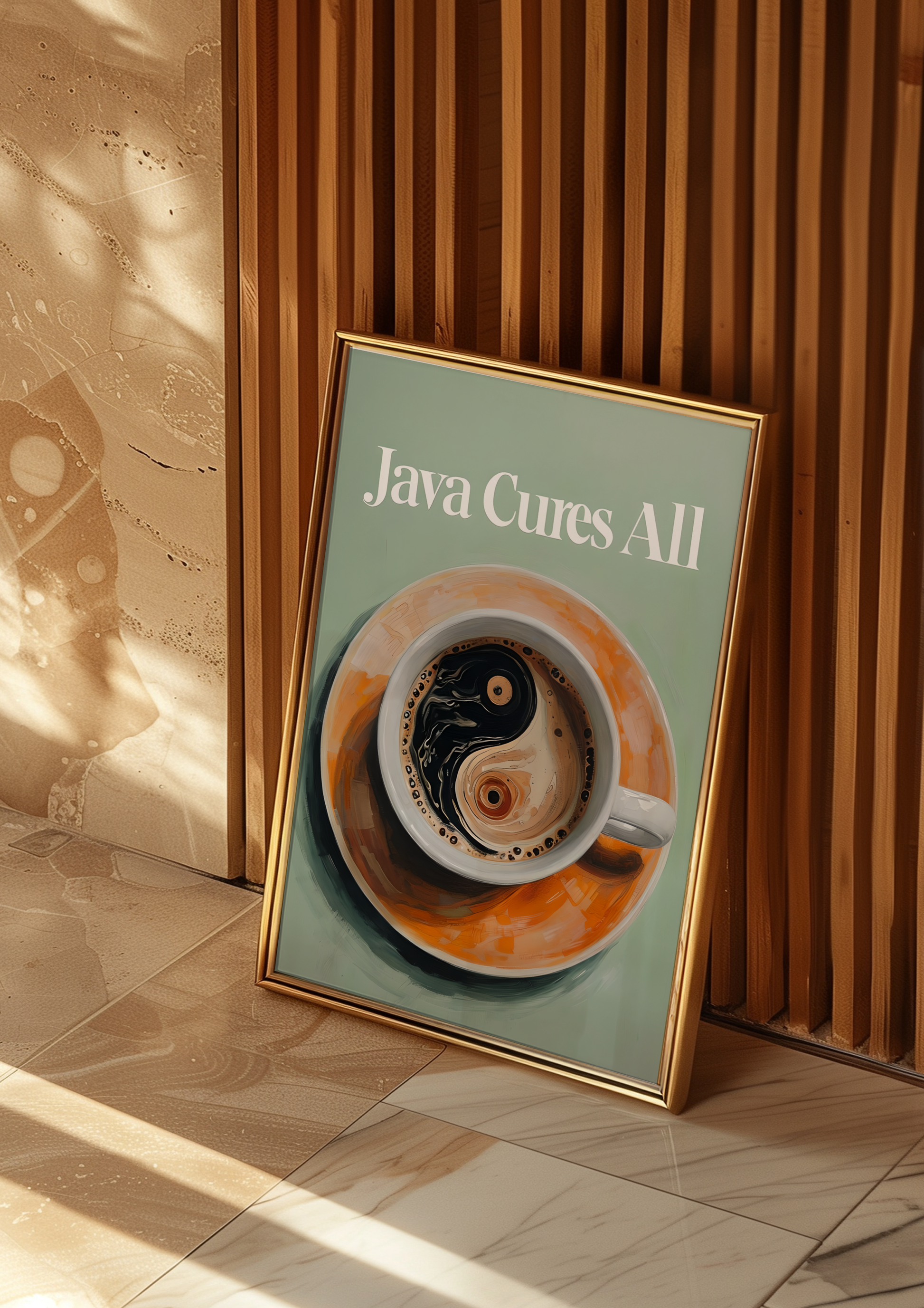 Simplicity meets sophistication in our "Java Cures All" poster, featuring a refined cup of coffee set against a clean, elegant backdrop. With subtle textures, rich tones, and timeless typography, this design captures the quiet strength and daily comfort found in a single, perfect cup of java.