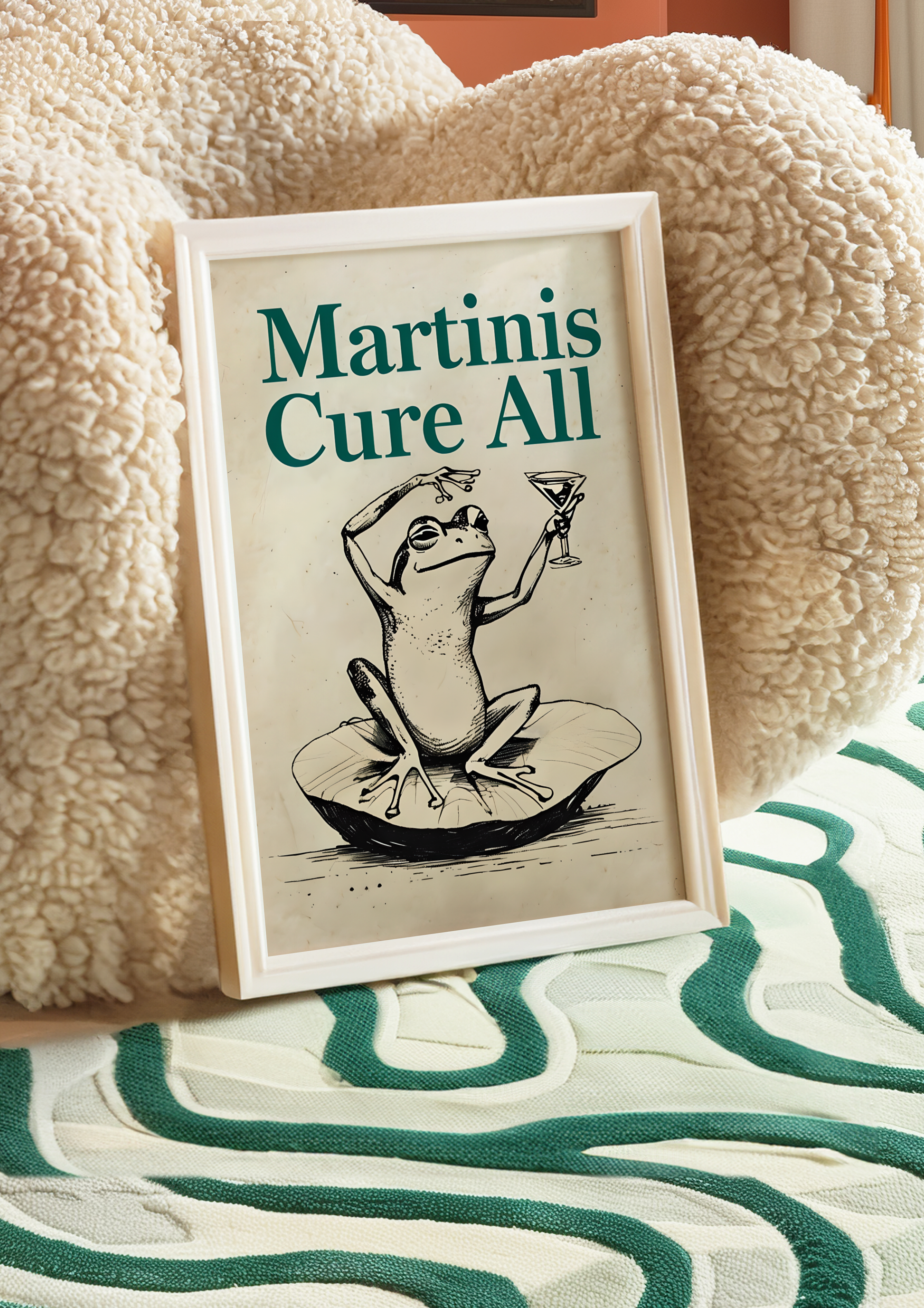 Classy, and just a little bit ridiculous—this poster features a chill frog living its best life, martini in hand (or…webbed foot). Martinis Cure All! Whether you're a cocktail connoisseur or just appreciate a good amphibian with taste, this print adds a splash of humor and sophistication to any bar, kitchen, or lounge. Because sometimes, all you need is a martini… and maybe a frog drinking a martini.