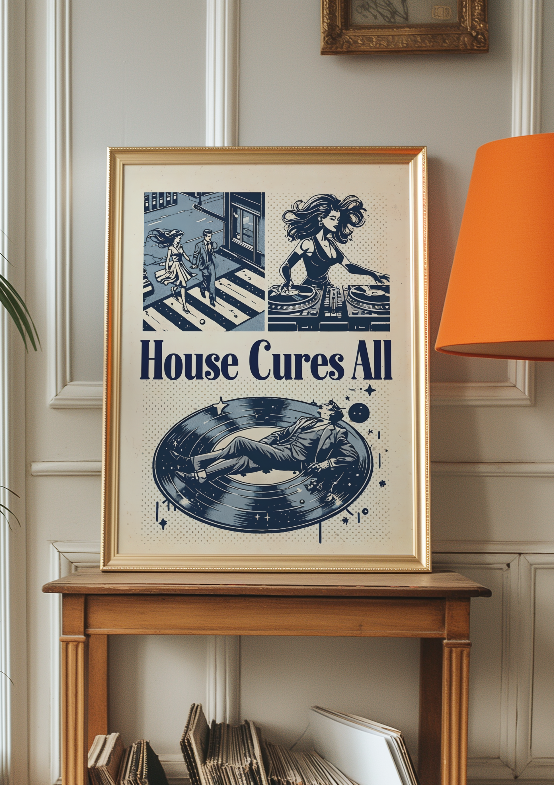 Unleash the story of sound with our "House Cures All" poster — a comic book-style trip through the wild, weird, and wonderful world of house music. In this illustrated page of rhythm and rebellion, a DJ spins beats that send a man and woman sprinting toward the night, while another floats peacefully on a vinyl record drifting through space. Bursting with bold lines, vibrant colors, and graphic energy, it’s a visual anthem to the music that moves us — body, mind, and soul.