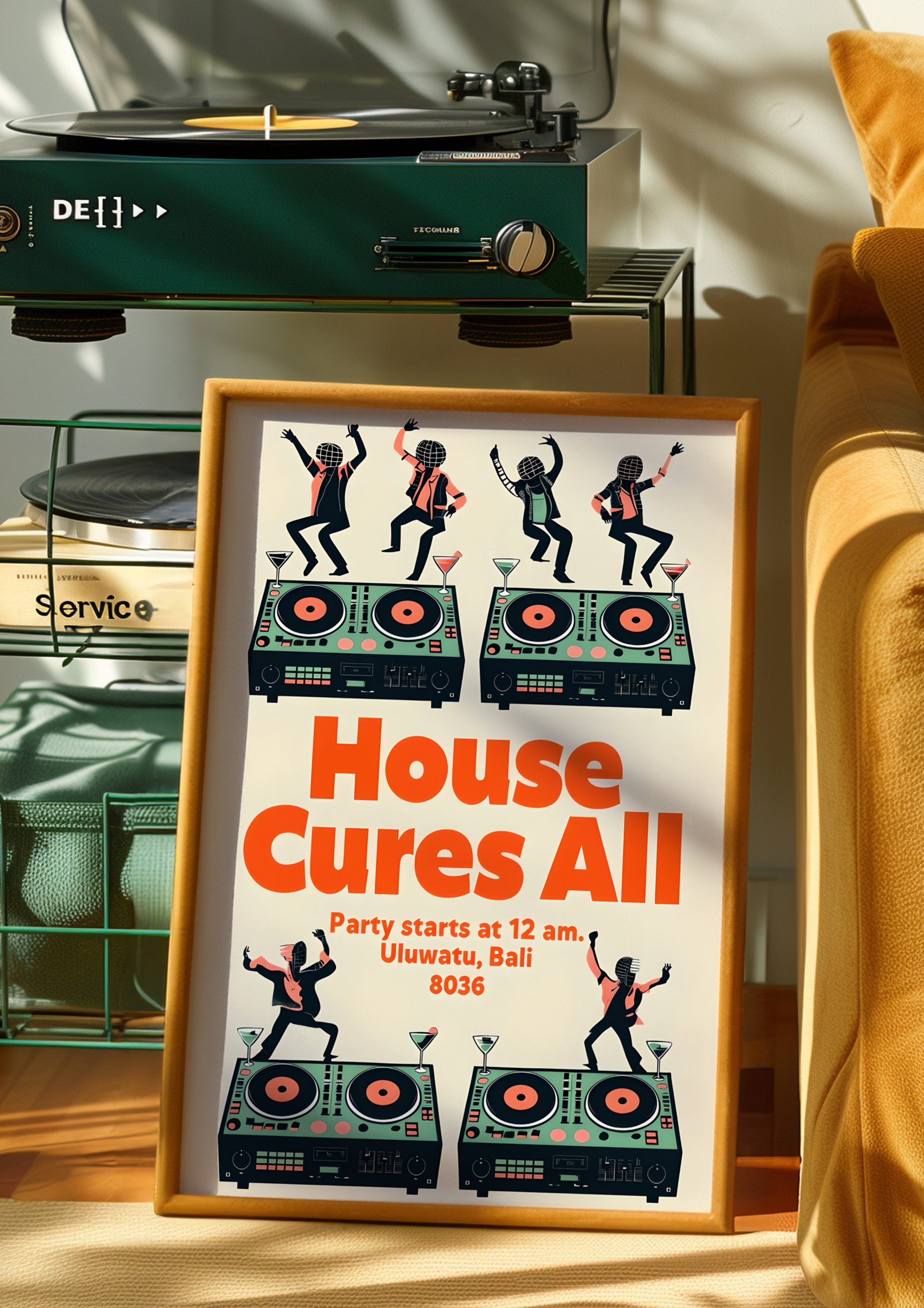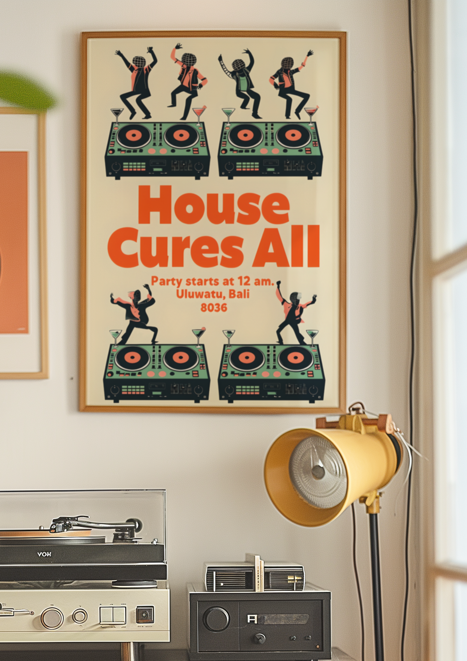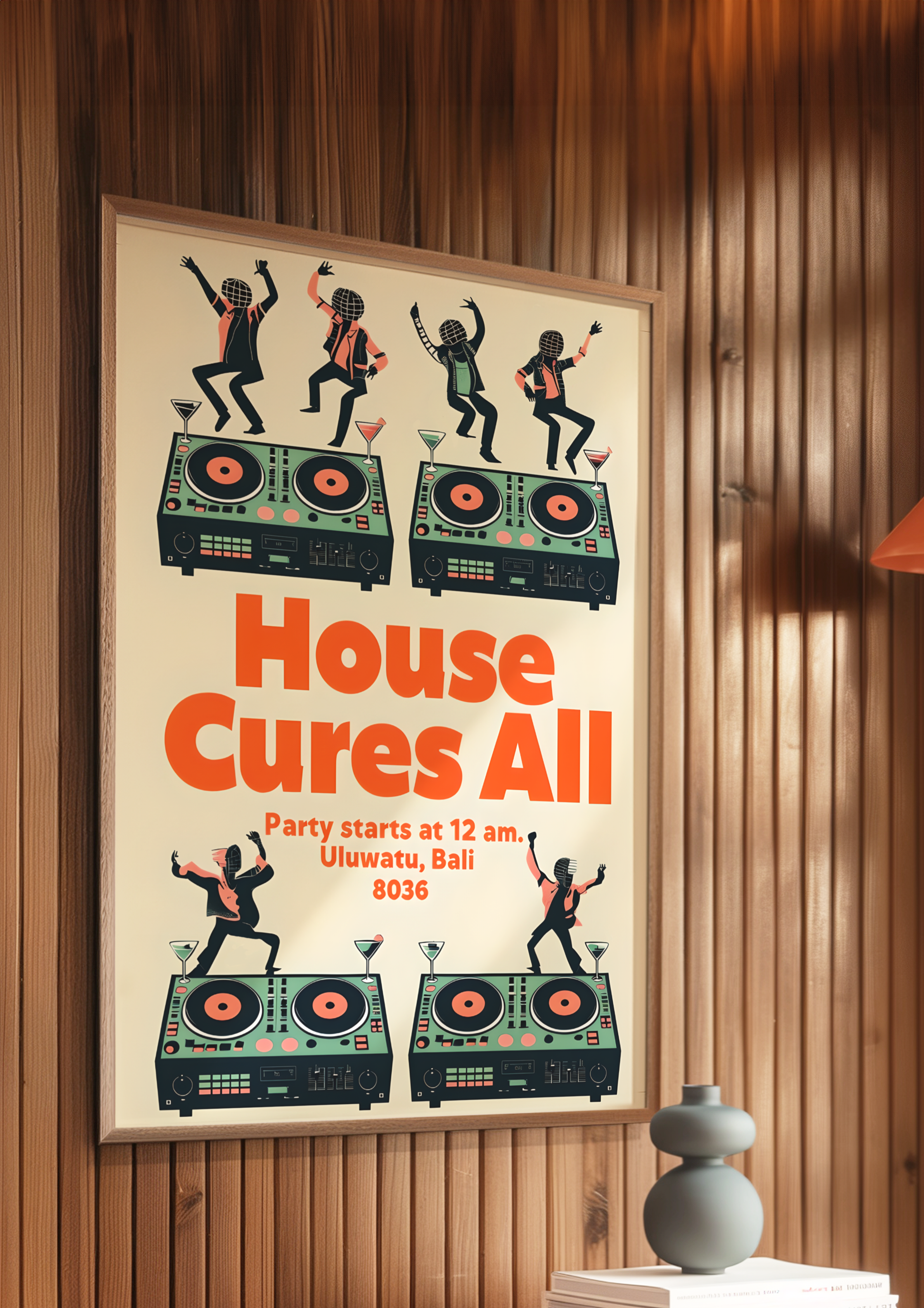 Feel the beat and lose yourself in the rhythm with our "House Cures All" poster — a vibrant, high-energy tribute to Bali’s underground party scene. Featuring a DJ spinning on iconic decks while disco ball-headed dancers move under neon skies, this artwork captures the electric pulse of a night out in Uluwatu.