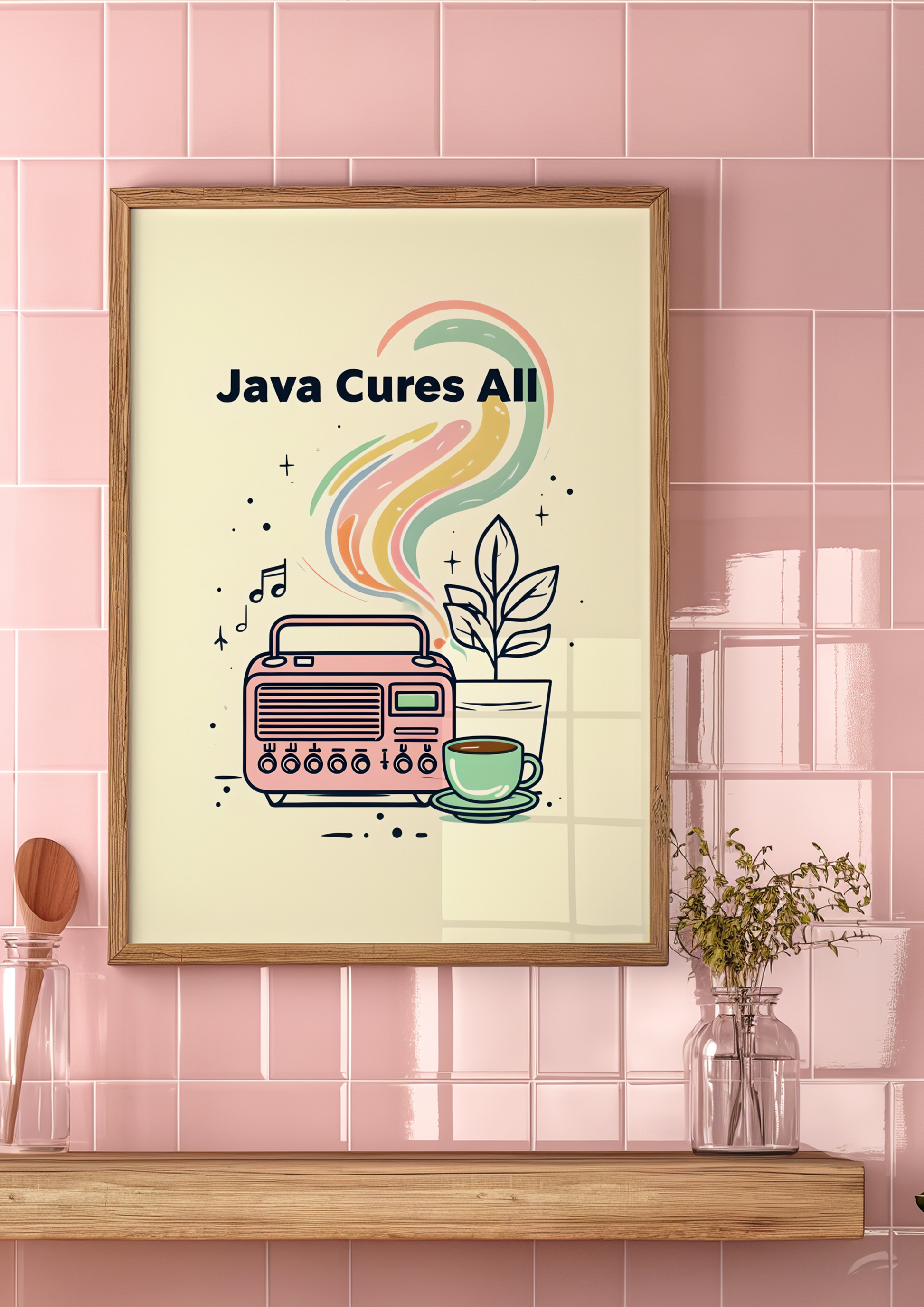 Energize your space with our "Java Cures All" poster, a lively tribute to the perfect morning ritual. Featuring a boldly colored cup of coffee radiating warmth, with a retro radio humming tunes beside it, this artwork captures the rhythm of slow mornings, rich brews, and good vibes. The vivid palette and nostalgic details create a feel-good atmosphere that’s equal parts comfort and groove.