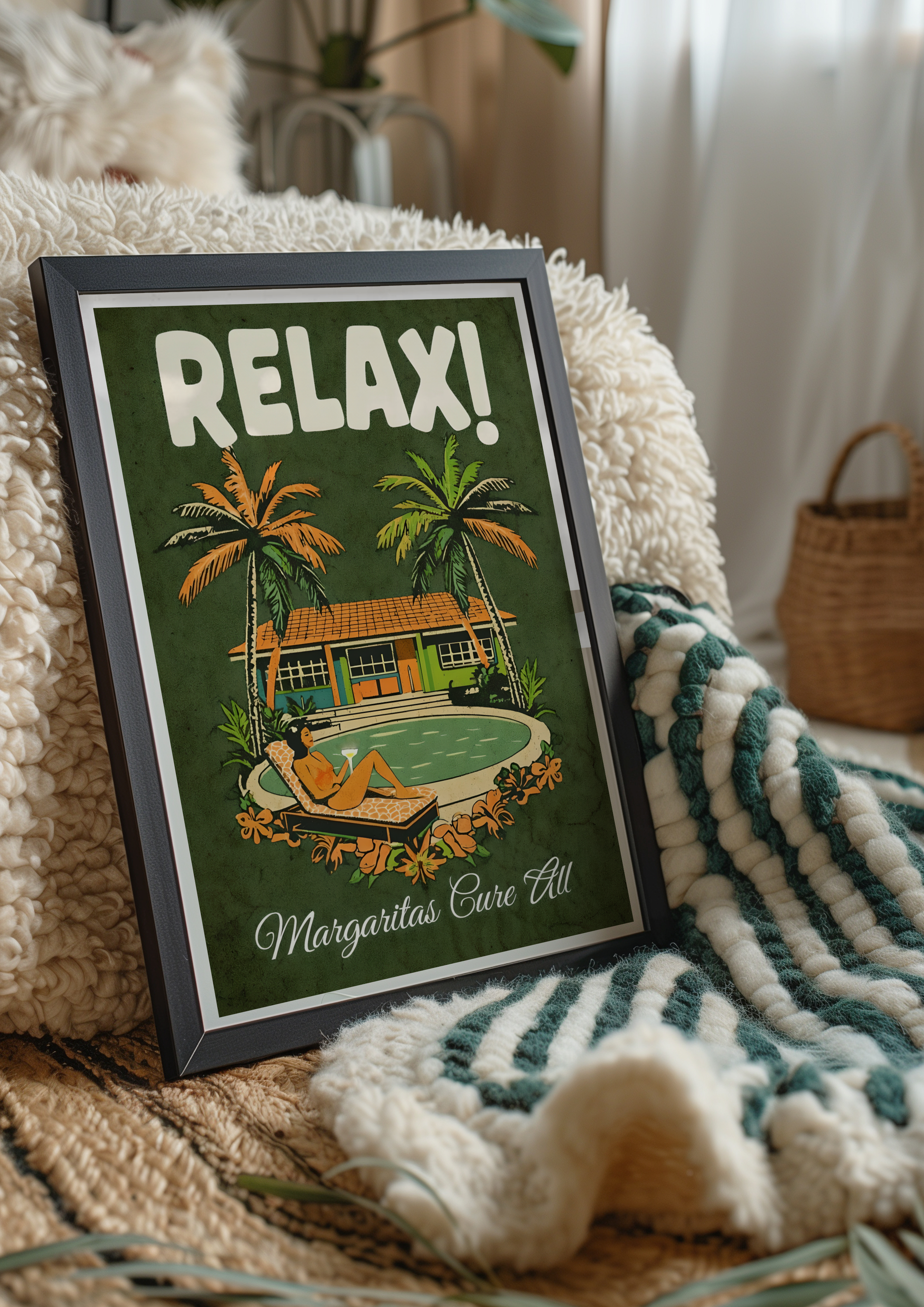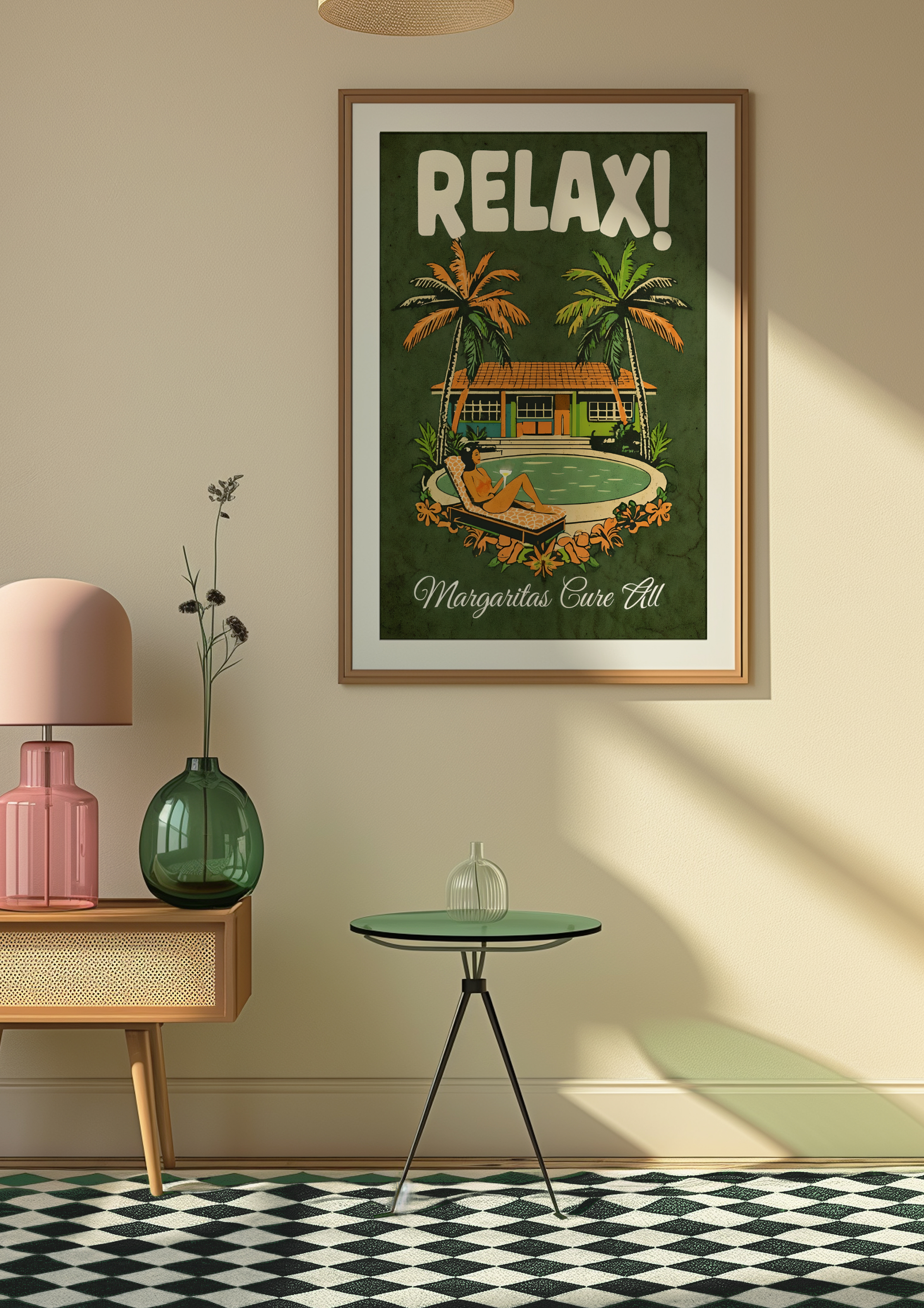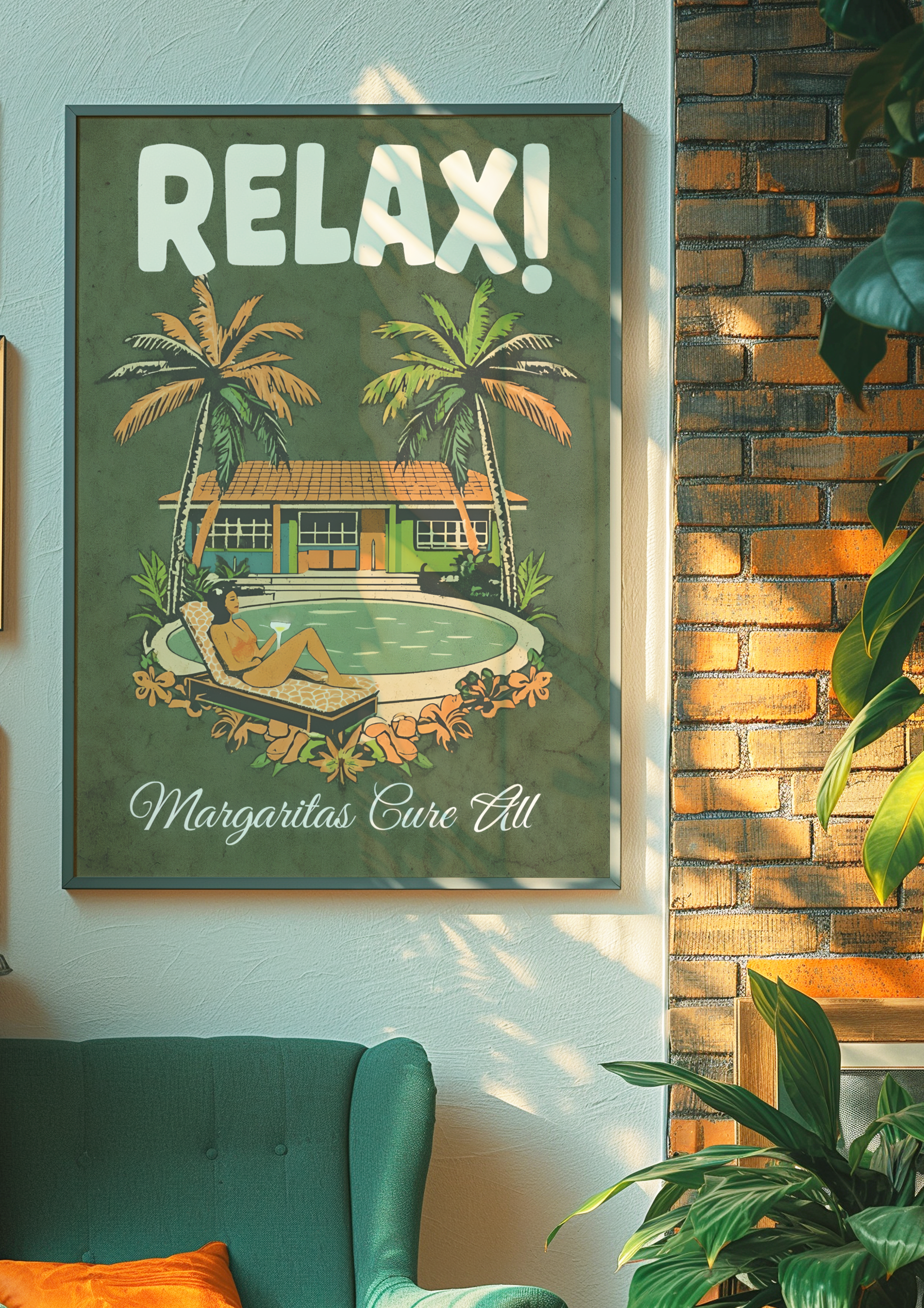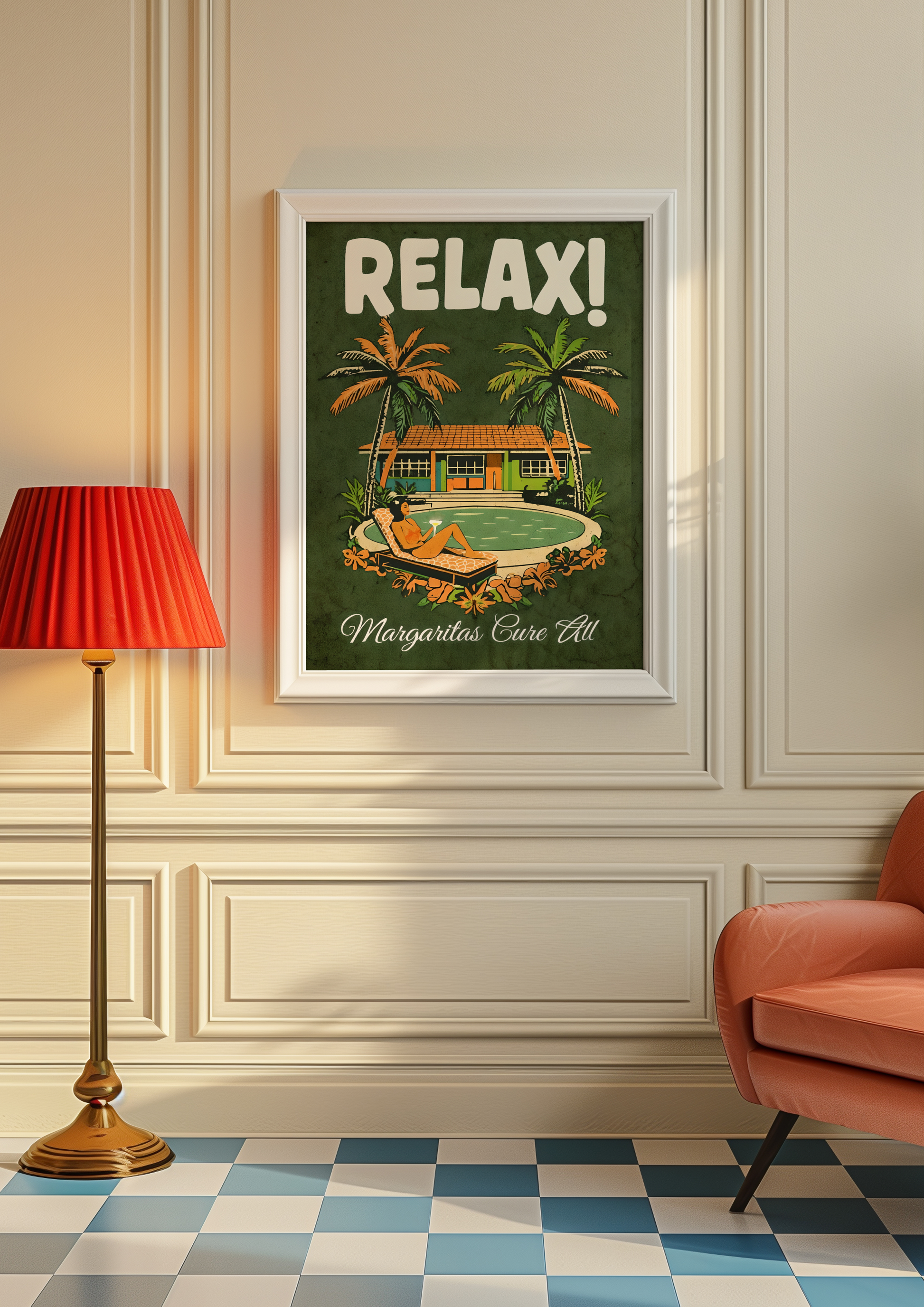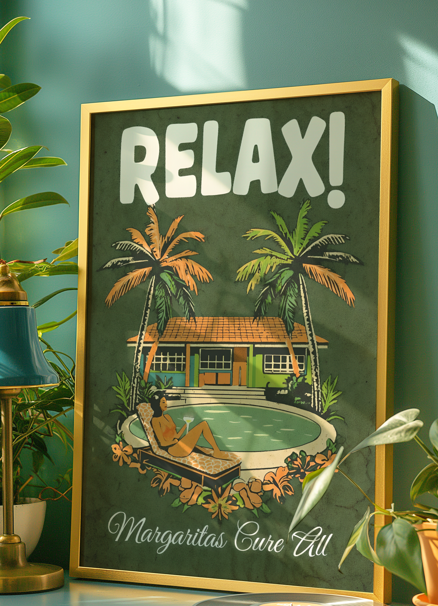 Refreshing, flirty, and full of sunshine, our "Relax! Margaritas Cure All" poster captures the art of unwinding in style. Featuring a woman lounging poolside, sipping a perfectly chilled margarita, the scene is drenched in warm tones, shimmering water, and total leisure vibes. It’s a vintage-inspired escape where time slows down and lime and salt do the healing.