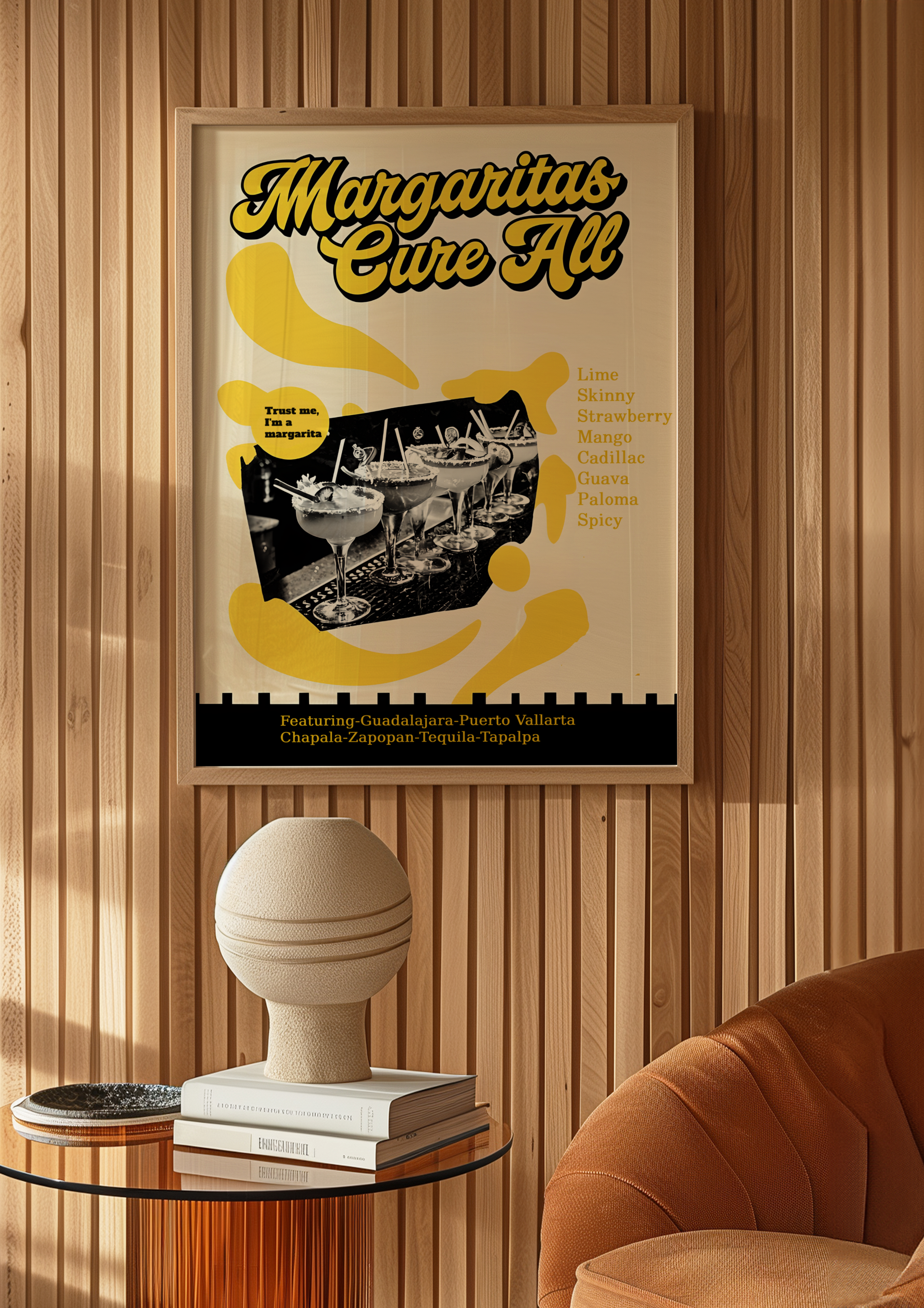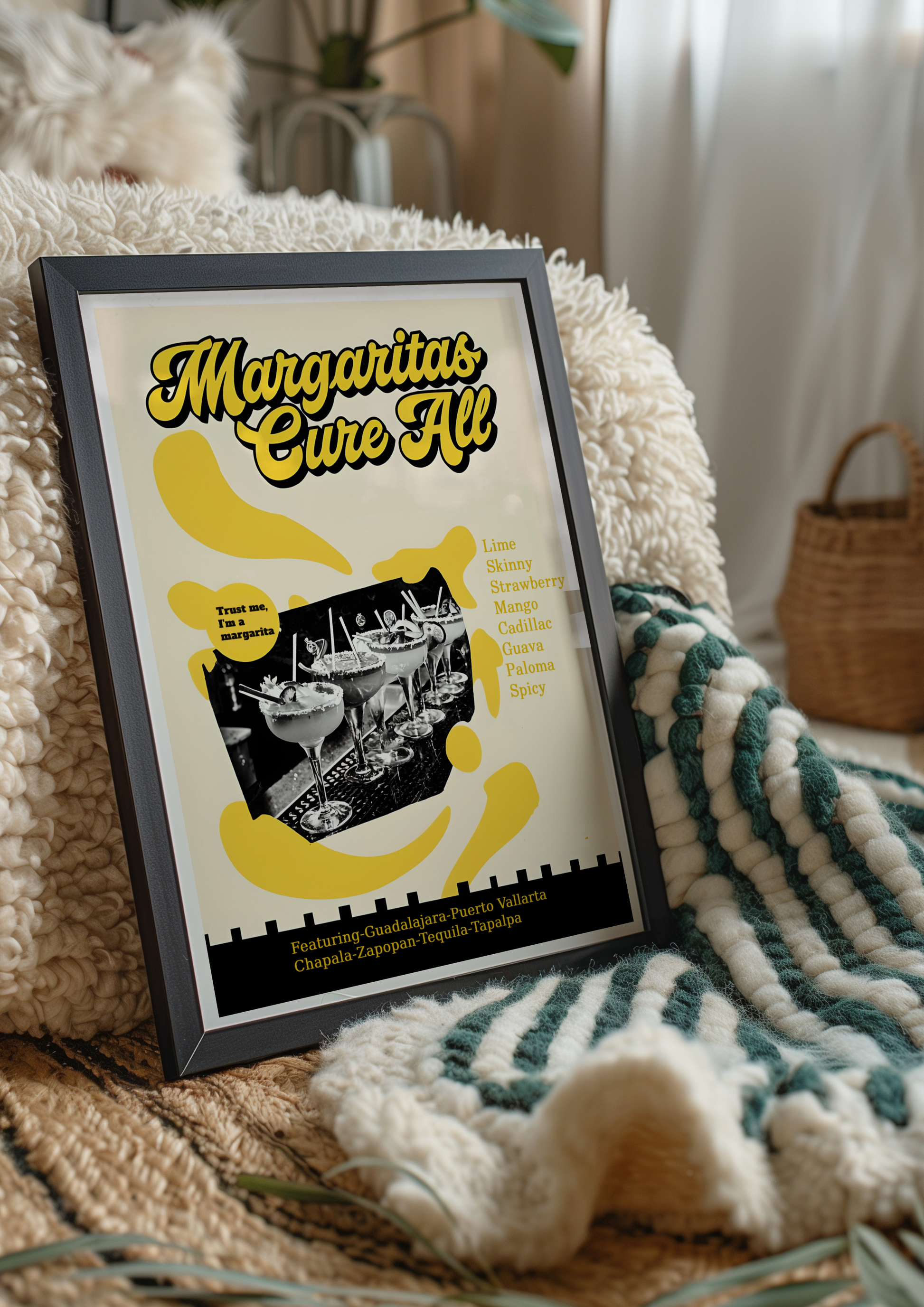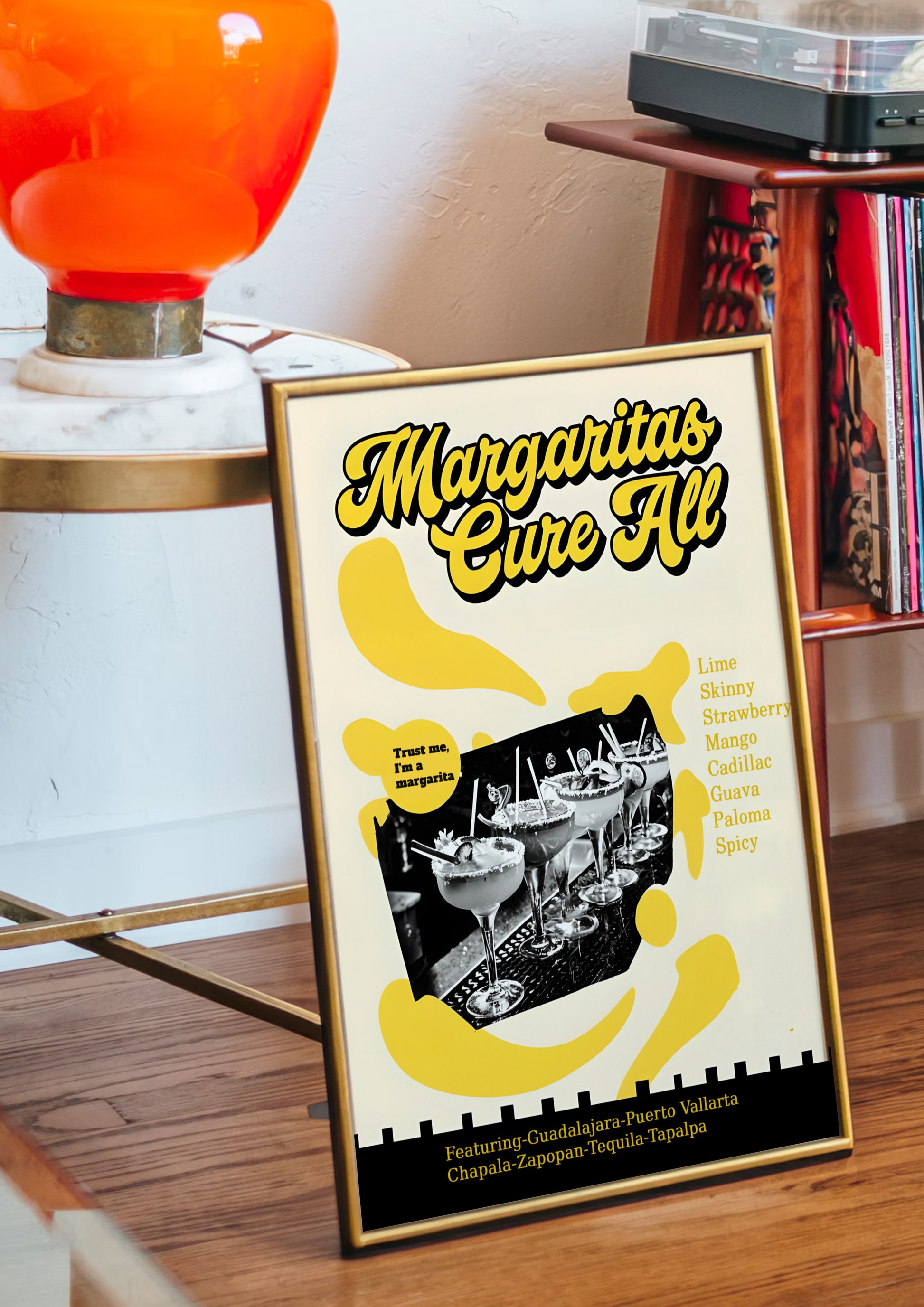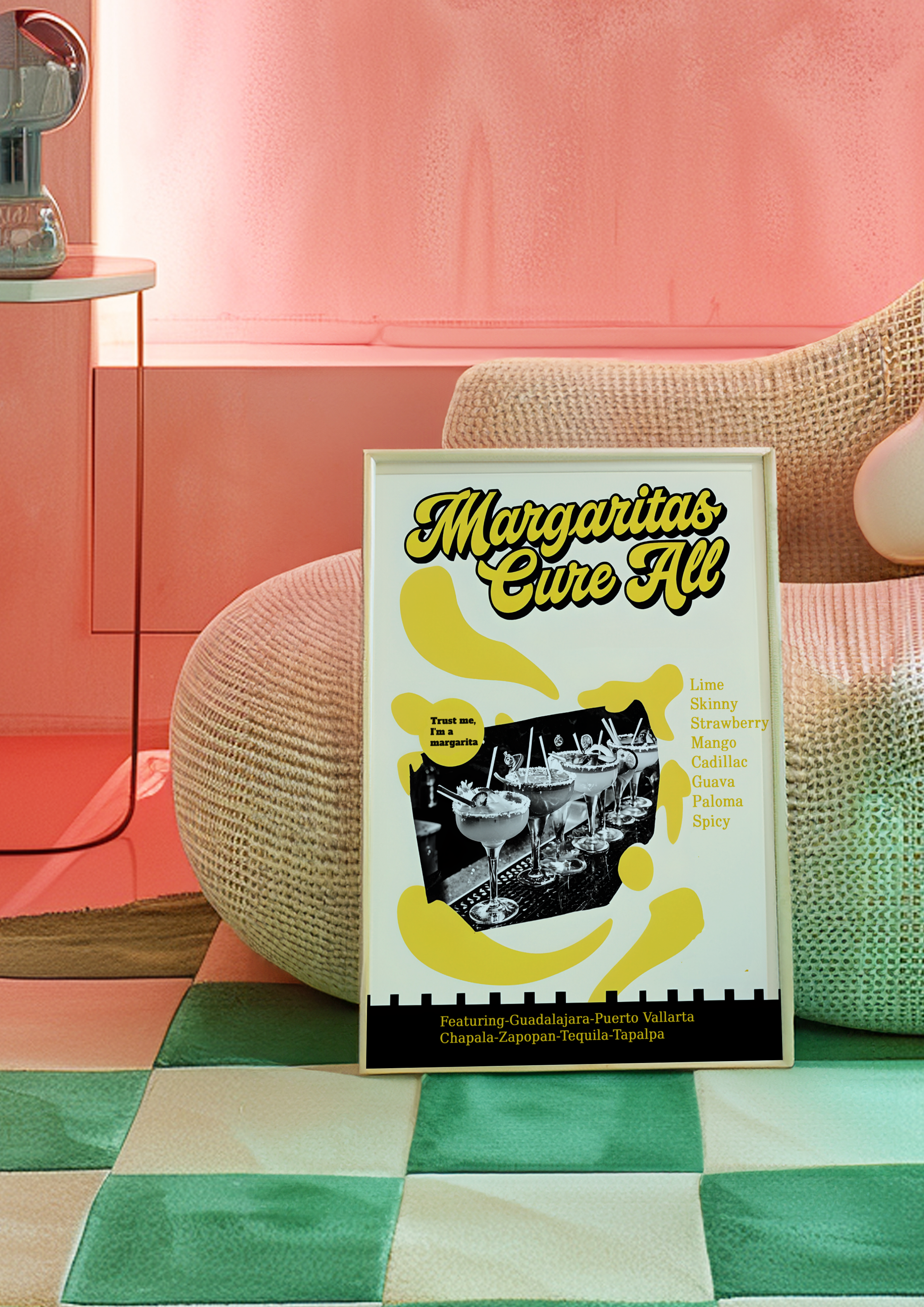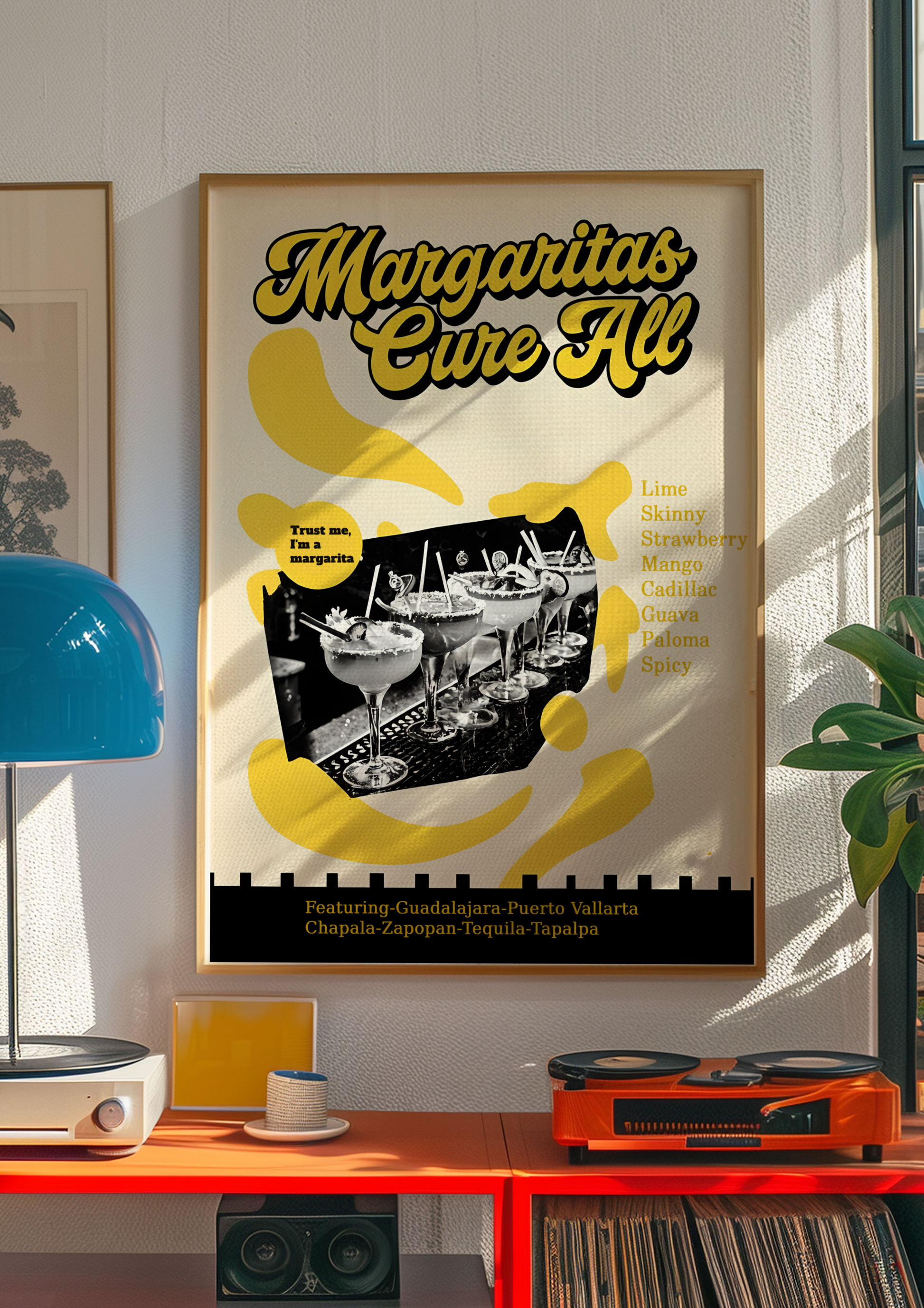 Bold, zesty, and bursting with feel-good energy, our "Margaritas Cure All" poster serves up a splash of sunshine with a groovy twist. Featuring vibrant margaritas perched on a retro bar top, surrounded by bold yellow hues and playful 70s-inspired design, this artwork radiates good times, loud laughter, and lime-fueled vibes.