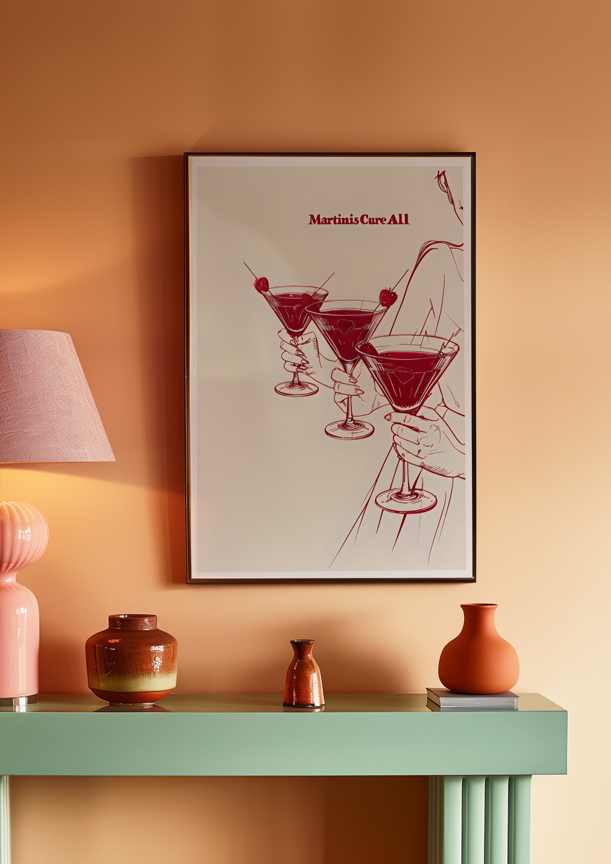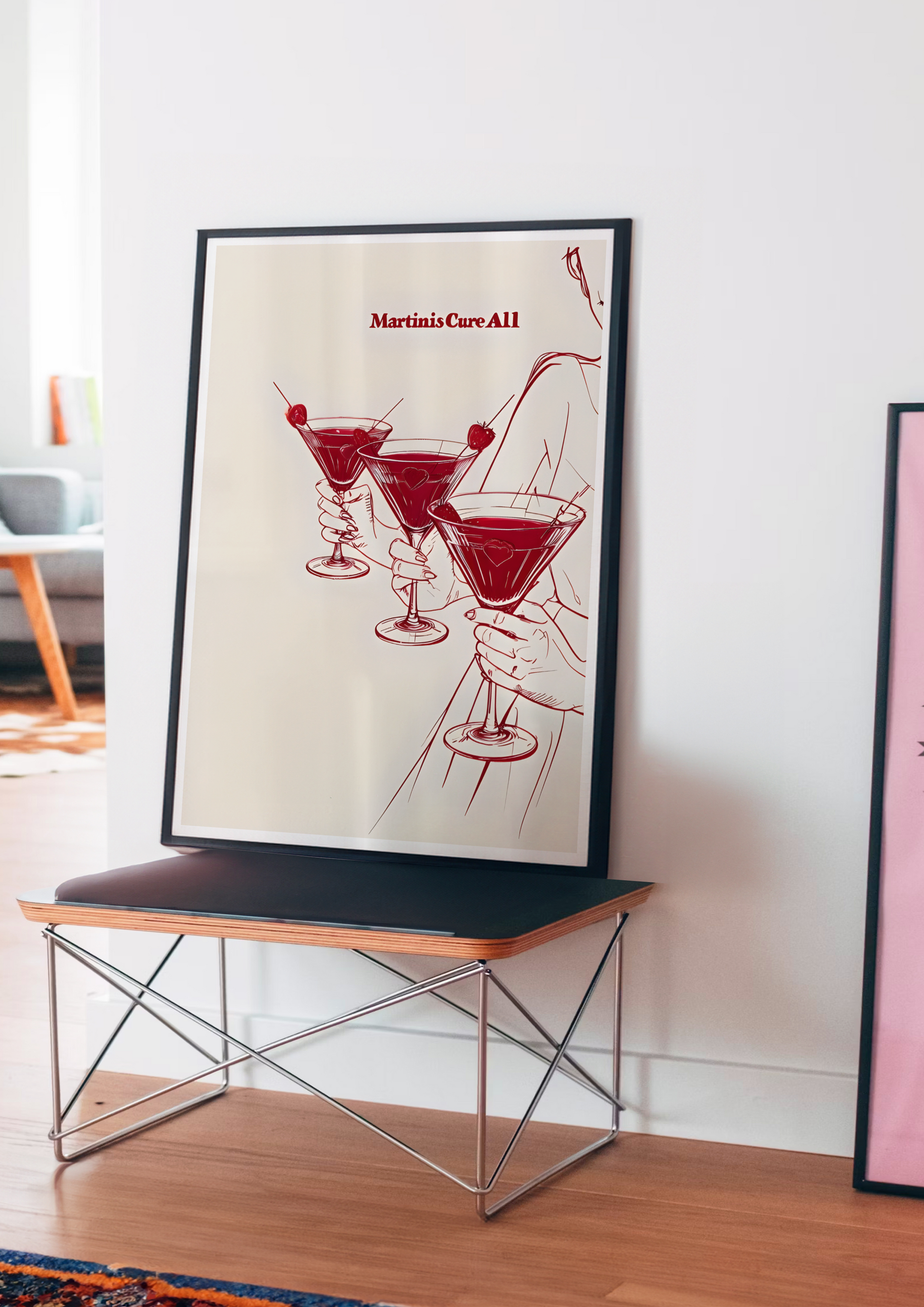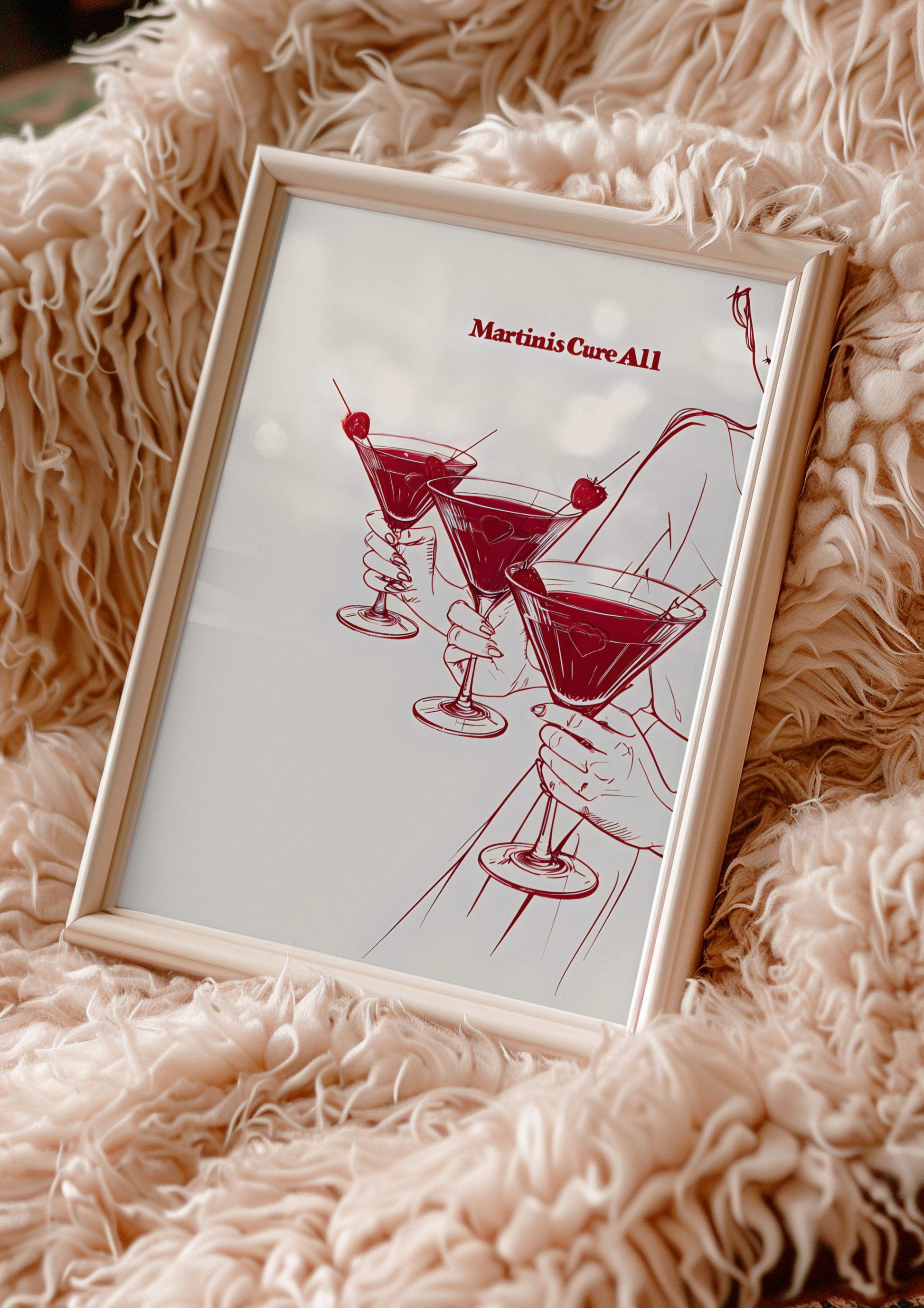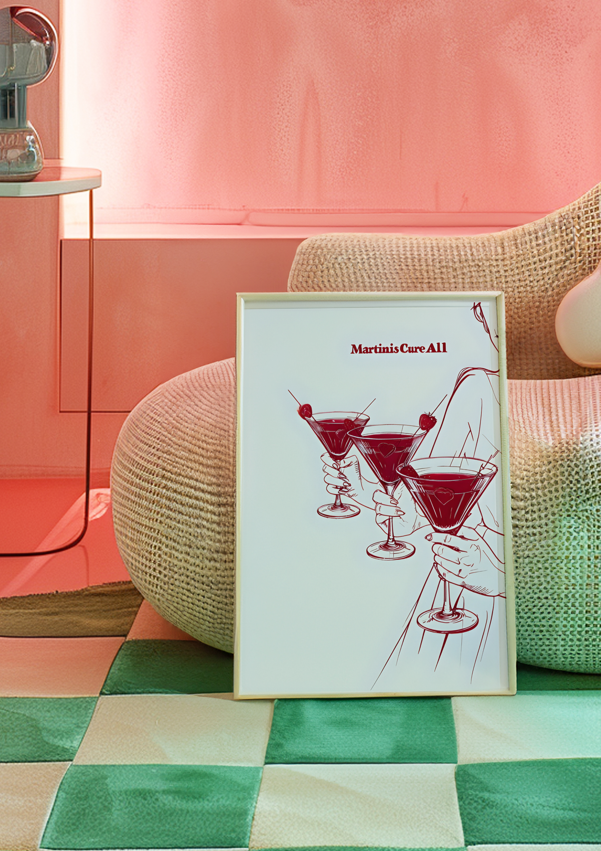 Celebrate friendship and a splash of glamour with our "Martinis Cure All" poster, featuring three stylish women raising their martinis in perfect sync. With bold colors, confident poses, and a touch of retro elegance, this artwork captures the essence of a girls' night out — where laughter flows as freely as the cocktails.