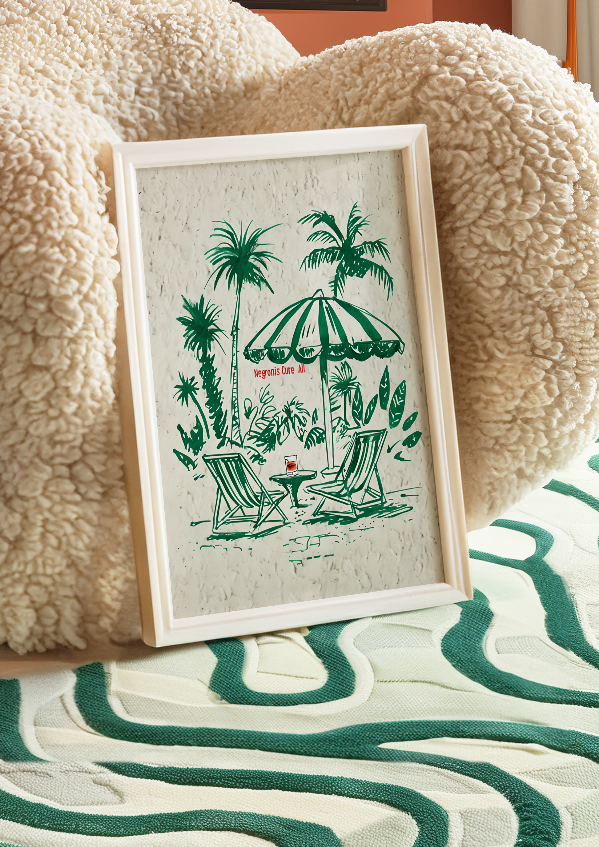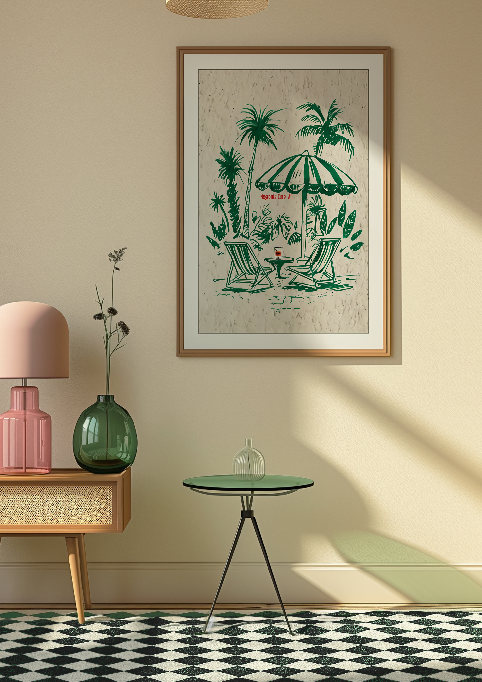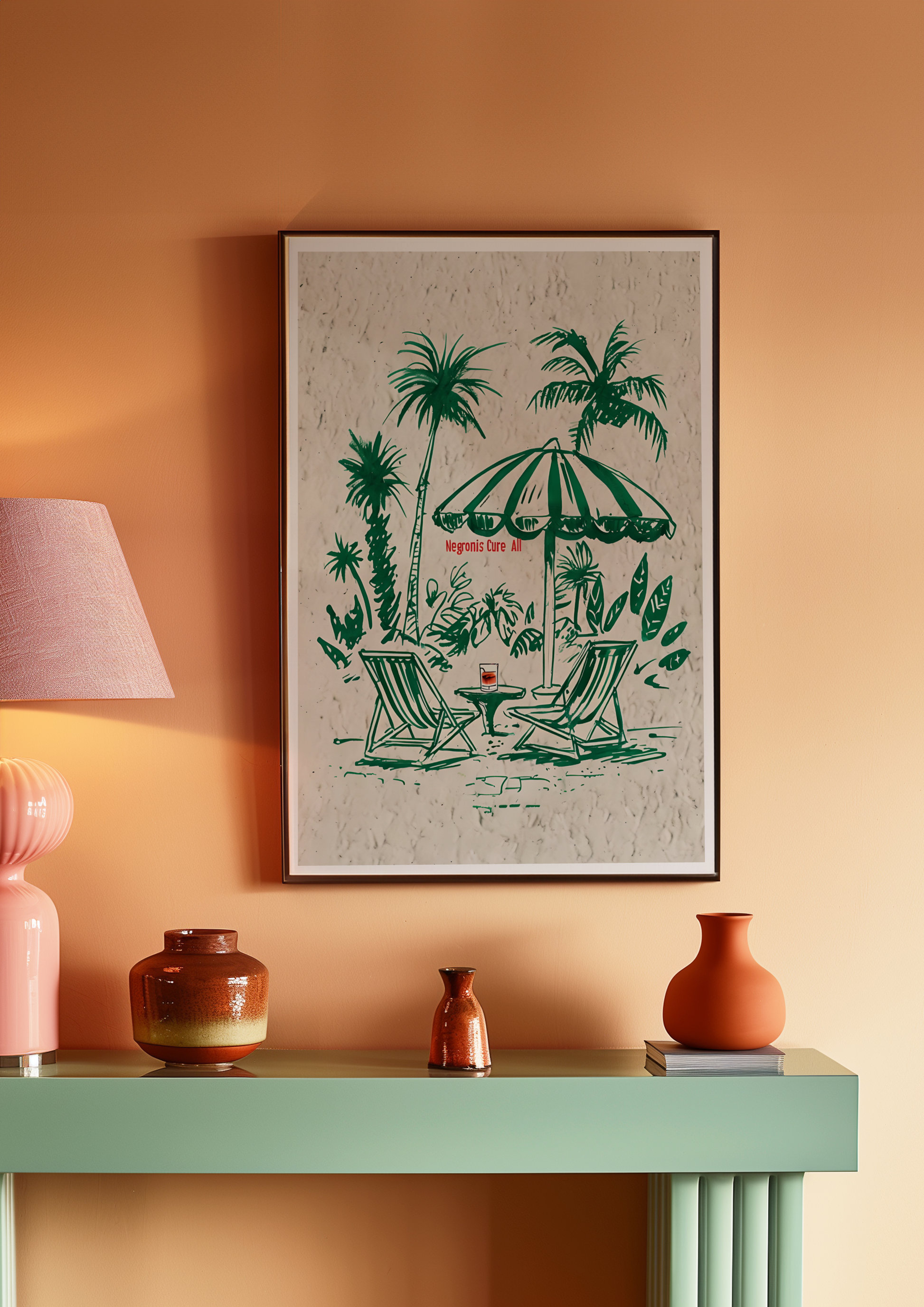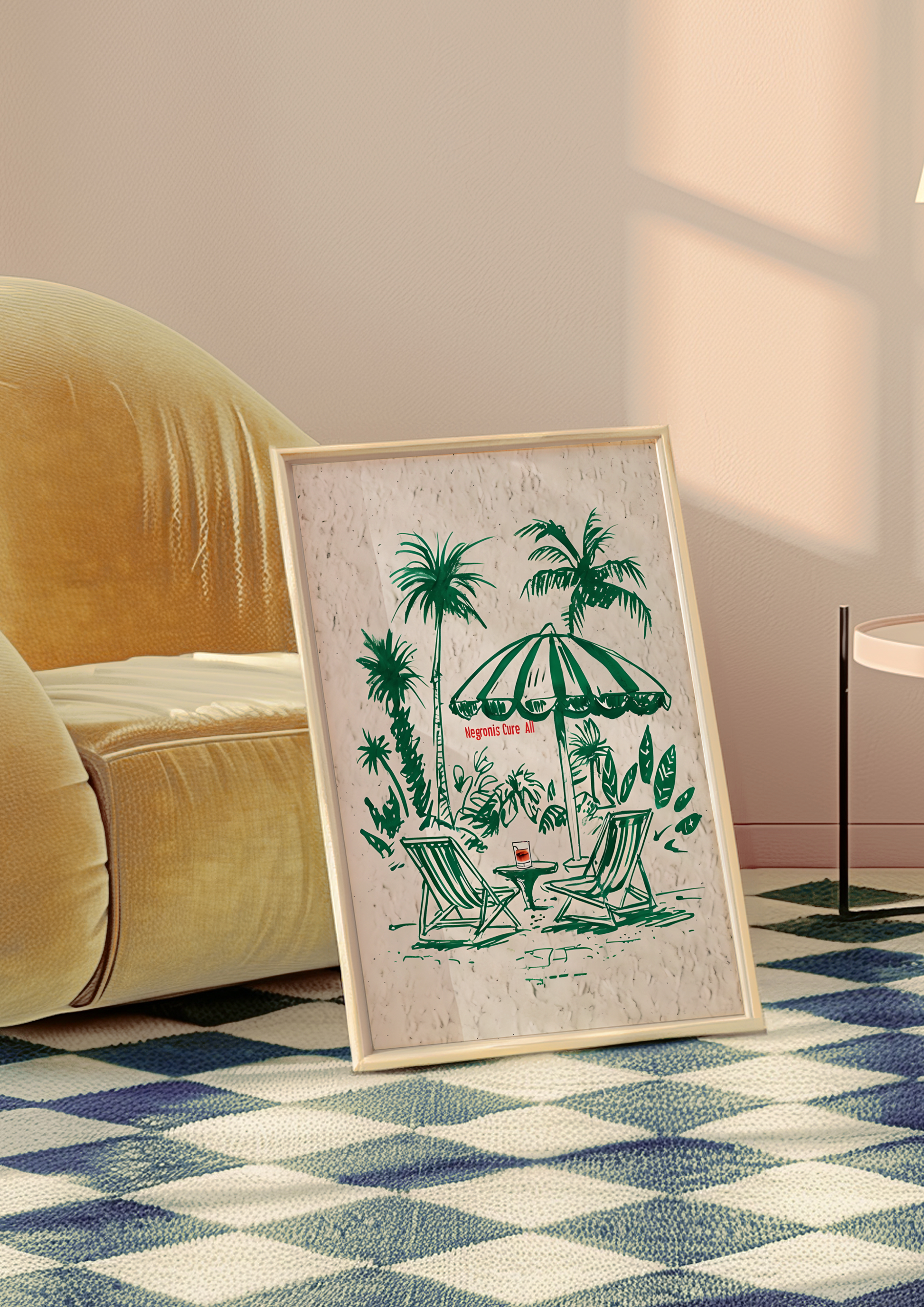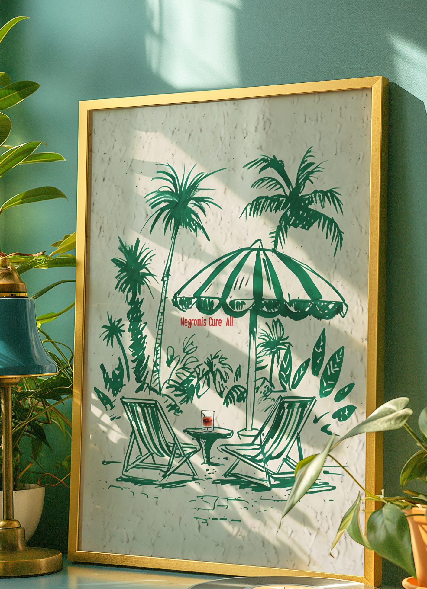 Crisp, stylish, our "Negronis Cure All" poster brings a refined twist to beachside relaxation. Featuring two beach chairs facing the sea with a striking red Negroni centered between them, the design uses a calming palette of green and white to evoke quiet sophistication with a modern edge. The simplicity lets the cocktail speak volumes — a timeless symbol of balance, bite, and leisure.
