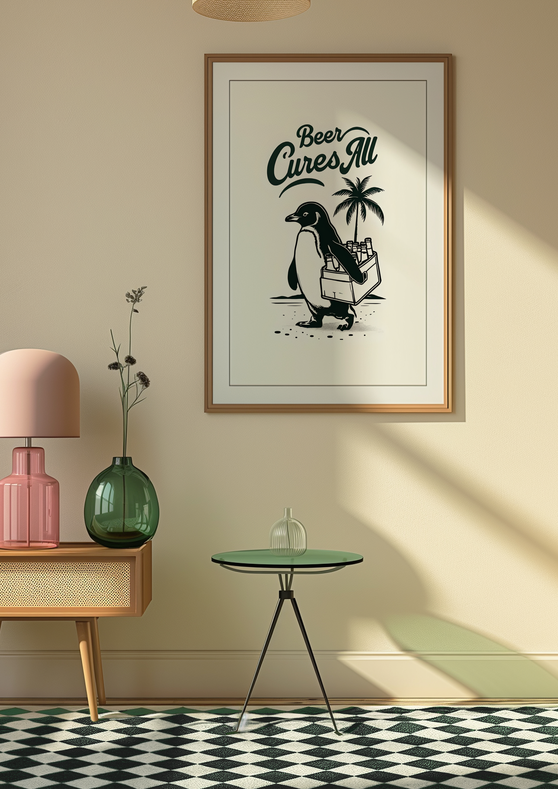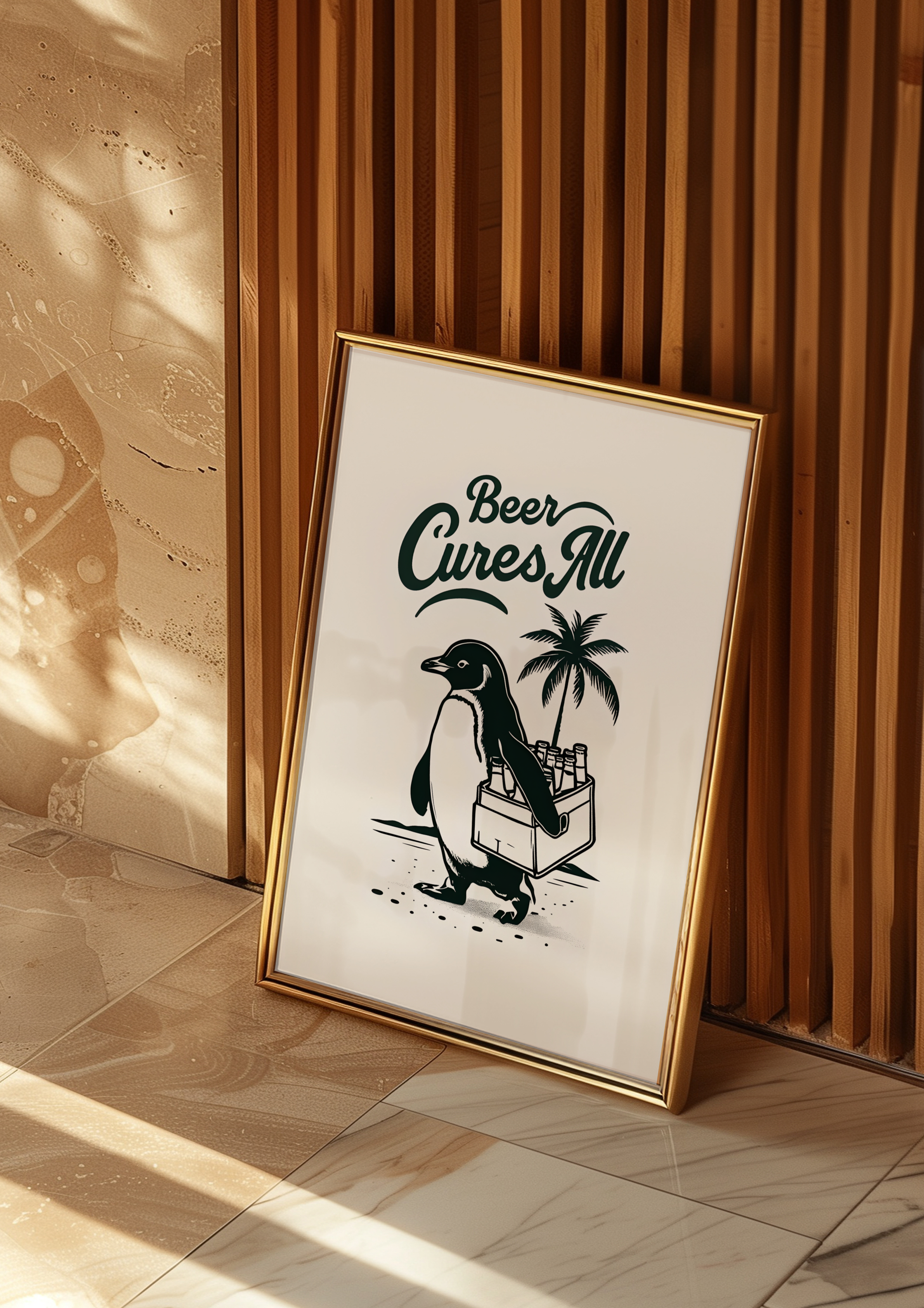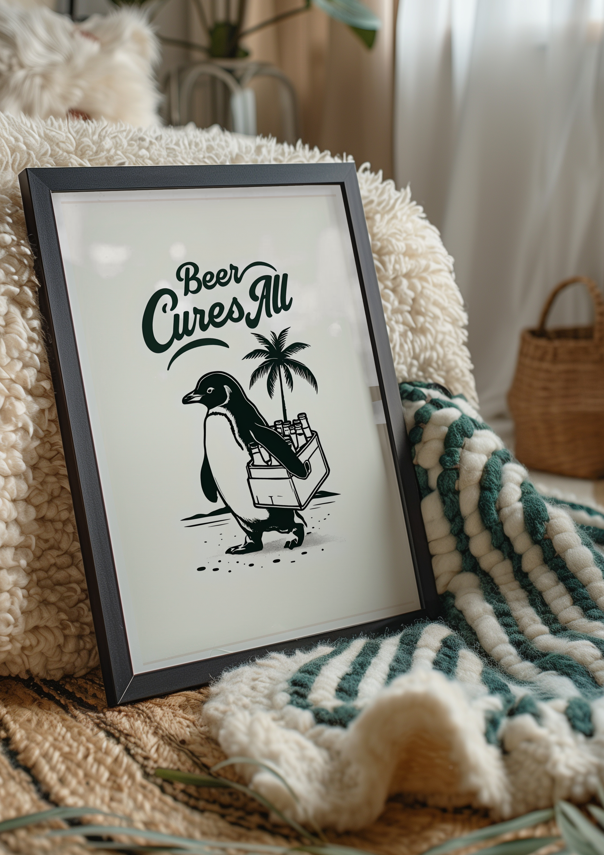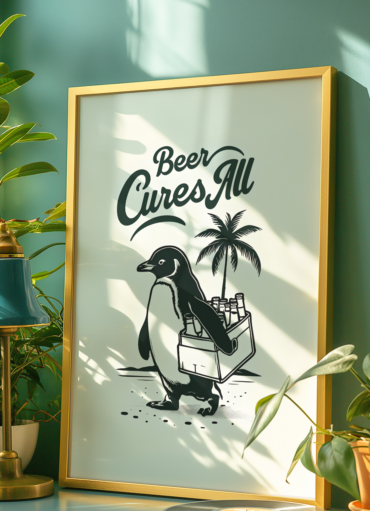 Chill vibes only. Our "Beer Cures All" poster features a cool, no-nonsense penguin proudly hauling a six-pack like it’s his life mission—and honestly, same. With icy style and frosty flair, this print proves that even in the coldest moments, a cold one makes everything better.