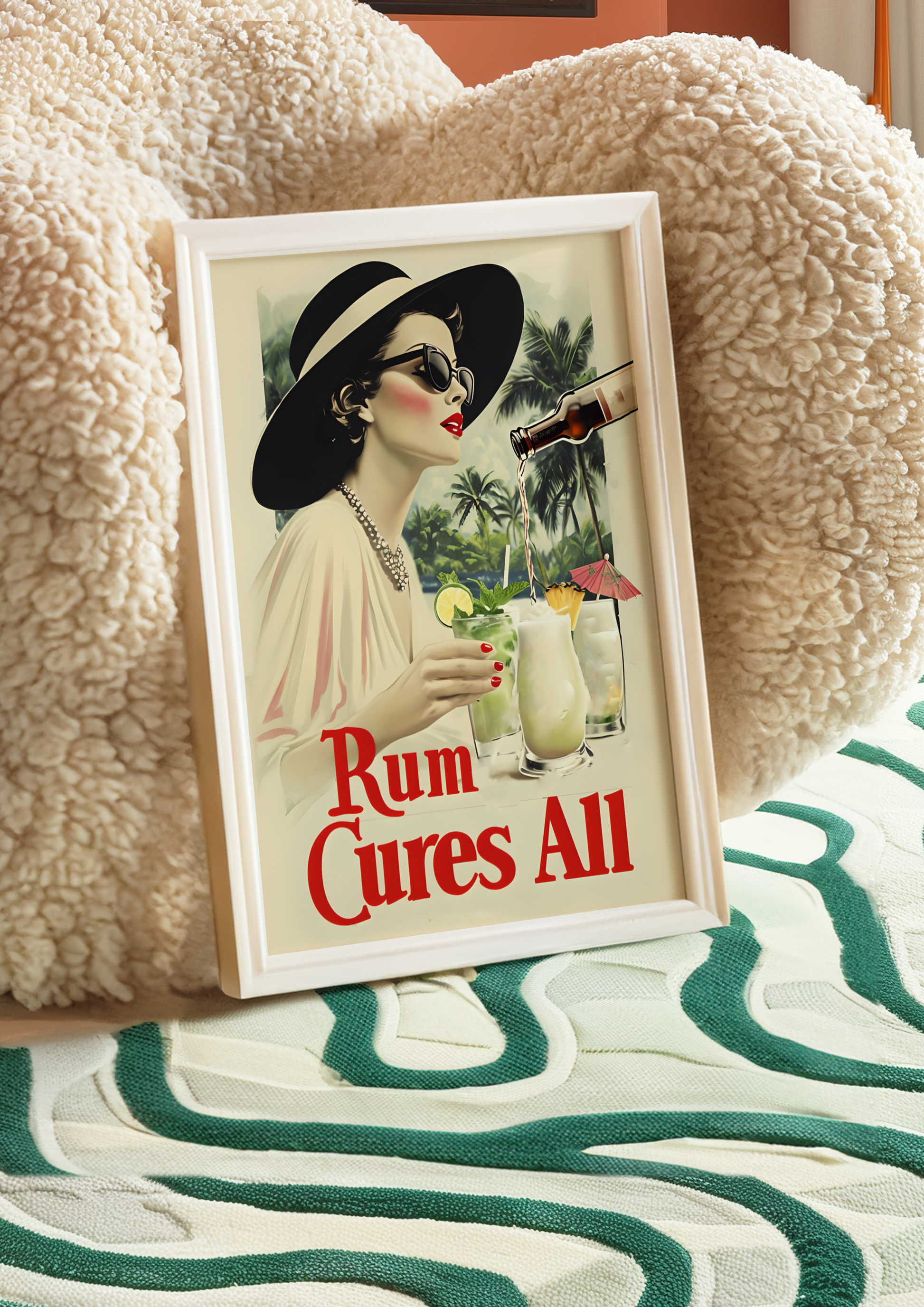 Chic, sun-soaked, our "Rum Cures All" poster captures a retro moment of pure indulgence. A stylish woman in oversized sunglasses and a wide-brimmed hat lounges in the sun as a splash of rum is poured into her waiting glass. With bold vintage colors and playful sophistication, this artwork radiates poolside glamour and laid-back luxury.