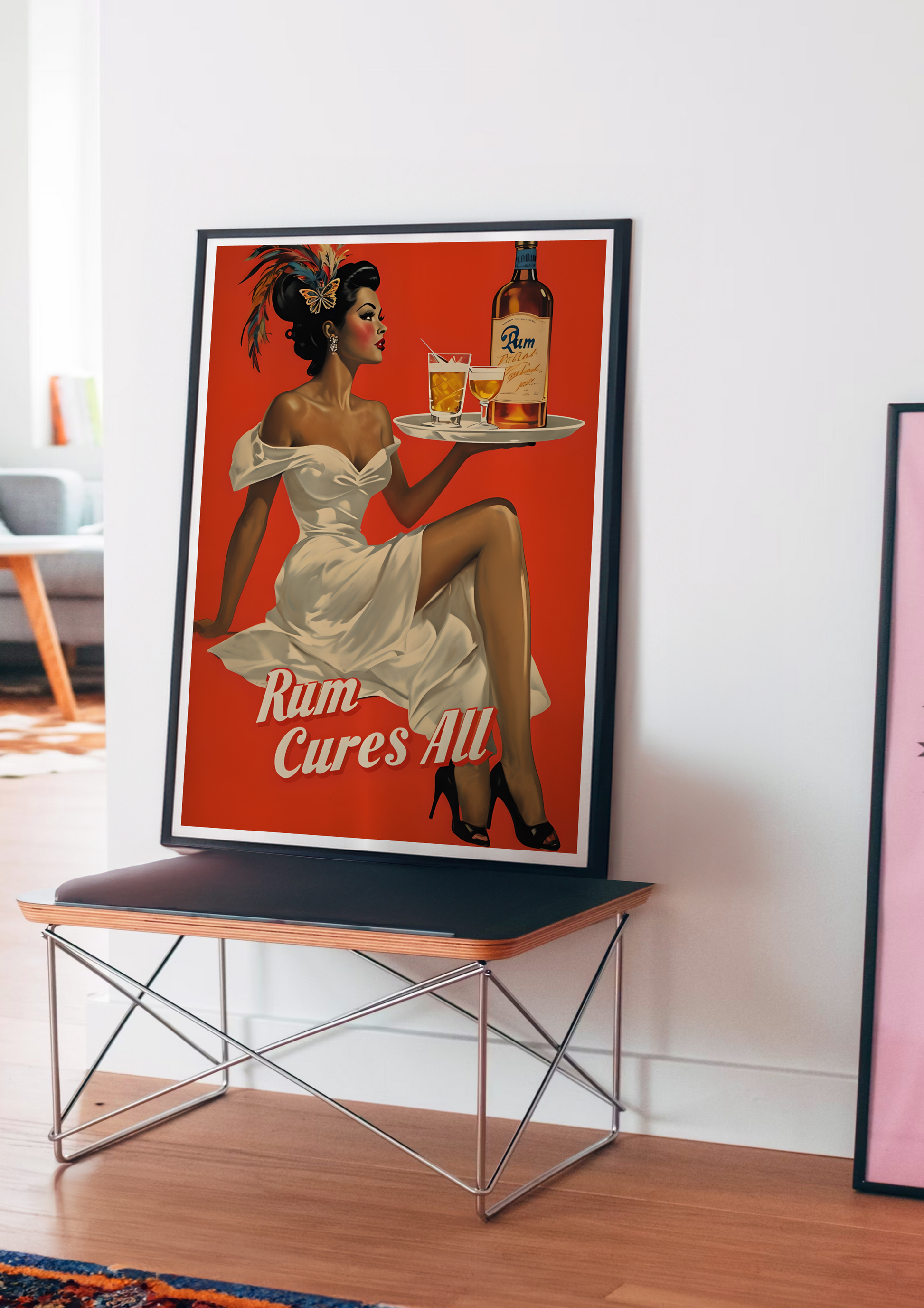 Elegant, exotic, and dripping with old-school charm, our "Rum Cures All" poster features a striking vintage beauty holding a tray with a bottle and glass of rum. With a feather in her hair, a knowing smile, and bold retro colors, this artwork channels golden-age cocktail culture with a tropical twist. It’s timeless sophistication served neat.