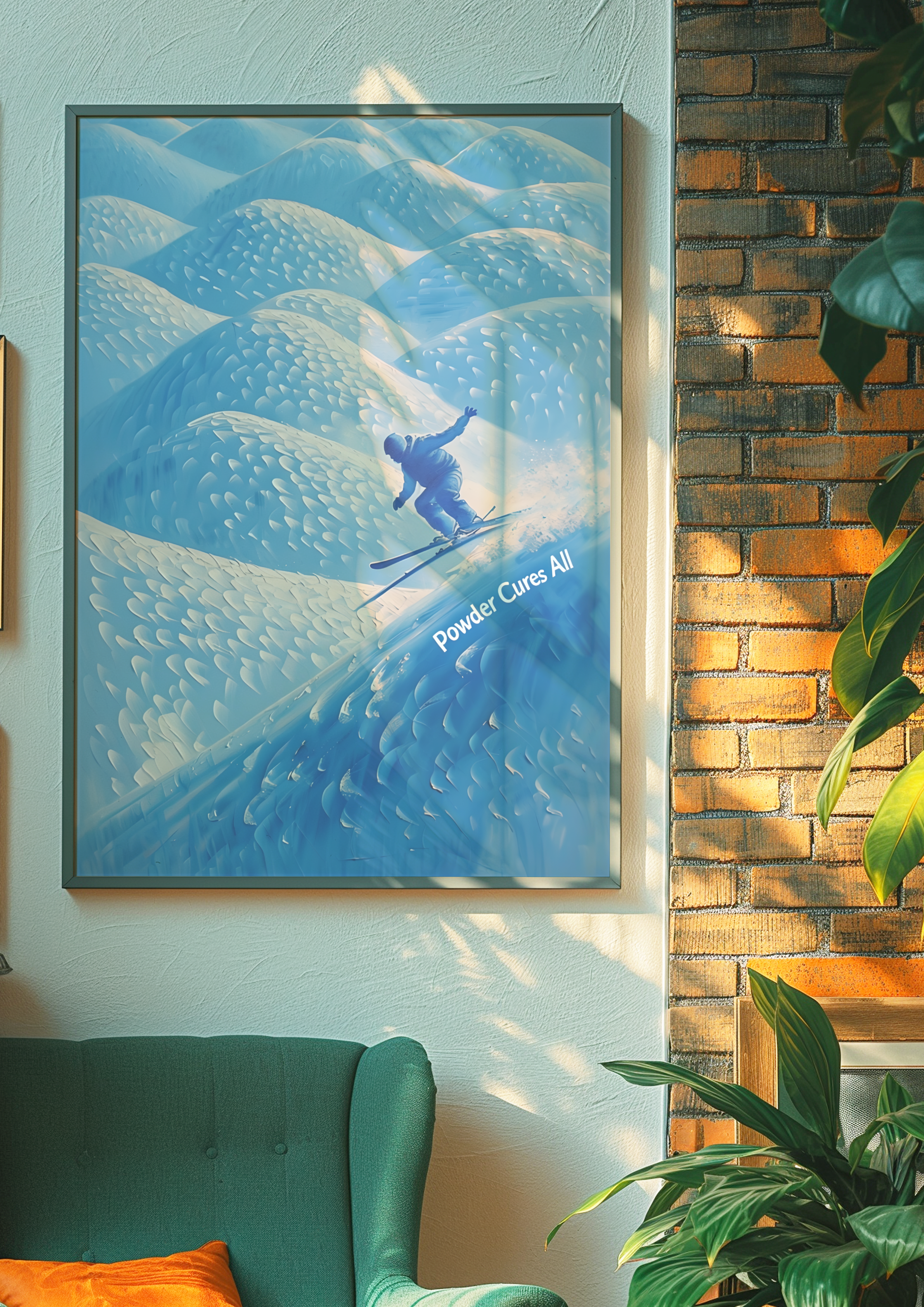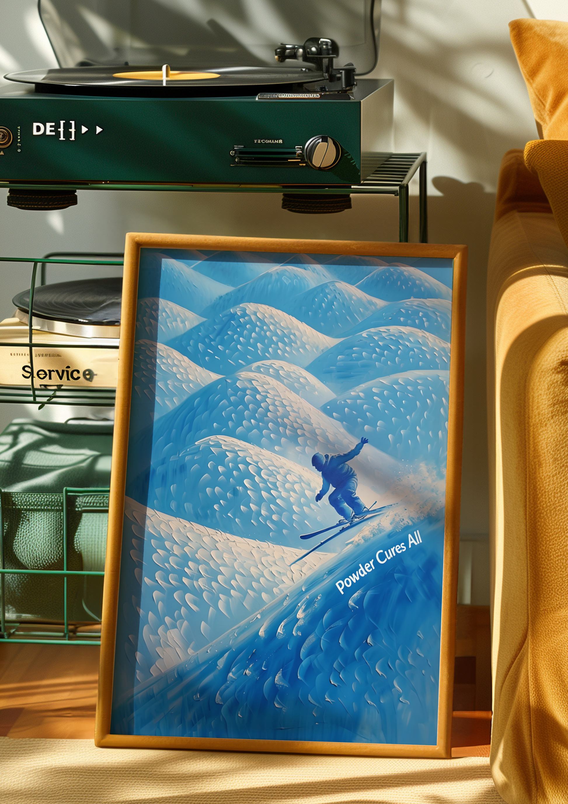 Fluid, serene, and full of alpine soul, our "Powder Cures All" poster captures a skier gracefully descending a snow-covered slope, rendered in rich, expressive brushstrokes. With soft hues, sweeping motion, and painterly texture, this artwork turns the thrill of skiing into a piece of visual poetry — a tribute to solitude, speed, and snowy freedom.