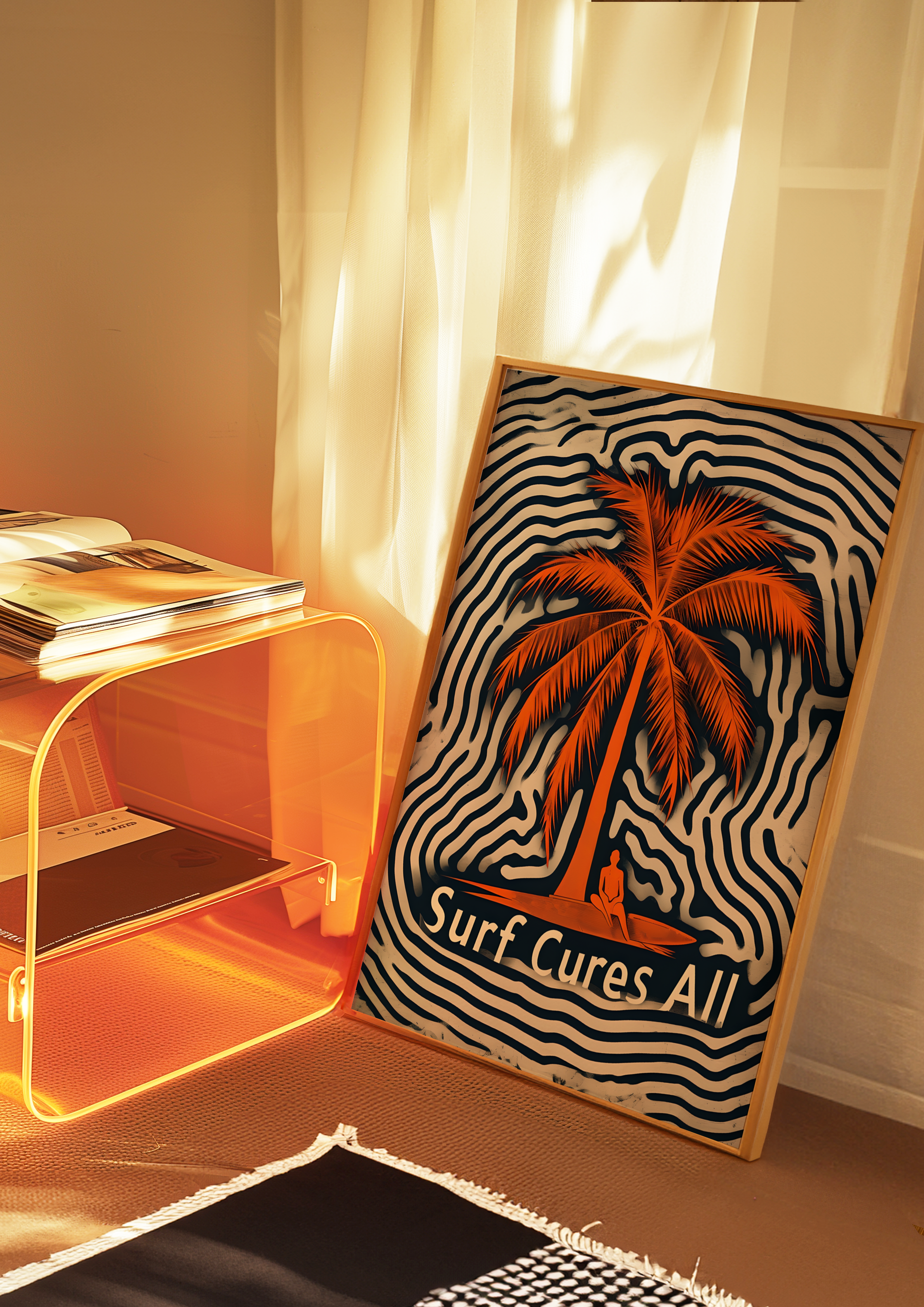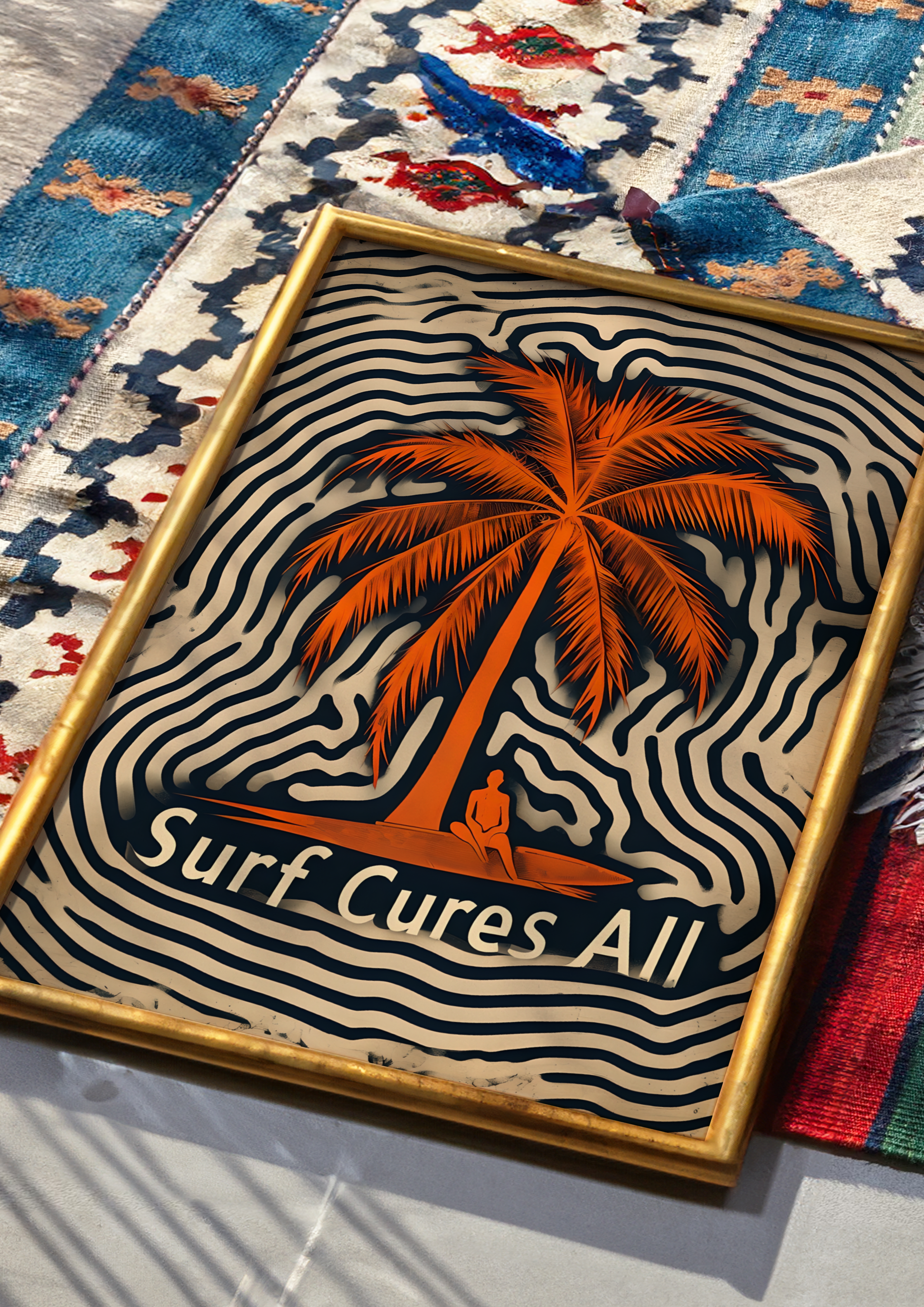 Peaceful, grounded, and endlessly free — our "Surf Cures All" poster captures the quiet power of stillness after the ride. A lone surfer sits on a tiny island, board by their side, gazing out at the open sea under a calm sky. With soft tropical tones, minimal design, and a reflective mood, this piece is a tribute to the ocean’s ability to reset the soul.