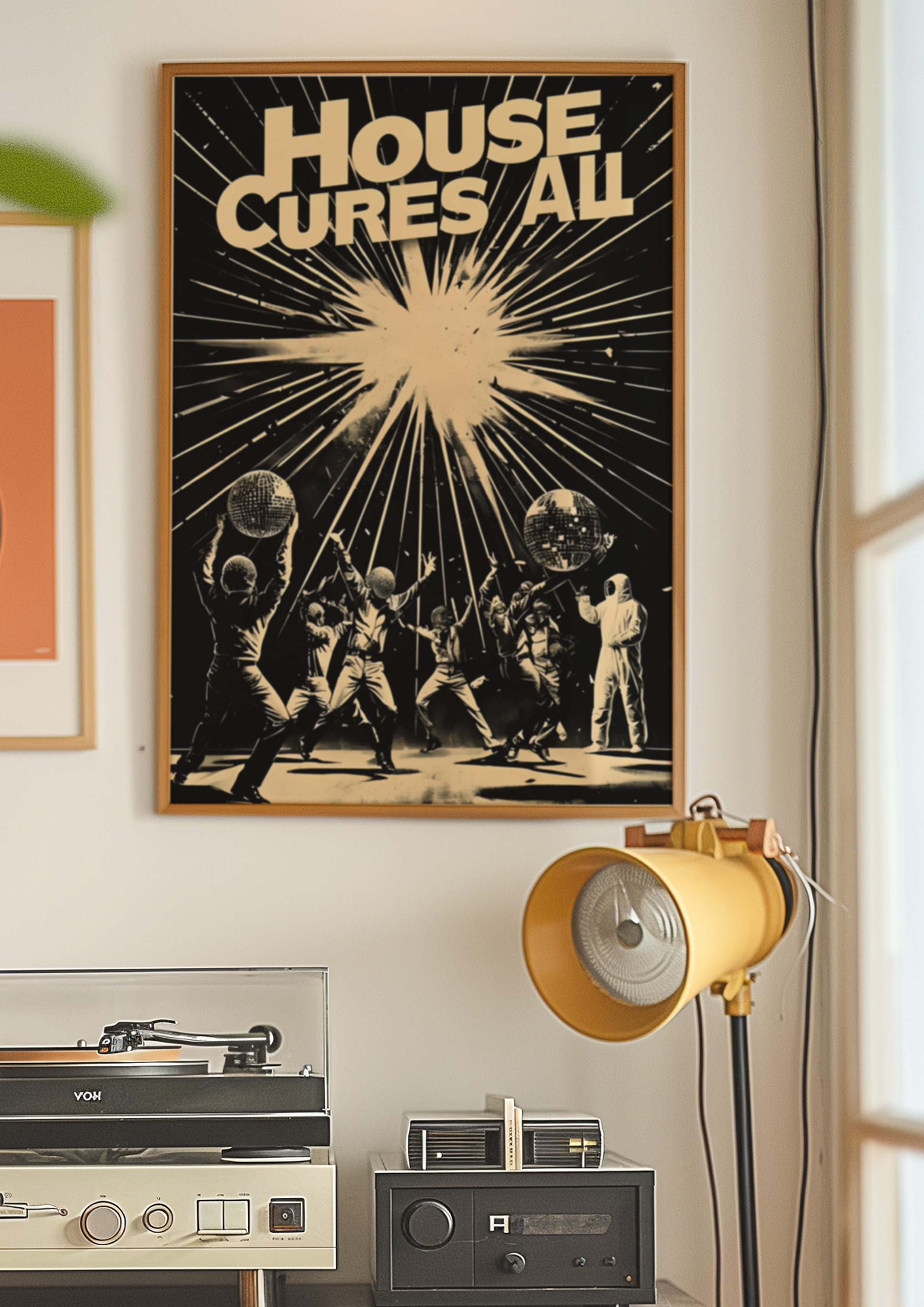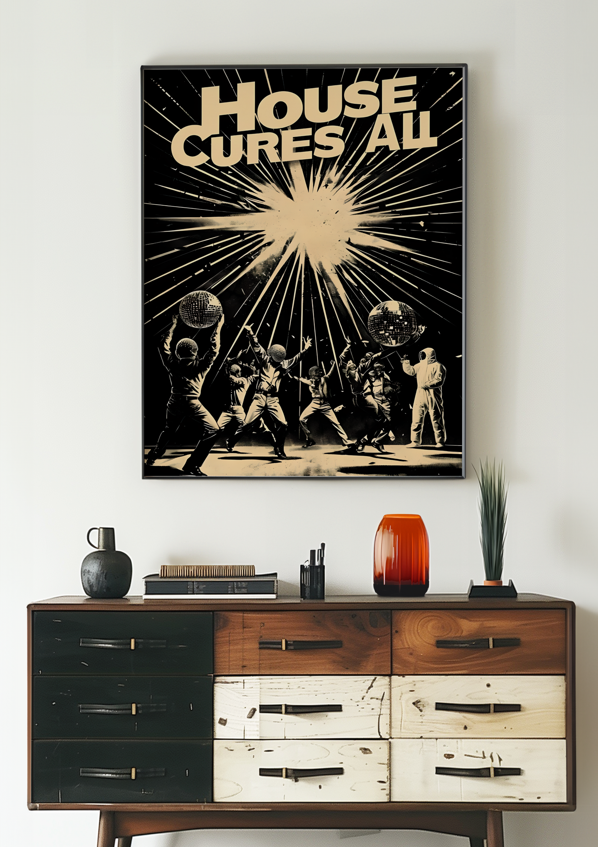 Step into the dancefloor of the surreal with our "House Cures All" poster — a moody, post-apocalyptic party where hazmat-suited dancers move to the beat with shimmering disco balls for heads. Set against a dark, atmospheric backdrop, this artwork fuses chaos with groove, safety with style, and danger with dance. It’s house music at the end of the world — and the party never stops.