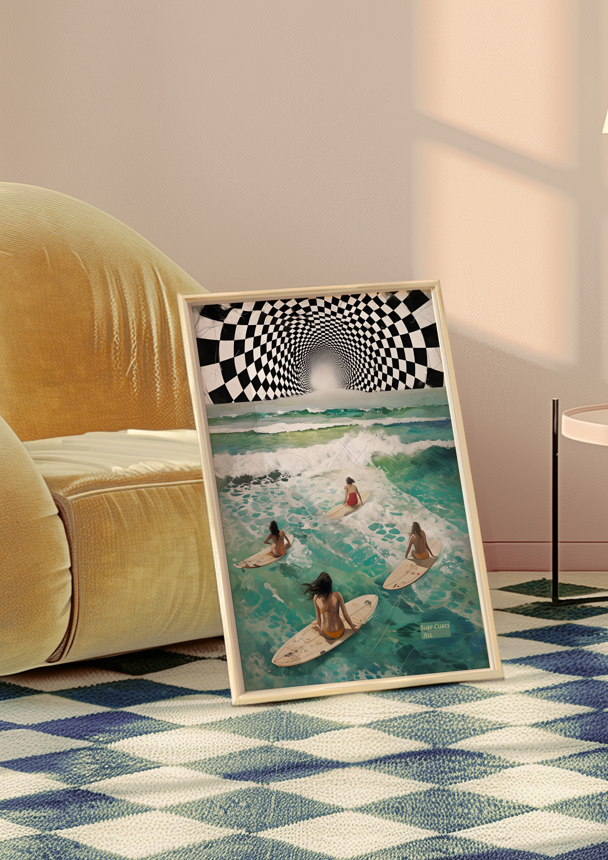 Ride the line between serenity and the surreal with our "Surf Cures All" poster — a striking image of a group of girls sitting on their surfboards, calmly waiting for a wave as a mysterious black hole churns on the horizon. With glowing water, dreamlike light, and a touch of cosmic wonder, this piece captures the quiet power of sisterhood, stillness, and surrendering to the unknown.