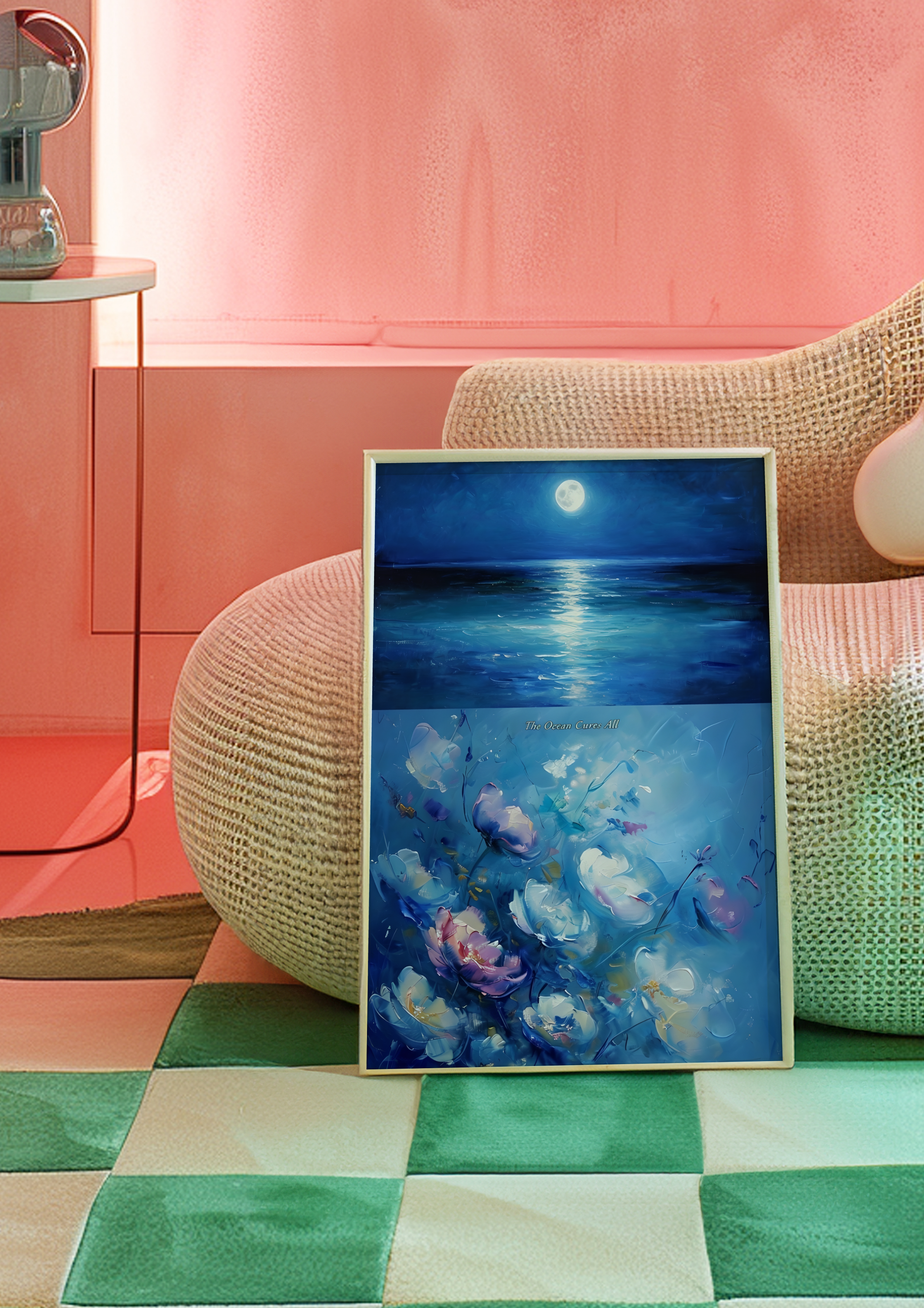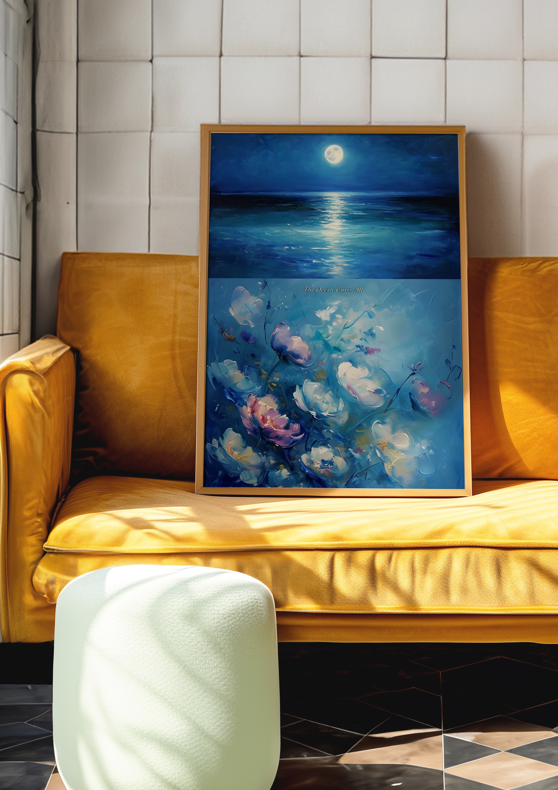 Serene, poetic, and gently surreal — our "The Ocean Cures All" poster features a moody night ocean painted in deep blues and silvery moonlight, with soft, dreamlike flowers blooming at the sea’s edge. The contrast of water and petals evokes a quiet harmony — a reminder that even in darkness, beauty grows and the ocean whispers its healing song.