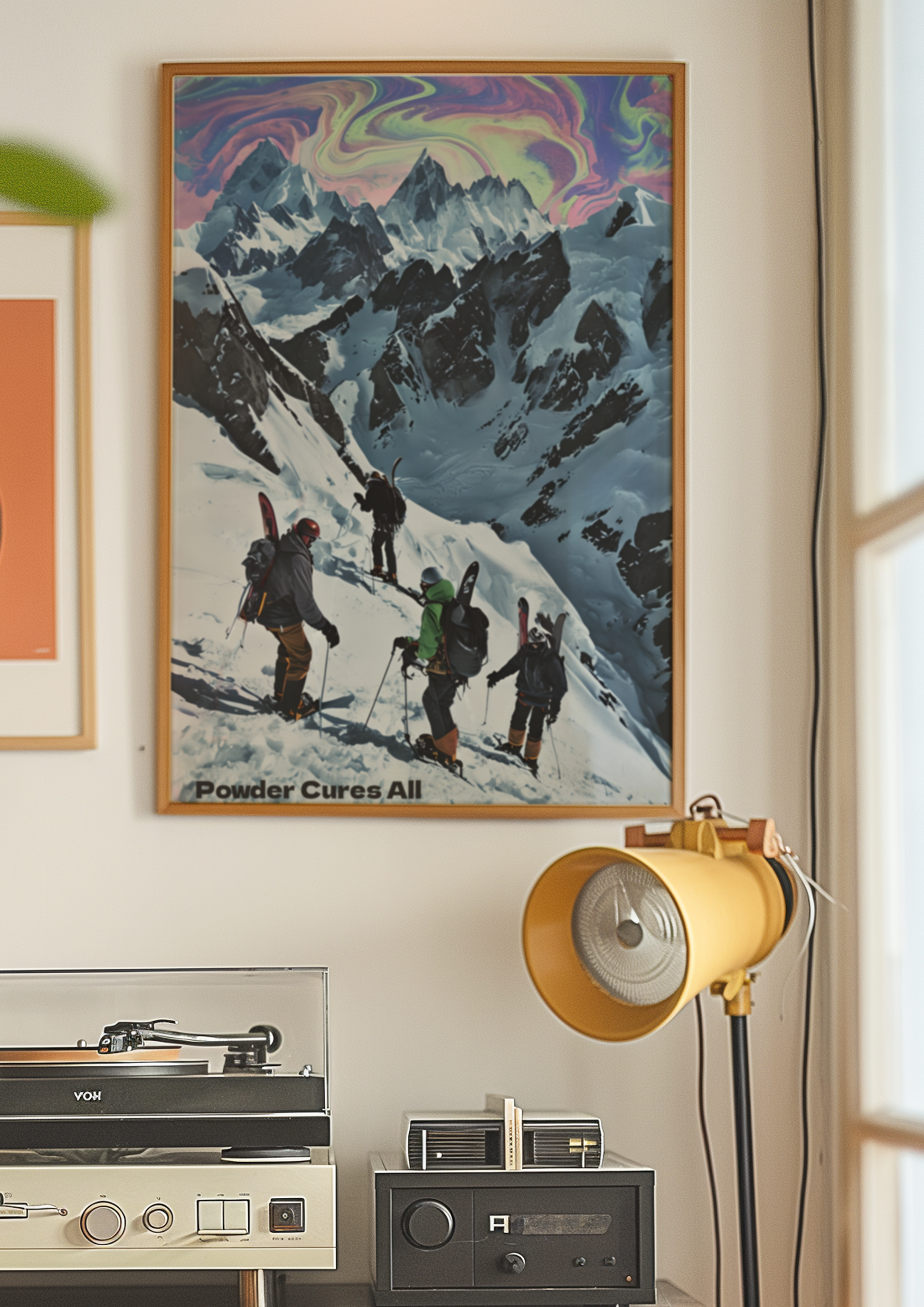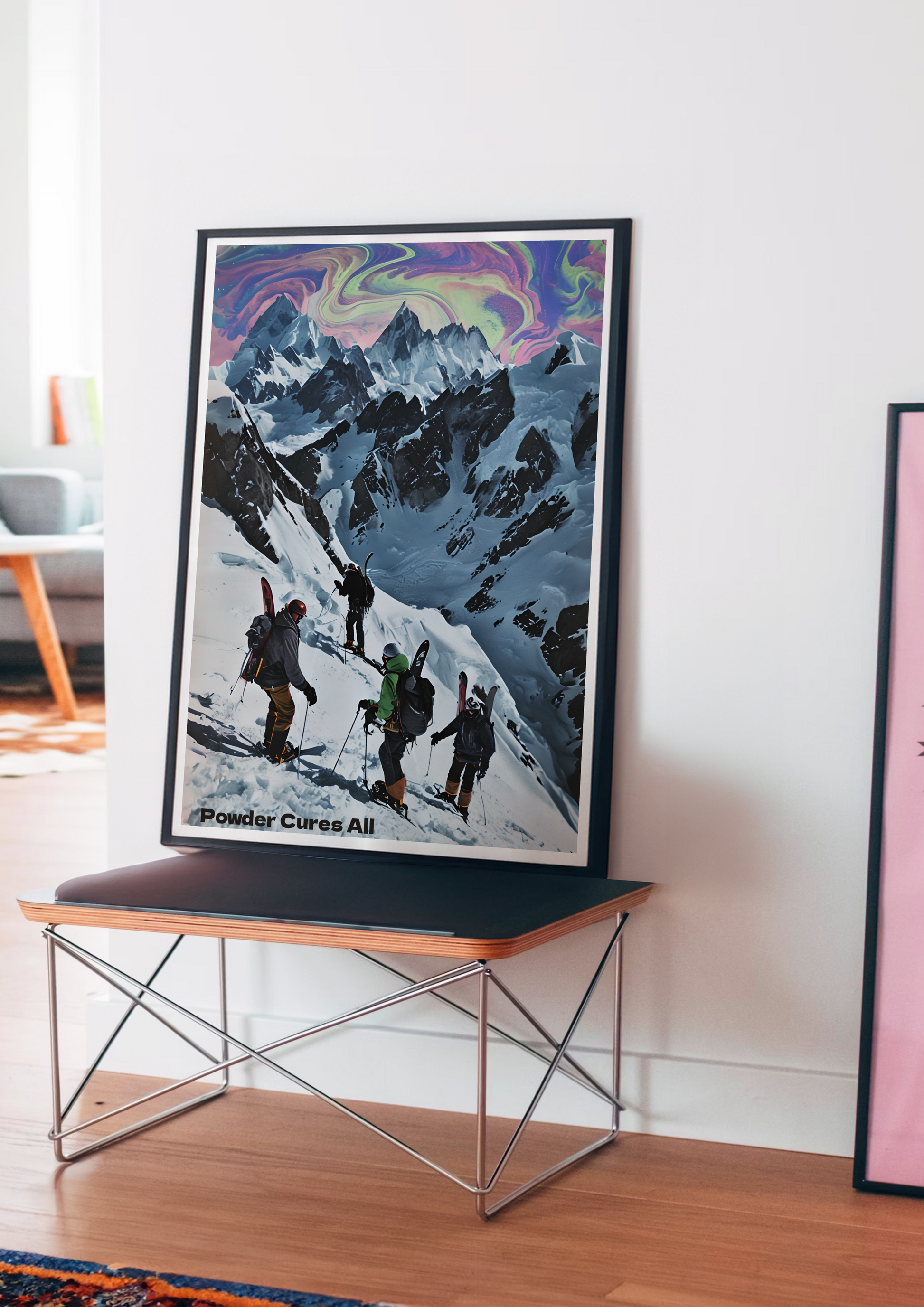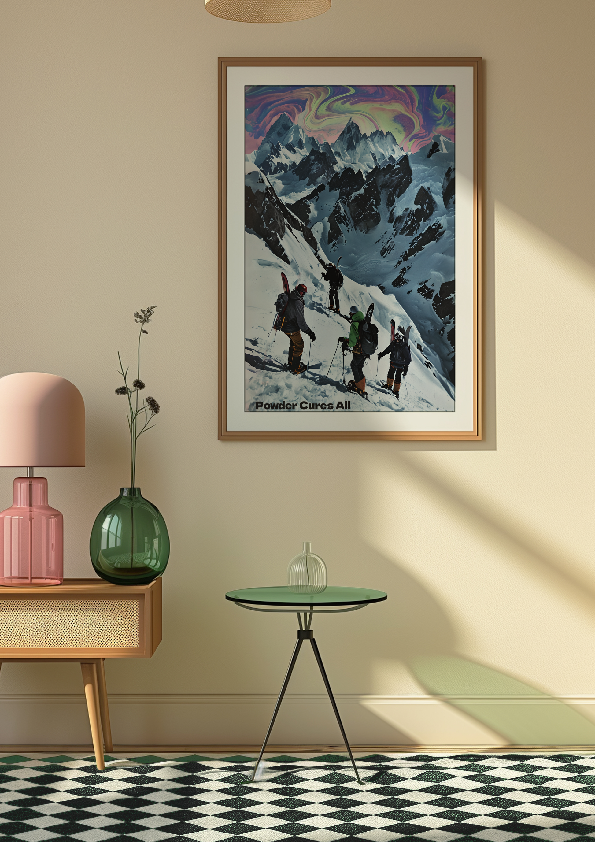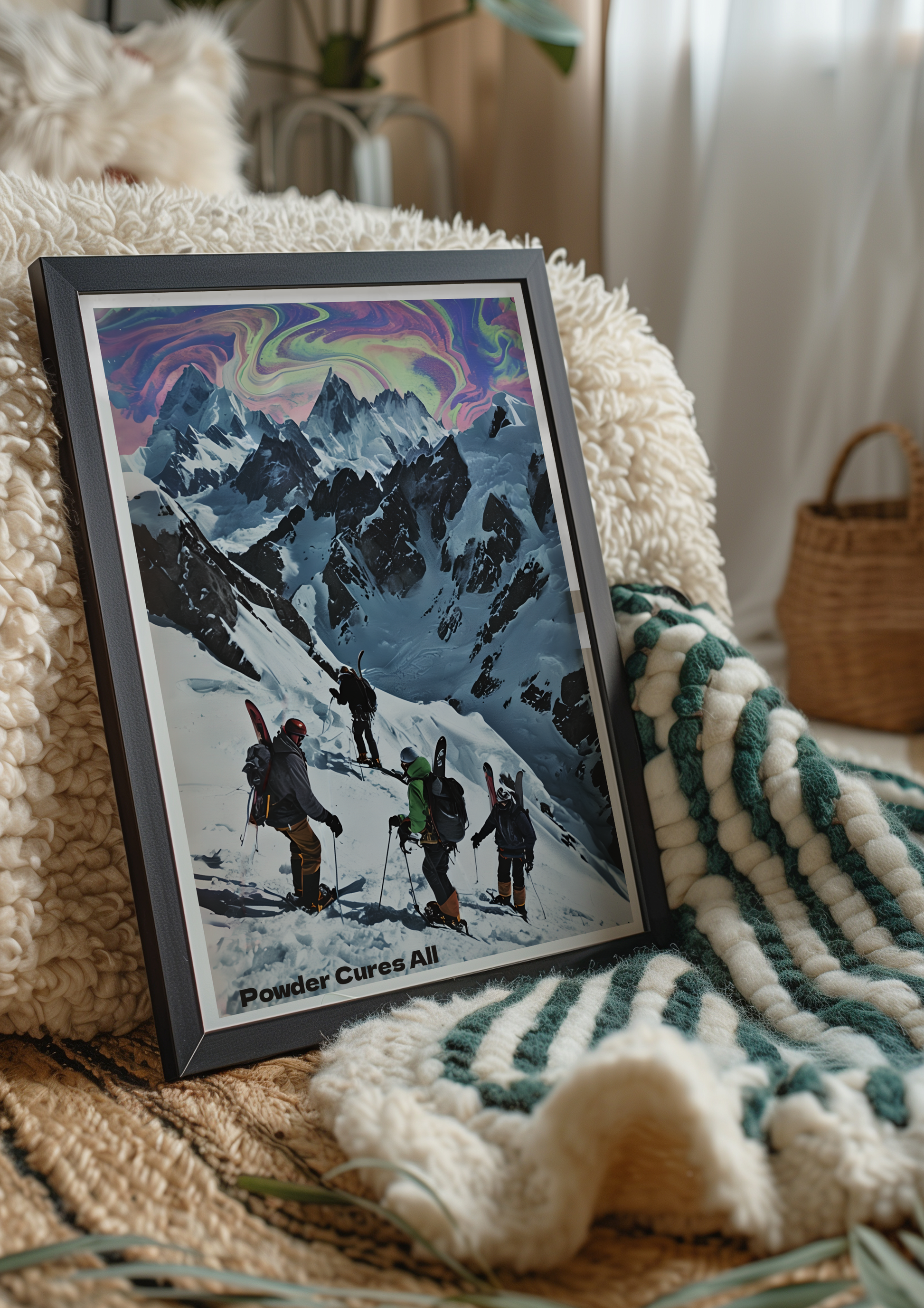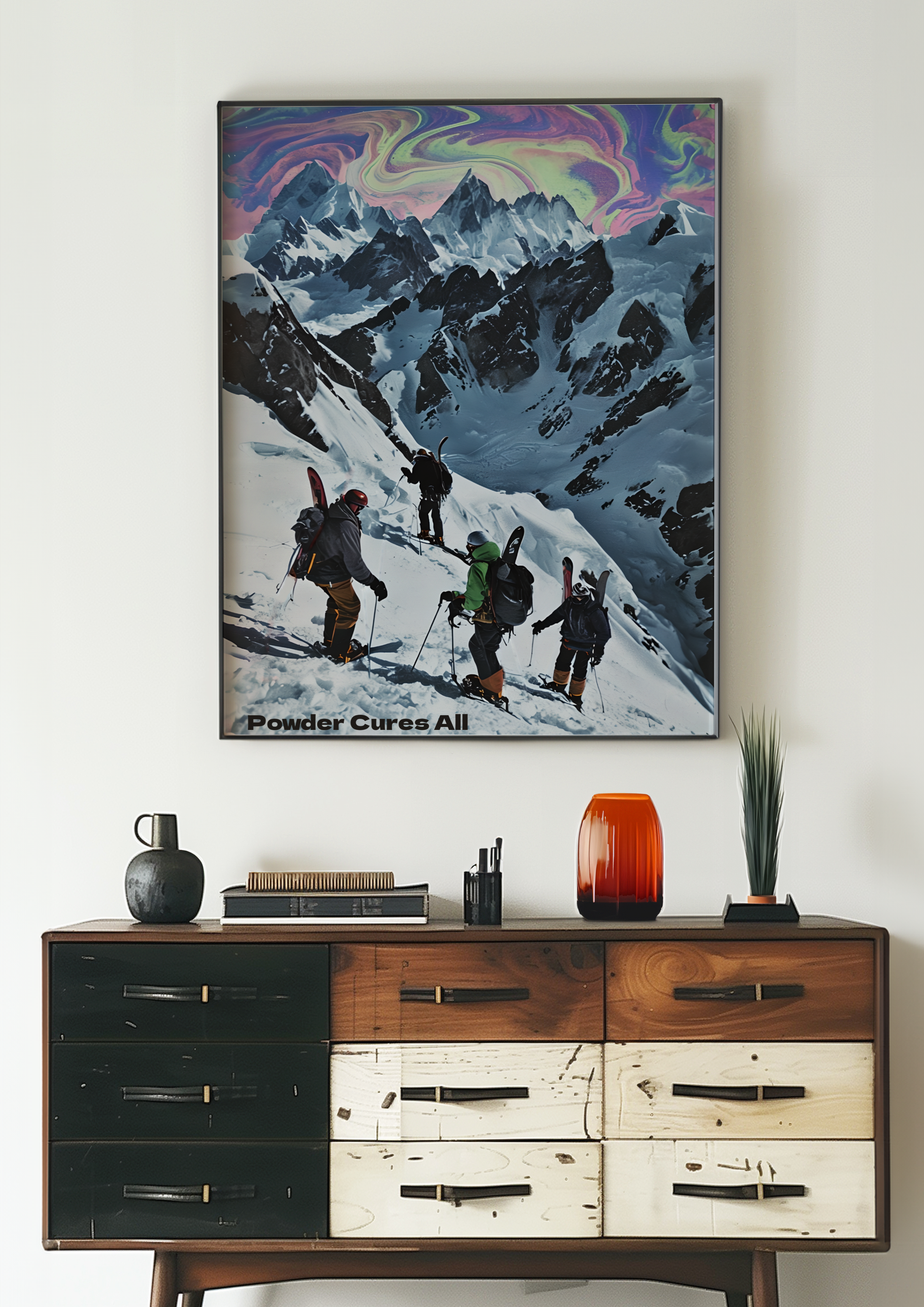 Majestic, mystical, and filled with purpose — our "Powder Cures All" poster captures a group of adventurers hiking through deep snow, skis and snowboards strapped to their backs, as they trek toward untouched peaks. Above them, a swirling burst of color dances across the sky, hinting at magic in the mountains and the promise of fresh lines just beyond the ridge.