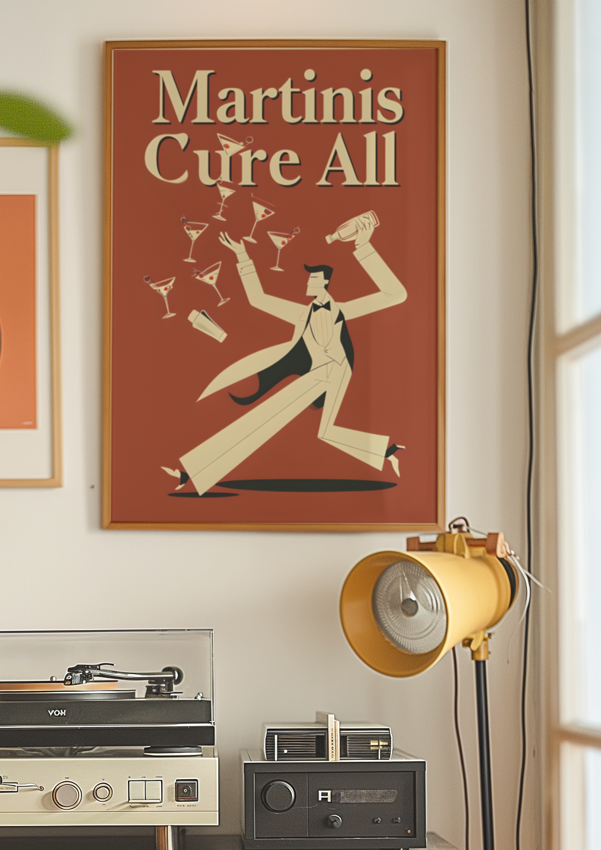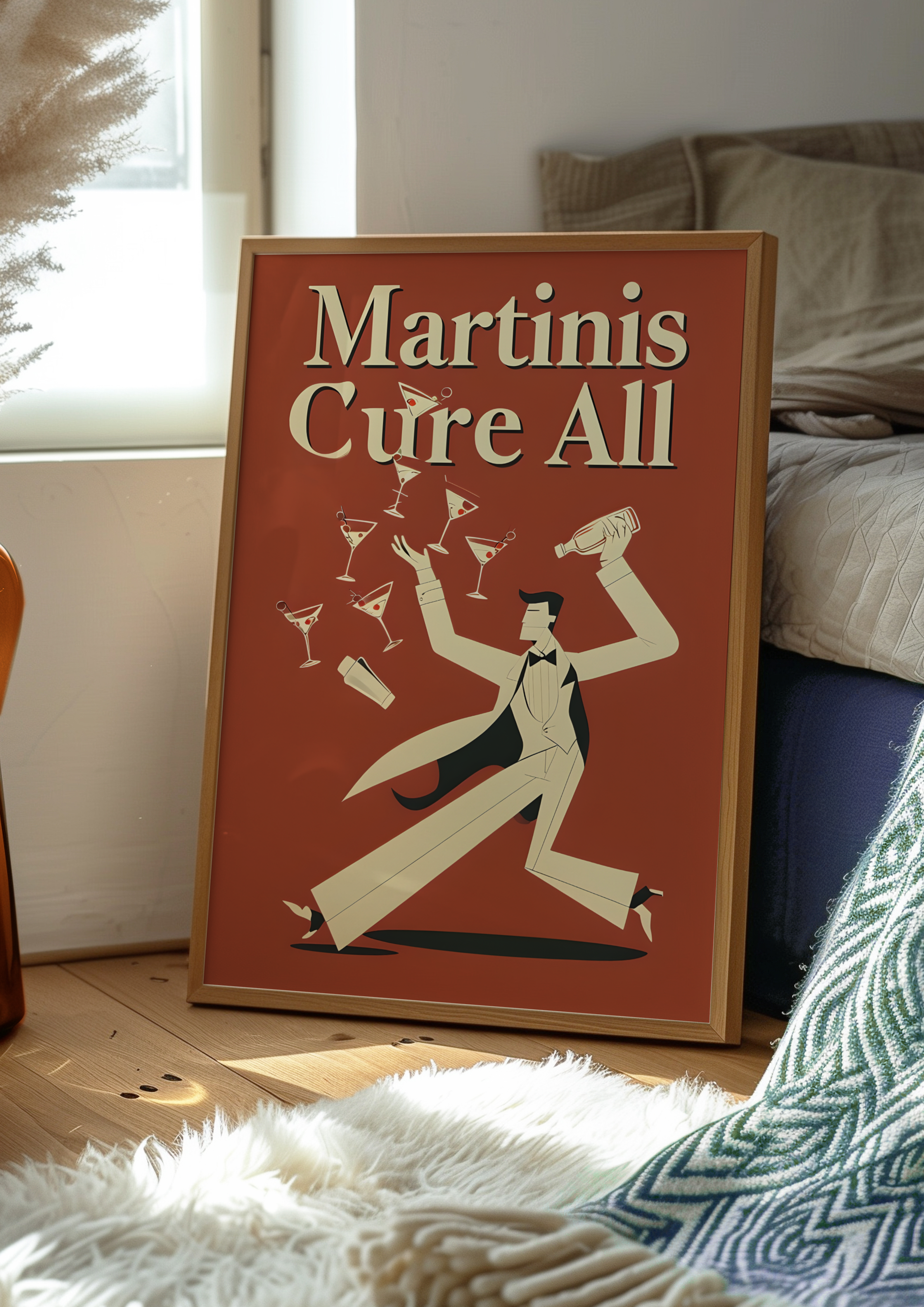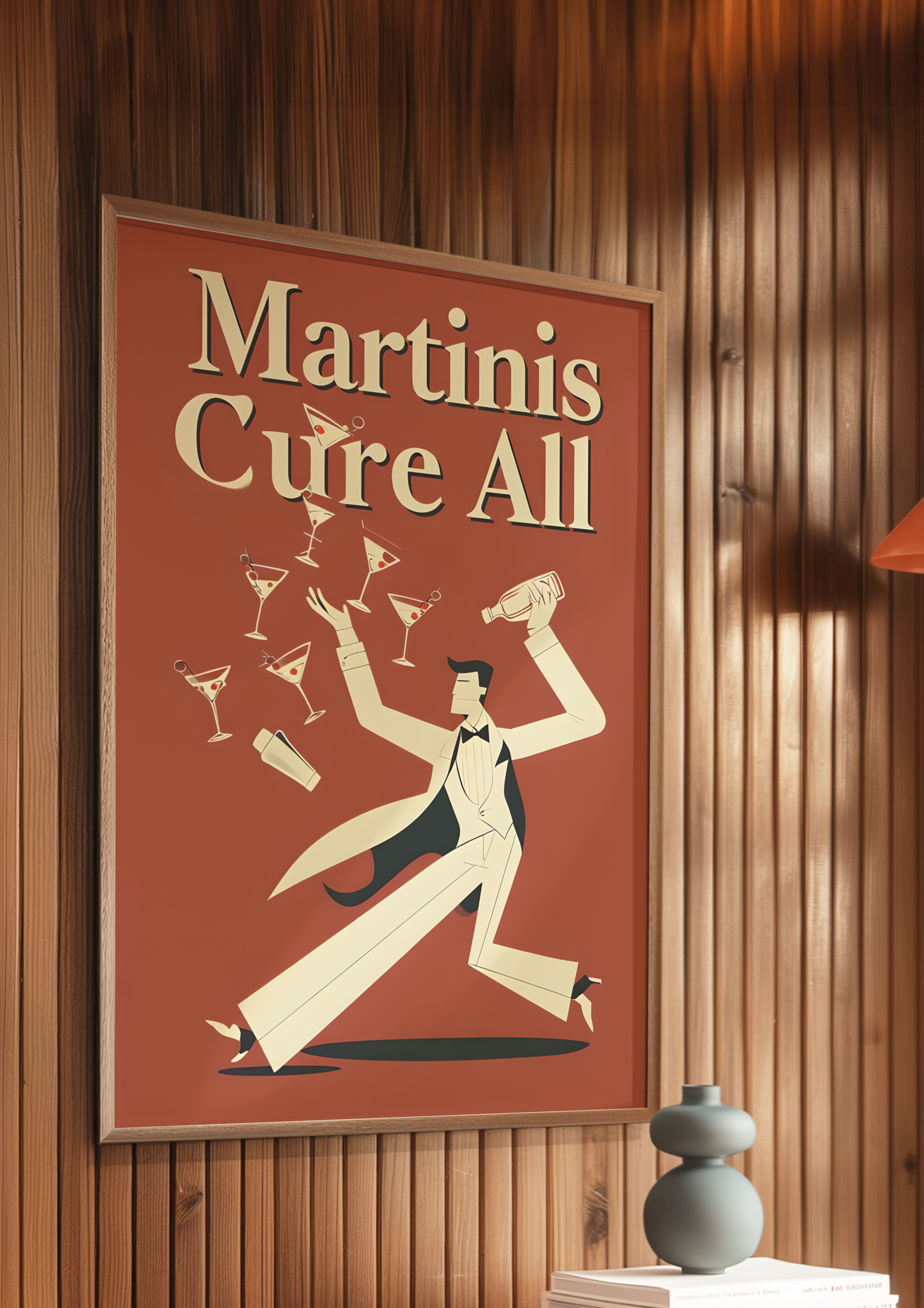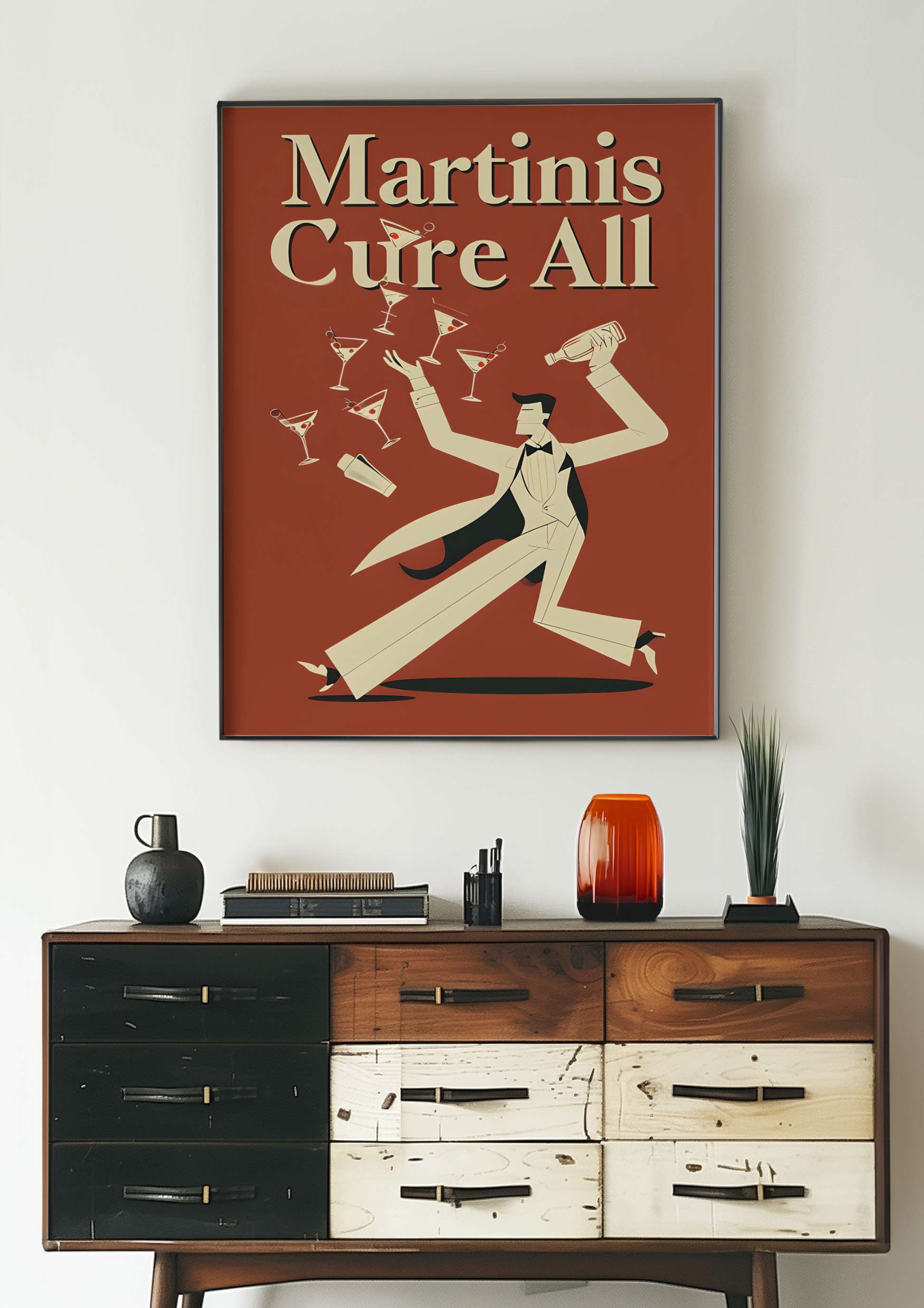 Add a splash of fun and flair to your space with our "Martinis Cure All" poster — featuring a sharply dressed waiter mid-performance, juggling martinis with the grace of a pro and the chaos of happy hour. With clean lines, bold shapes, and a dash of retro charm, this design captures the playful spirit of cocktail culture with a wink.