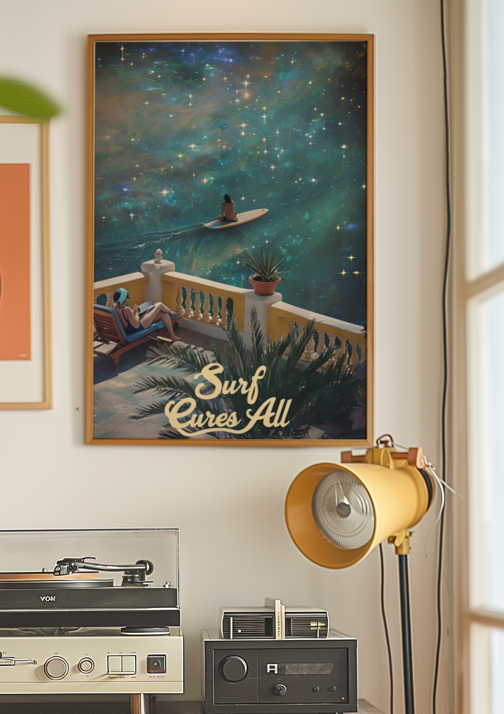 Otherworldly, dreamy, and totally transportive, our "Surf Cures All" poster flips reality on its head. A woman lounges in cosmic calm, gazing out as a lone surfer rides a swirling galactic wave through the stars. With surreal details, vibrant colors, and a blend of serenity and spectacle, this artwork captures the idea that surf isn’t just a sport — it’s a mindset, no matter where you are in the universe.