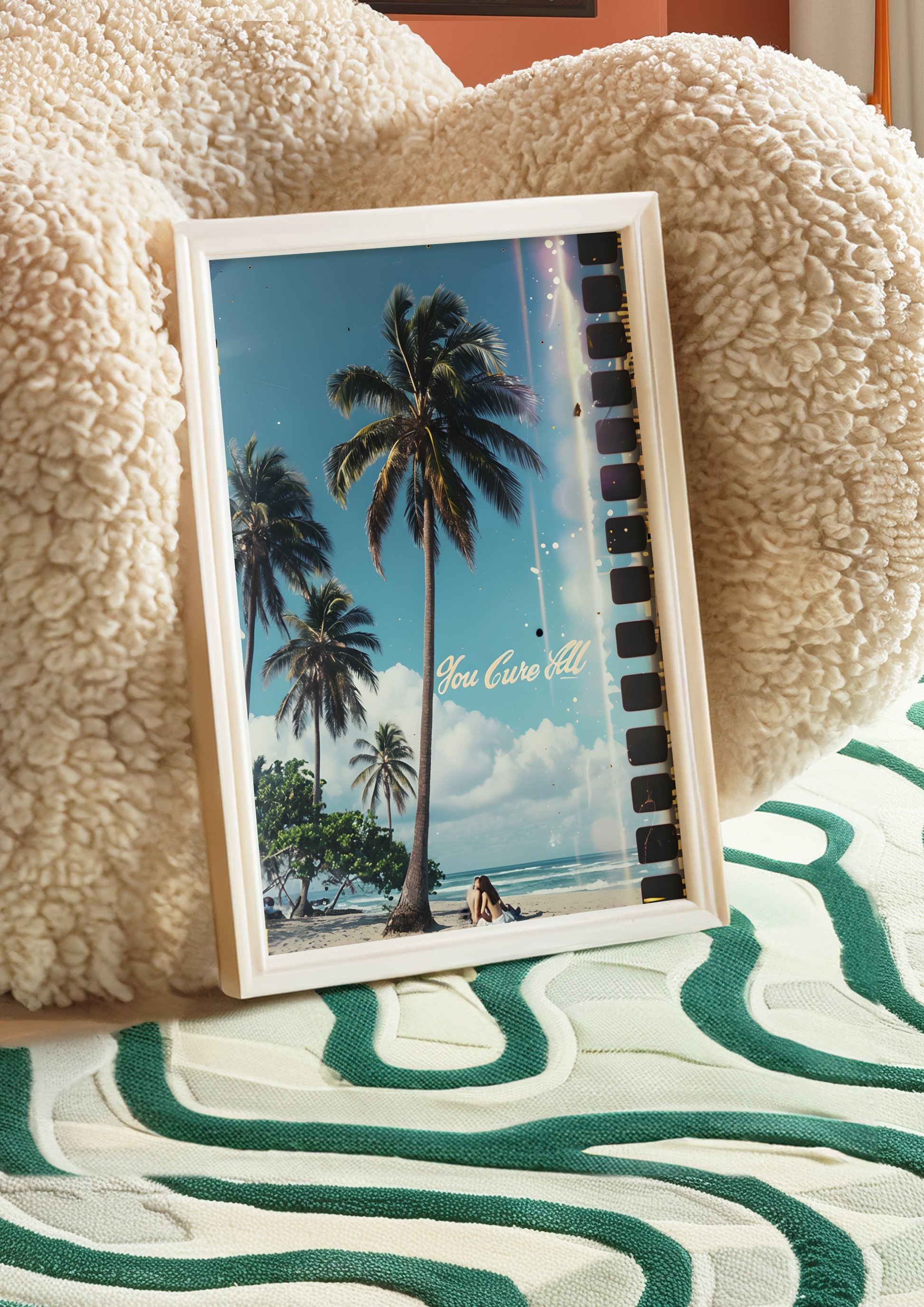 Peaceful, warm, and full of quiet magic — our "You Cure All" poster captures a couple sitting side by side beneath a swaying palm tree, watching the sun melt into the sea. With soft tropical tones, a gentle breeze, and silhouettes wrapped in golden light, this artwork is a love letter to stillness, presence, and the kind of connection that needs no words.